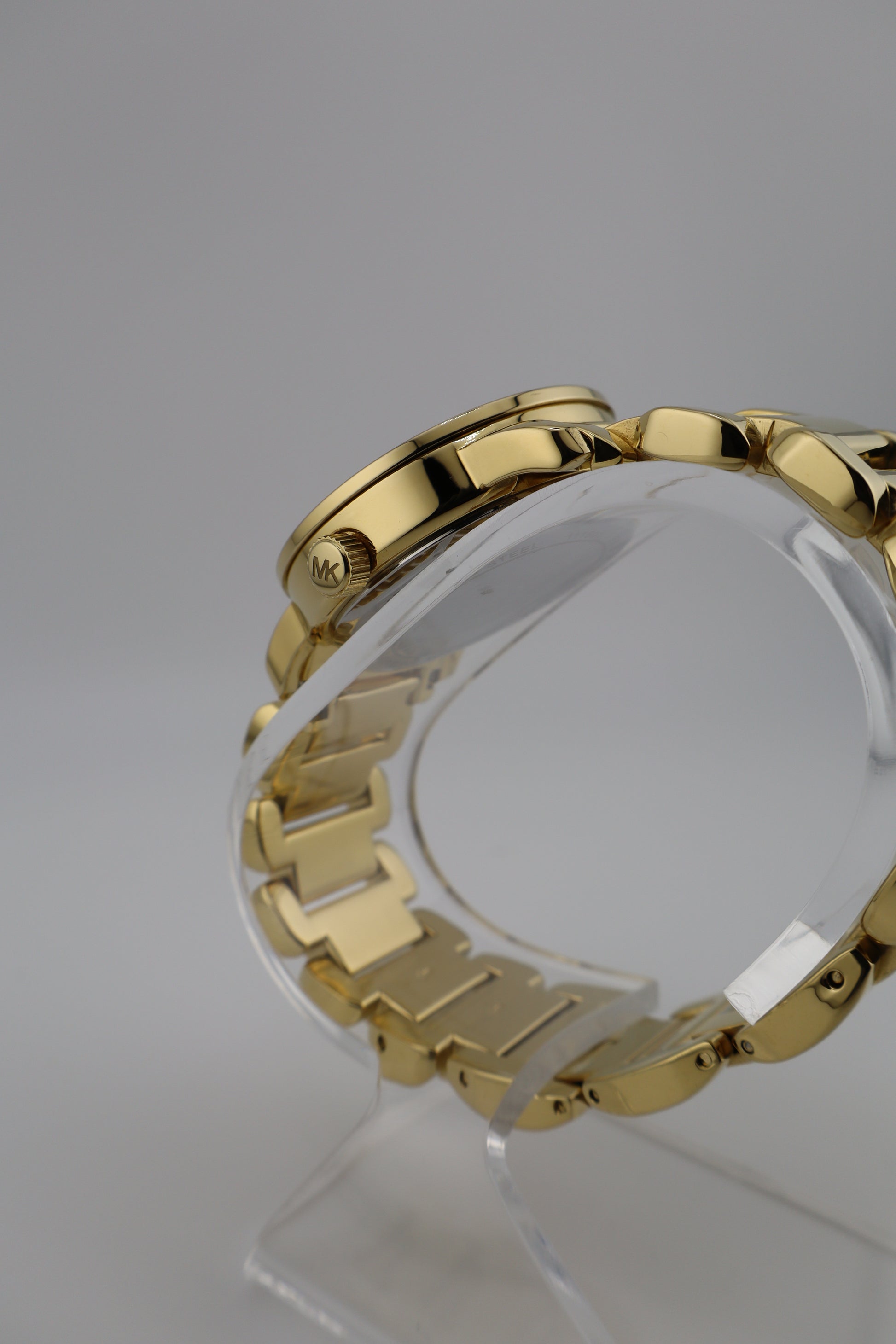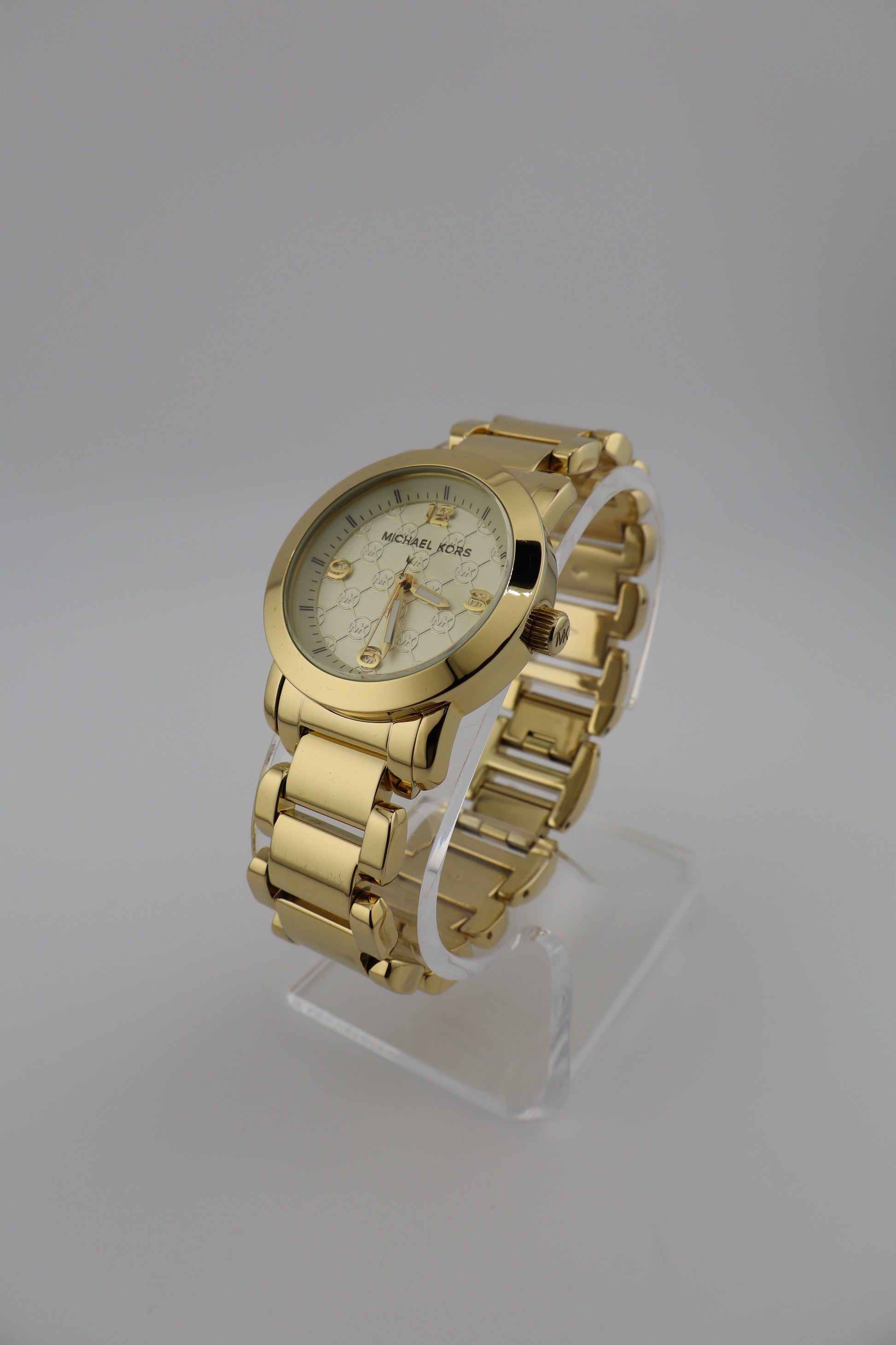 Sleek and stylish, this Michael Kors Runway MK-3158 is a women's gold-tone wristwatch that blends sophistication with everyday wearability. The polished gold-tone case and matching bracelet bring an elegant shine, while the off-white dial stands out with a repeating pattern of embossed MK logos for a touch of signature flair. It features gold-tone hour markers at the 3, 6, 9, and 12 positions and slim baton markers for the remaining hours. The crystal and case are in excellent condition with no visible scratches. The bracelet shows only minor signs of wear typical of light use. Powering the watch is a reliable Miyota 2036 quartz movement. A fresh battery has been installed, though the watch has not been tested for long-term accuracy.