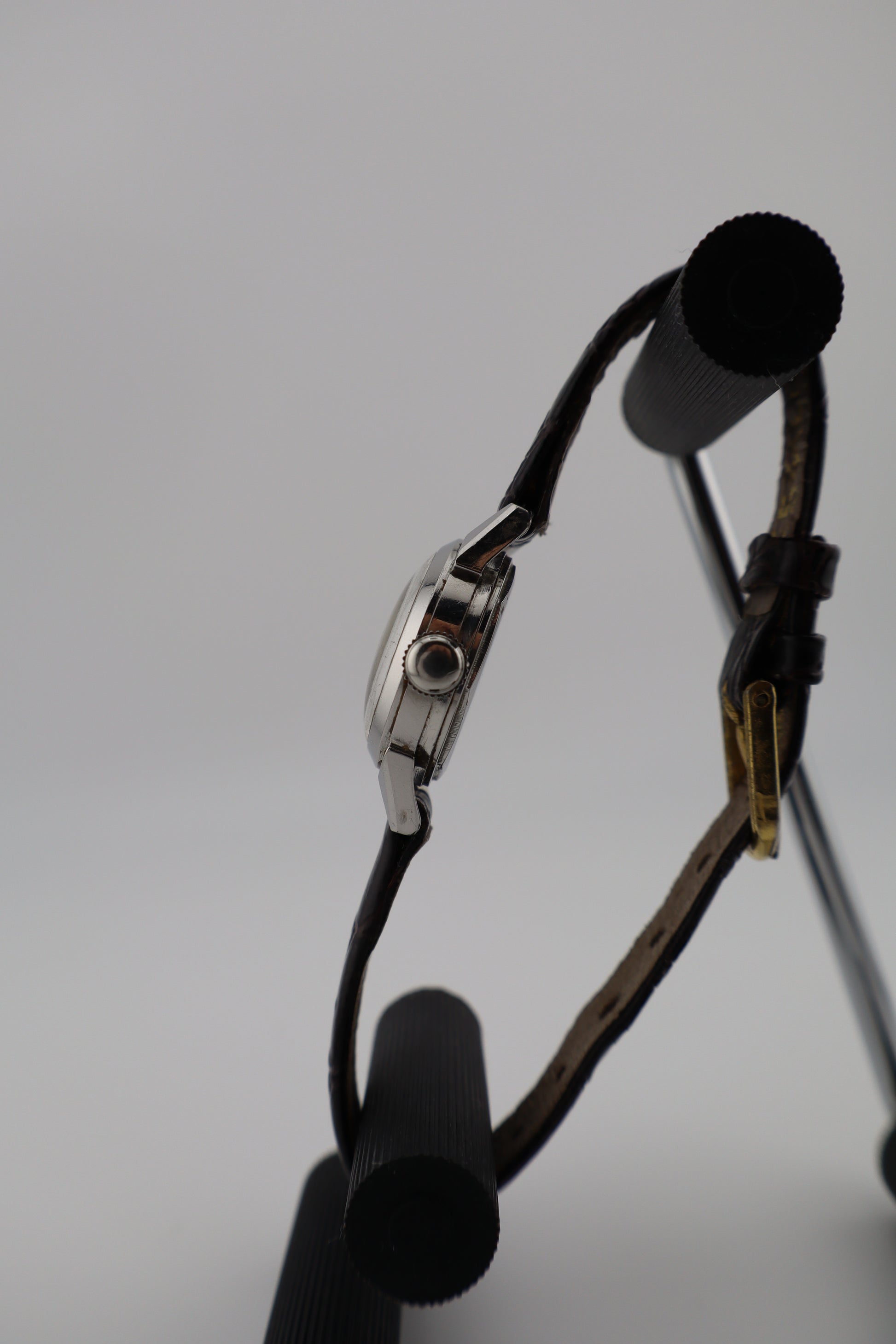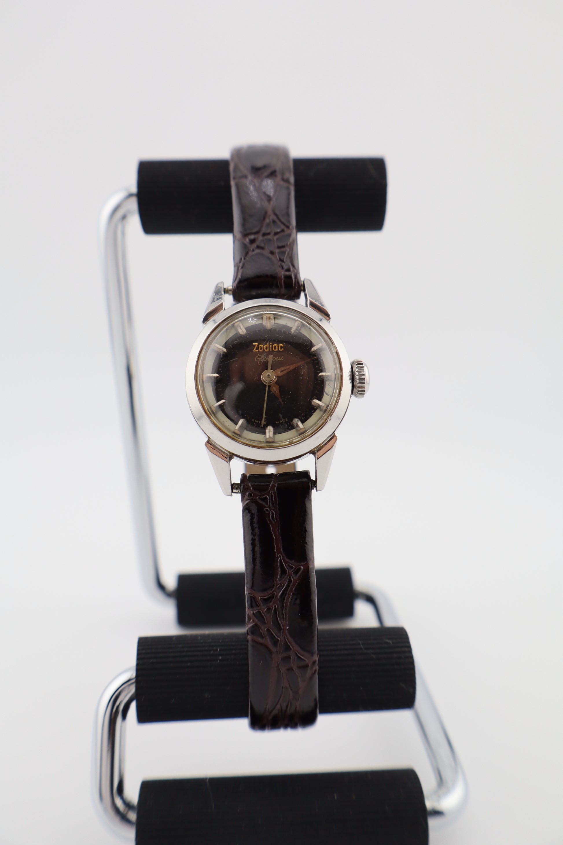This rare and elegant vintage Zodiac Glorious ladies' watch is a beautiful piece of Swiss craftsmanship from the 1950s or 1960s, featuring a hand-wound mechanical movement that remains strong and keeps time well. The stainless steel case is complemented by a striking black dial with gold-tone accents, which has developed a charming vintage patina over time. Adding to its refined appeal, the watch is fitted with a genuine alligator leather strap, enhancing both comfort and sophistication. While the dial and crystal show signs of age, the watch remains an exceptional collector’s item and a functional, stylish piece of history. Recently sanitized and polished, this timepiece is perfect for vintage watch enthusiasts or those who appreciate timeless elegance.