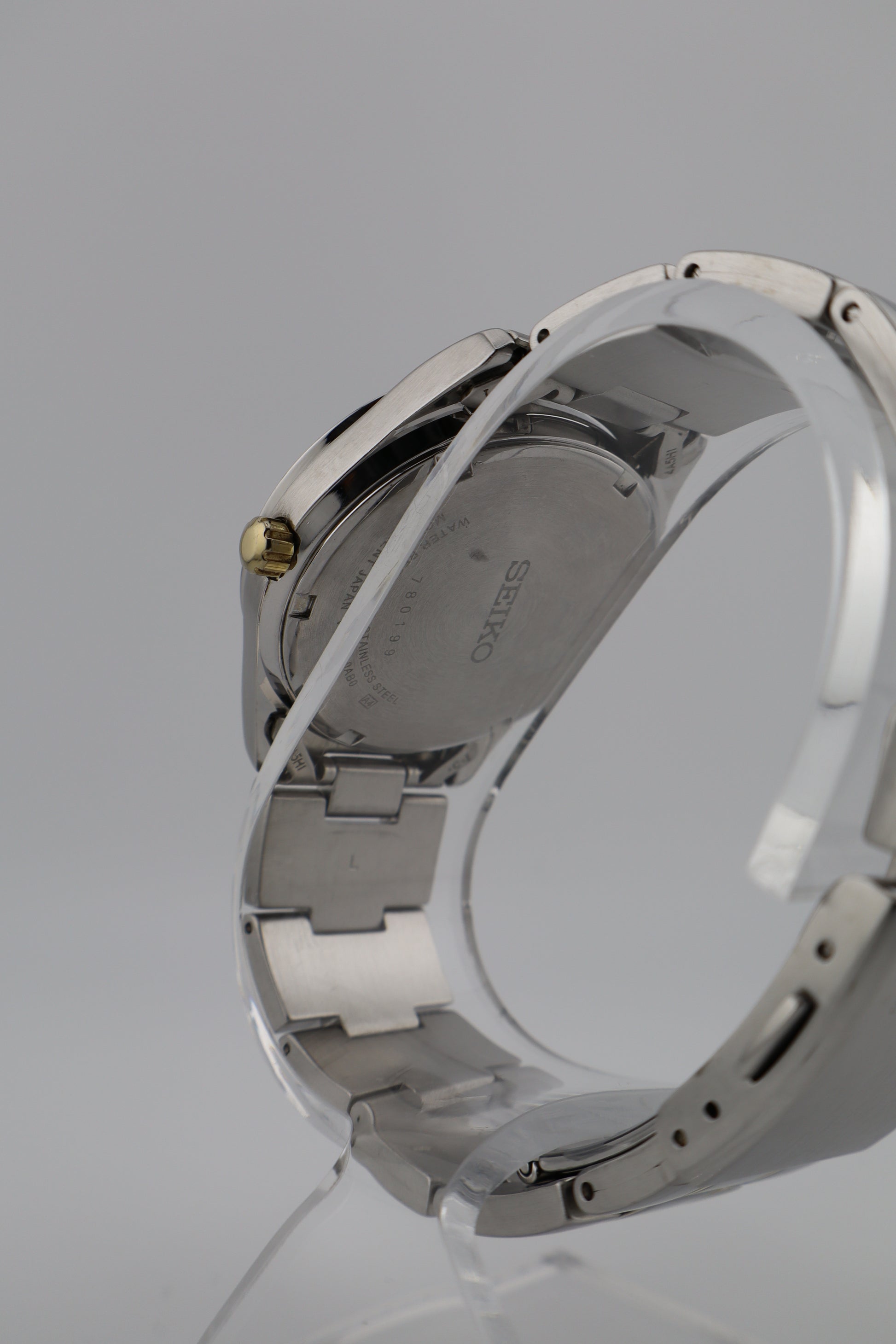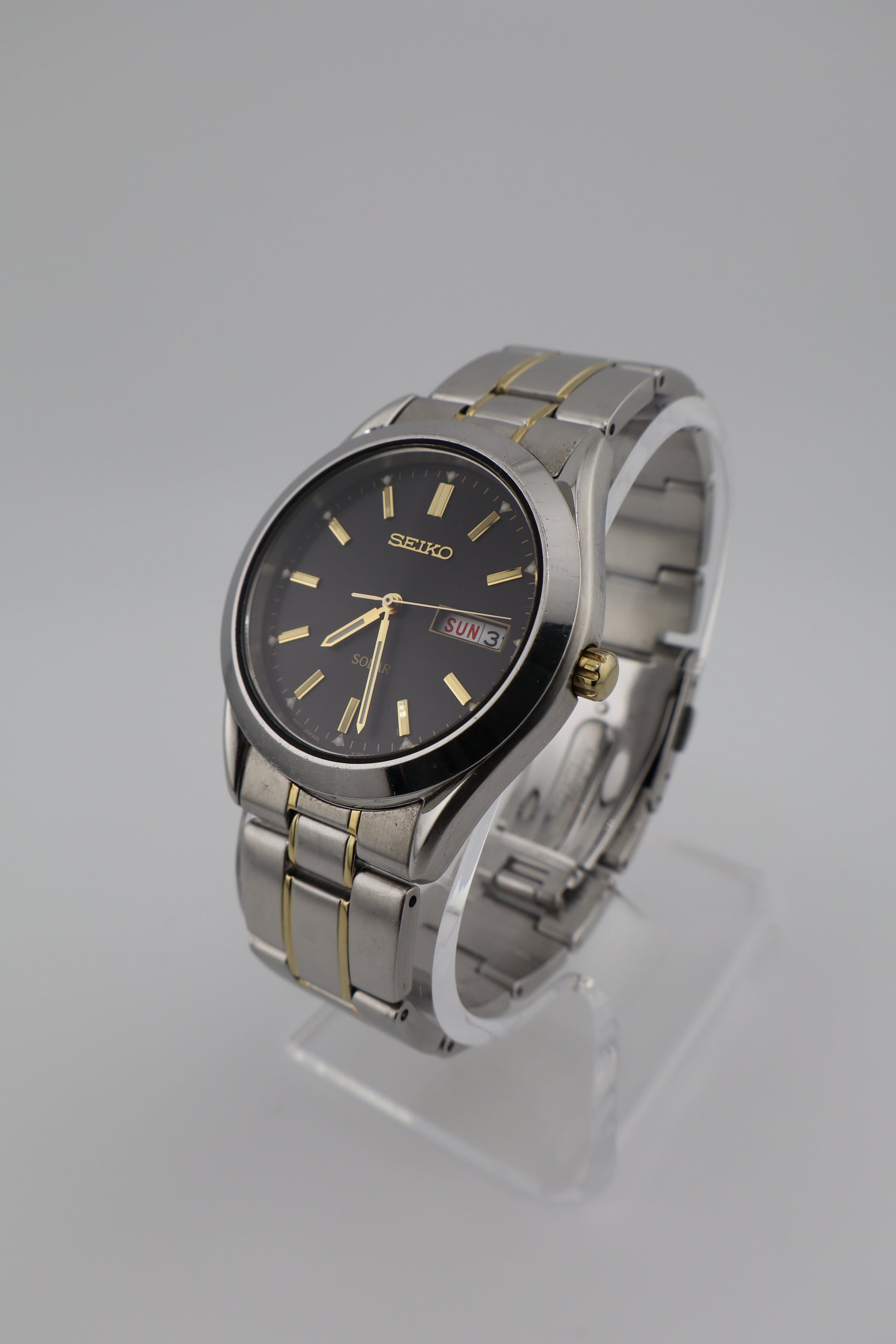 This Seiko Solar men’s watch (ref. V158-0AB0, serial 780199) blends modern efficiency with a classic two-tone aesthetic. Manufactured in 2017, it features a striking black dial accented with gold-tone hour markers and hands, a framed day-date window at 3 o’clock (with bilingual option), and a sleek, polished bezel. The case and bracelet are stainless steel with gold-tone center links, offering a versatile look that works equally well with business attire or casual wear. The watch is in decent aesthetic condition, with noticeable wear throughout: surface scratches and small scuffs are visible on the crystal, bezel, and bracelet. There is medium-level wear consistent with regular use, but no major damage or structural issues. The watch is currently running and responsive, though—as with most solar watches—it may require extended time in direct light to reach a full charge. Long-term timekeeping accuracy has not been tested. The Seiko V158 solar quartz movement inside this model is known for its reliability and eco-friendly performance, powered by both natural and artificial light sources.