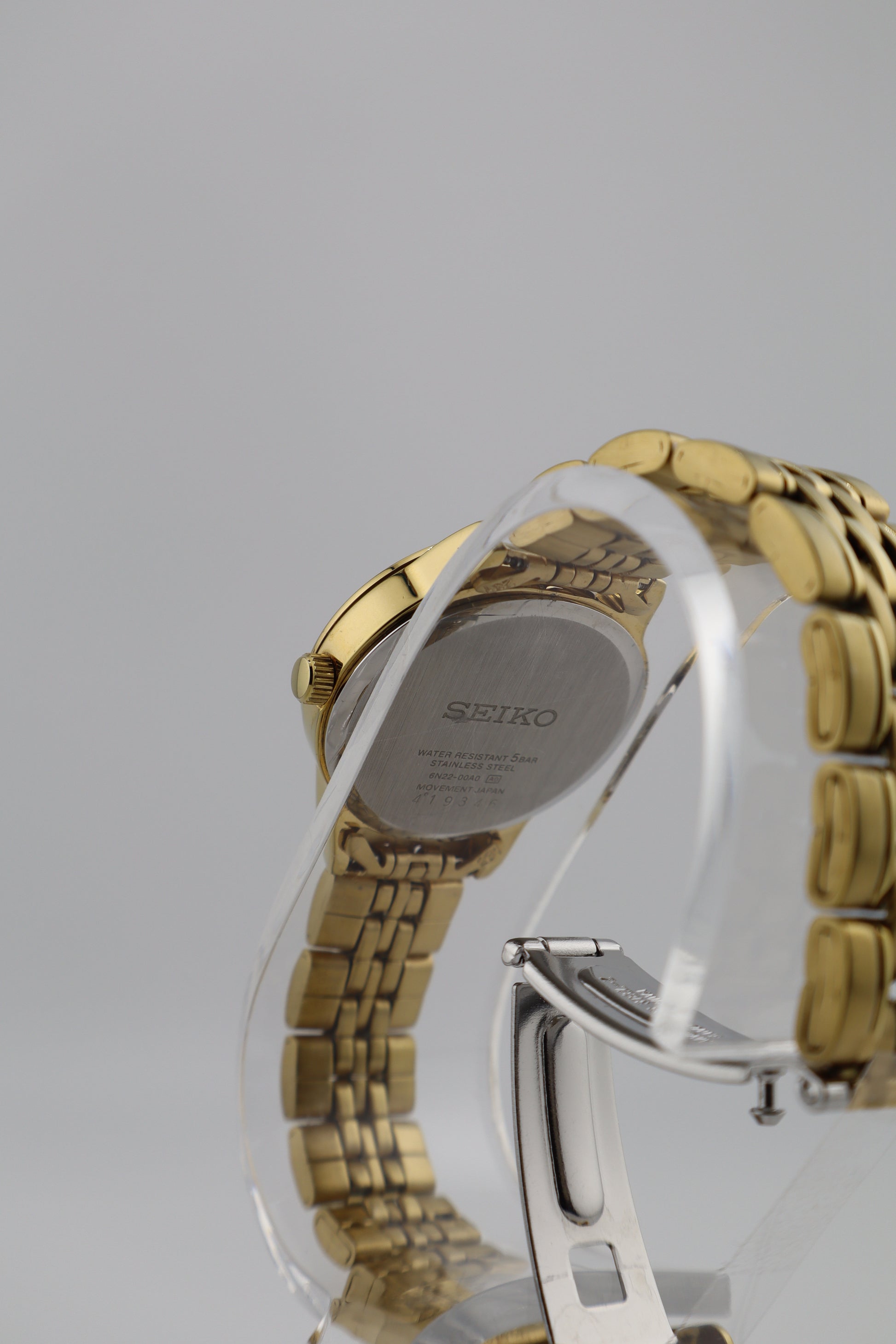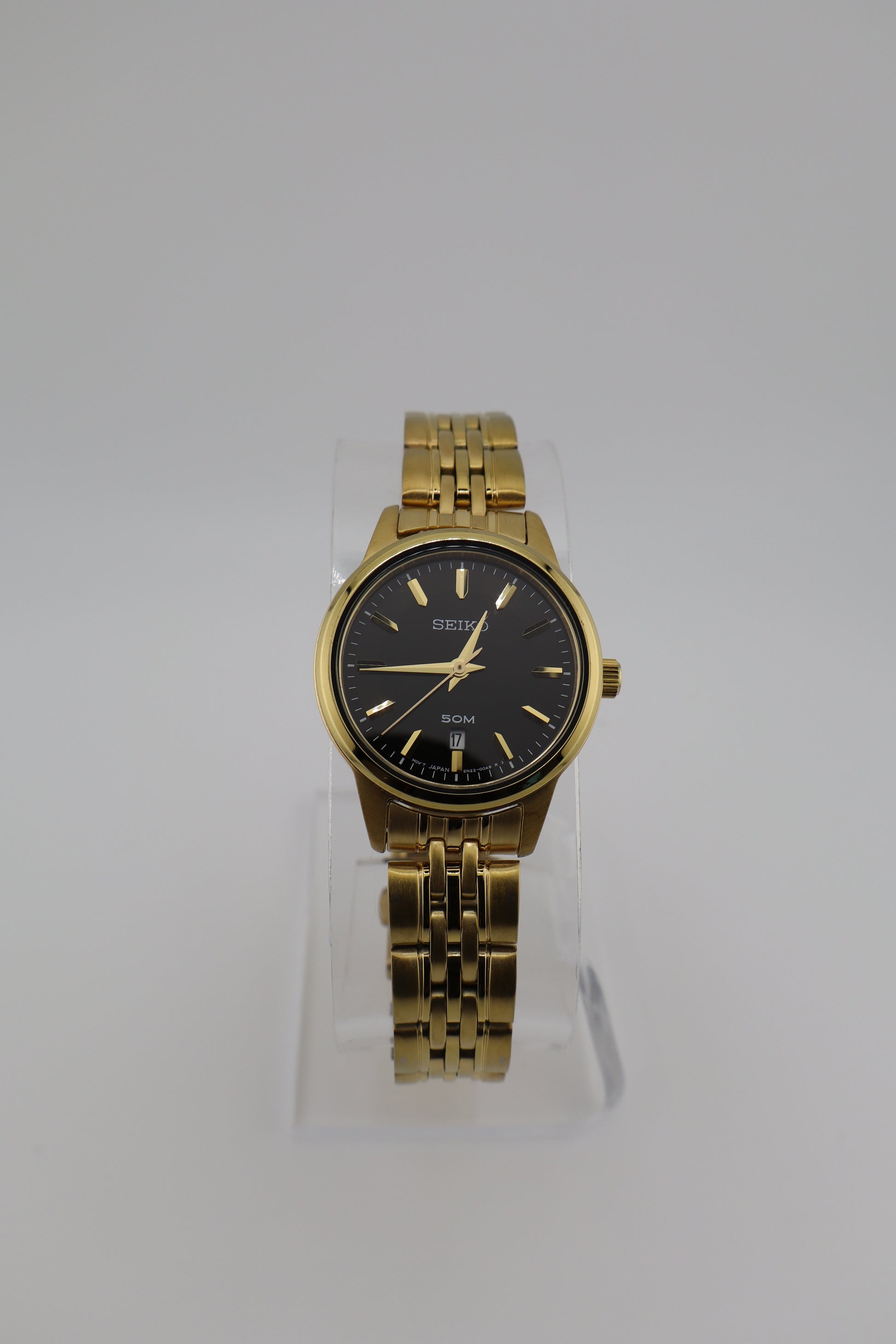 This elegant Seiko SUR886 women's watch offers timeless style with its gold-tone case and bracelet paired beautifully with a deep black dial. The 6N22-0080 quartz movement keeps things classic and simple, with gold baton indices, gold hands, and a date display at 6 o'clock. The dial is marked “50M,” indicating water resistance up to 50 meters. This particular example is in excellent aesthetic condition. The crystal and case are pristine with no visible signs of wear. The gold-tone bracelet shows only minimal buffing from prior use—hardly noticeable when worn. The watch is powered by a fresh battery, though long-term accuracy has not been tested. The serial number (419346) dates this piece to 2004, and it carries the reliable 6N22 movement known for its dependability and quiet operation. A perfect piece for everyday elegance or dress wear.