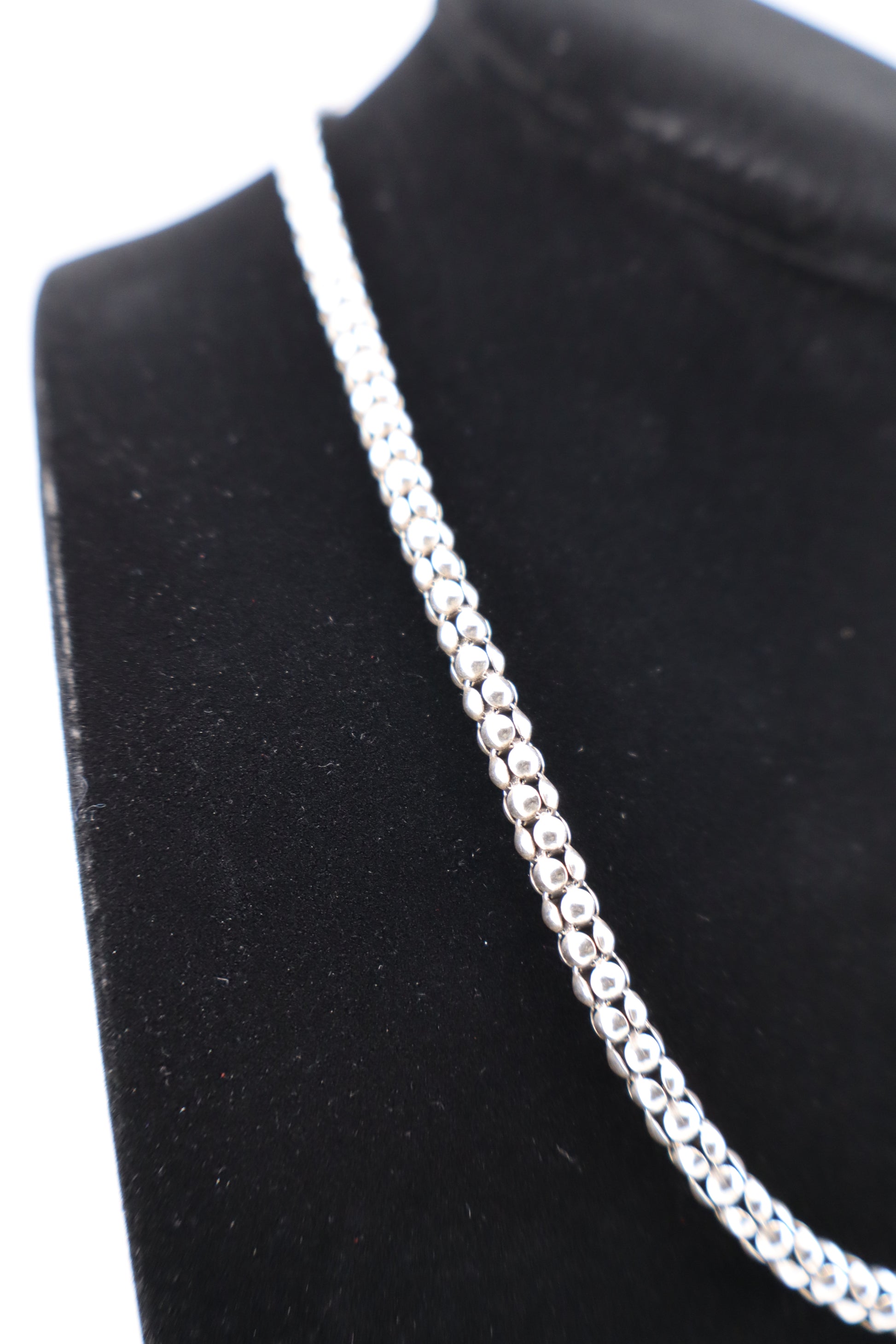 This men’s sterling silver necklace features a polished bead chain design with smooth, rounded links that create a bold, modern look. The chain measures 43 cm (17 inches) in length and 4 mm in width, with a total weight of 8.1 dwt (≈12.6 grams). It is stamped 925 for sterling authenticity and secures with a sturdy lobster claw clasp for reliable wear. Recently deep cleaned and polished, this necklace is ready to wear and adds a stylish edge to any collection.