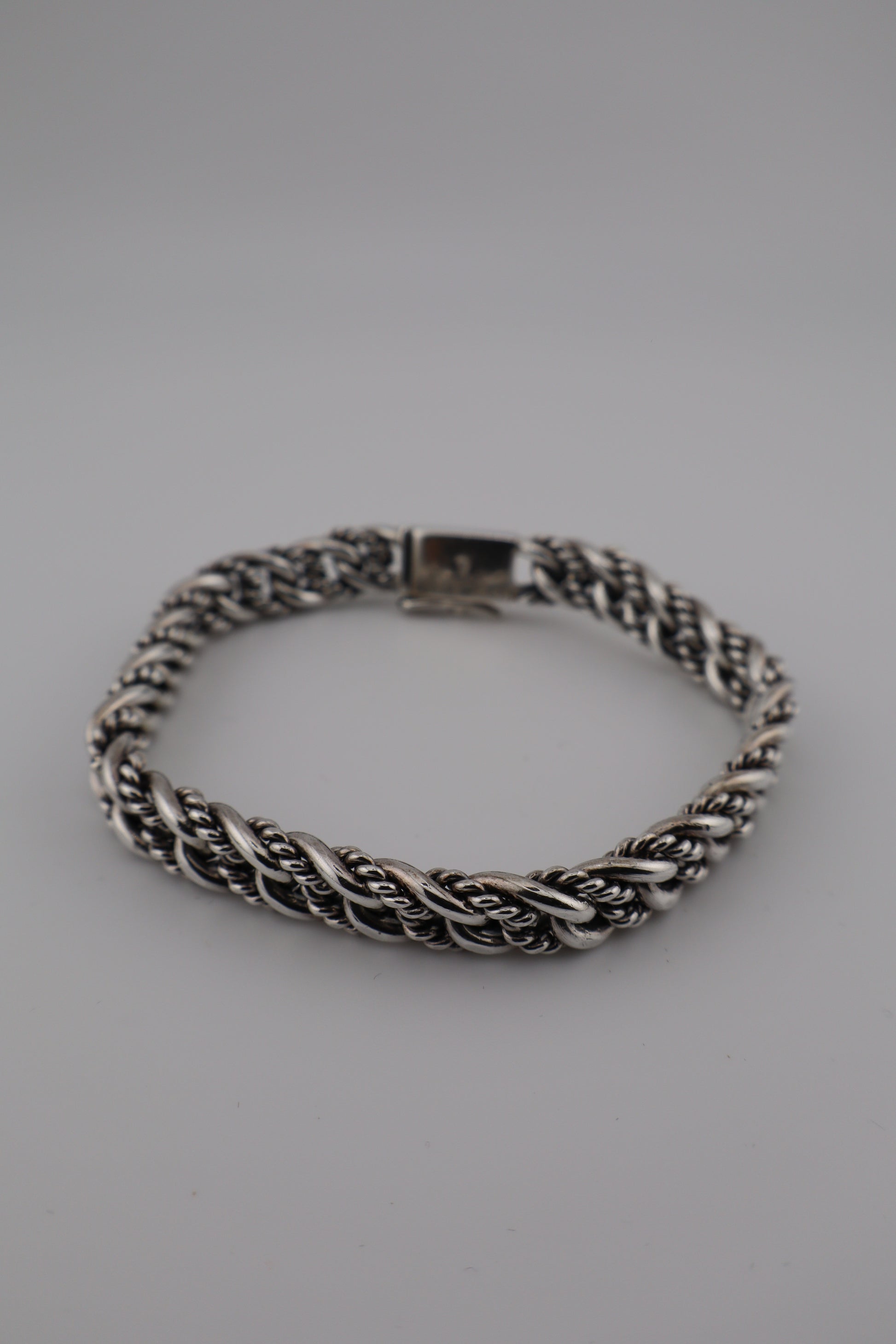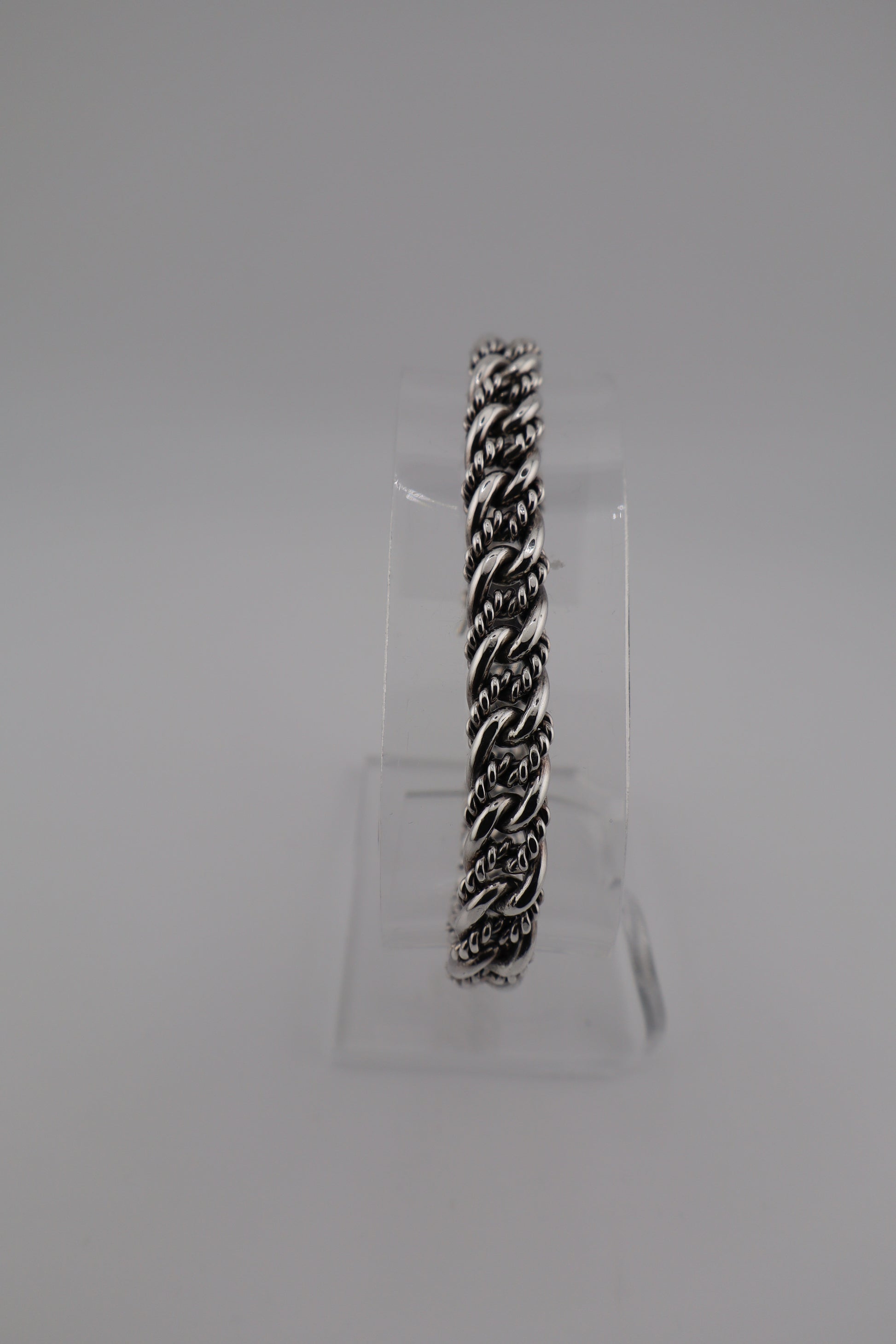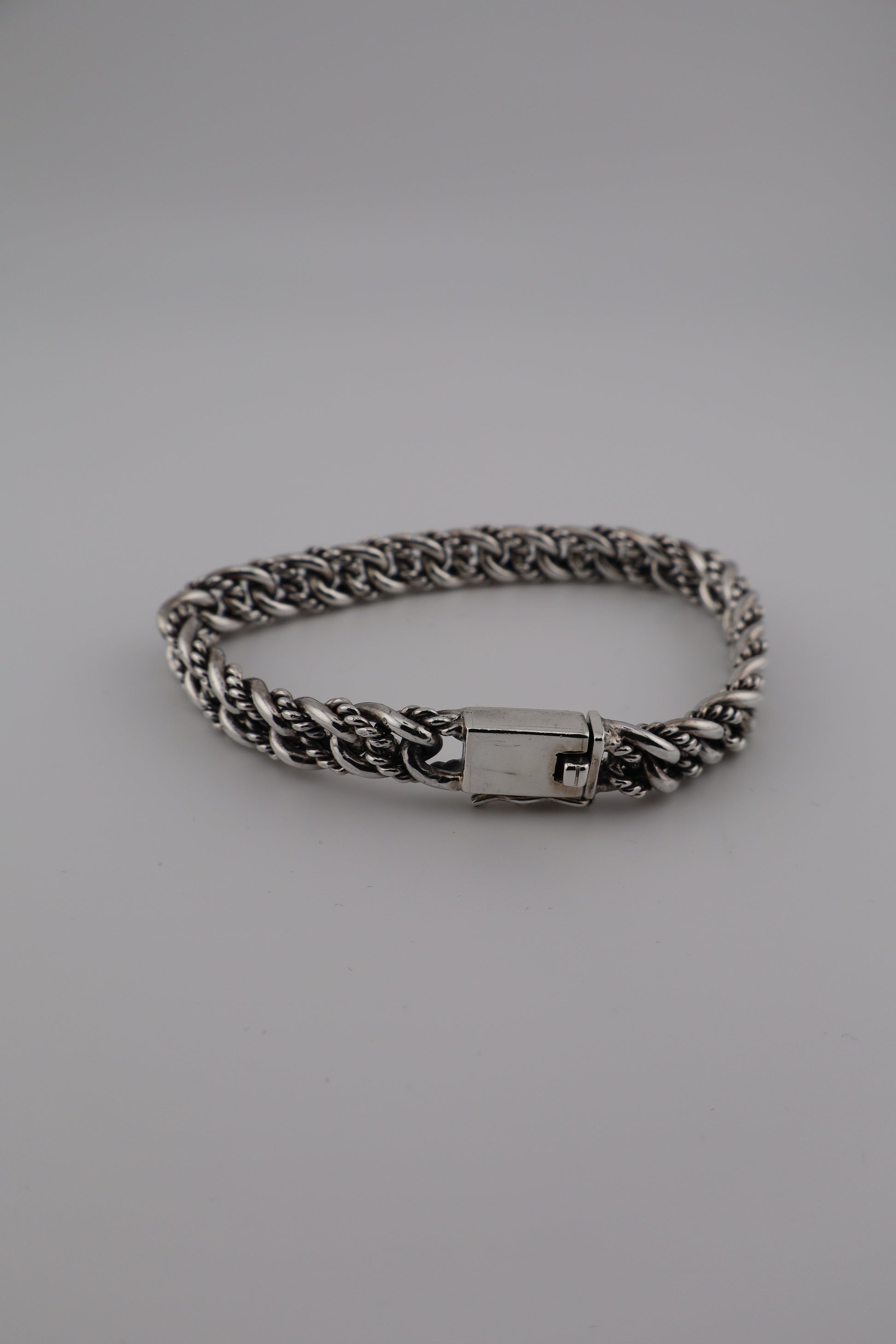 This men’s sterling silver bracelet features a detailed Byzantine chain design with intricate interwoven links, creating a bold and timeless look. The bracelet measures 21.5 cm (8.5 inches) in length and 9 mm in width, with a substantial weight of 25.6 dwt (≈39.8 grams). Stamped 925 for sterling authenticity, it secures with a sturdy box clasp and side latch for added security. Recently deep cleaned and polished, this bracelet is ready to wear and makes an impressive addition to any silver collection.