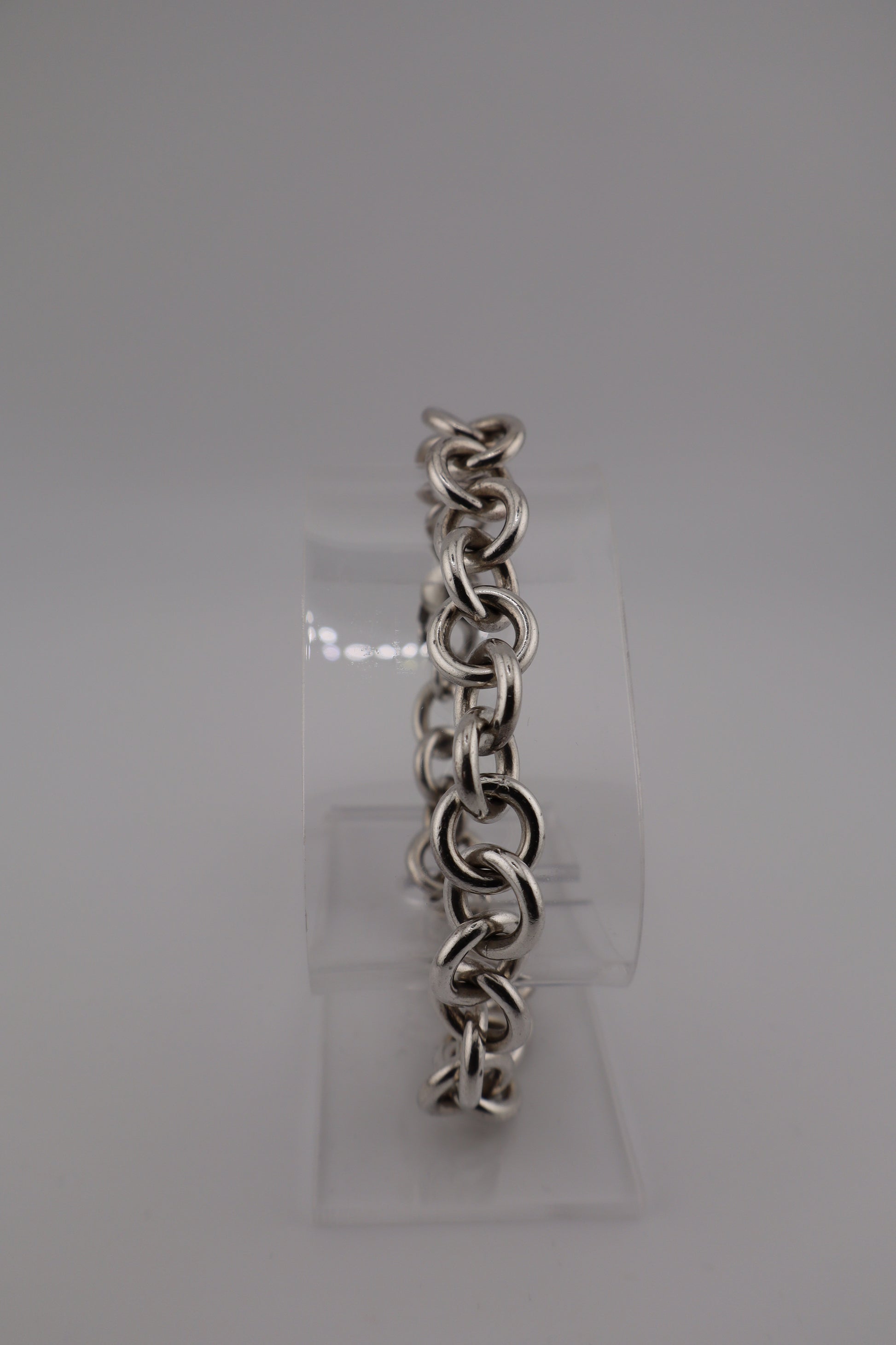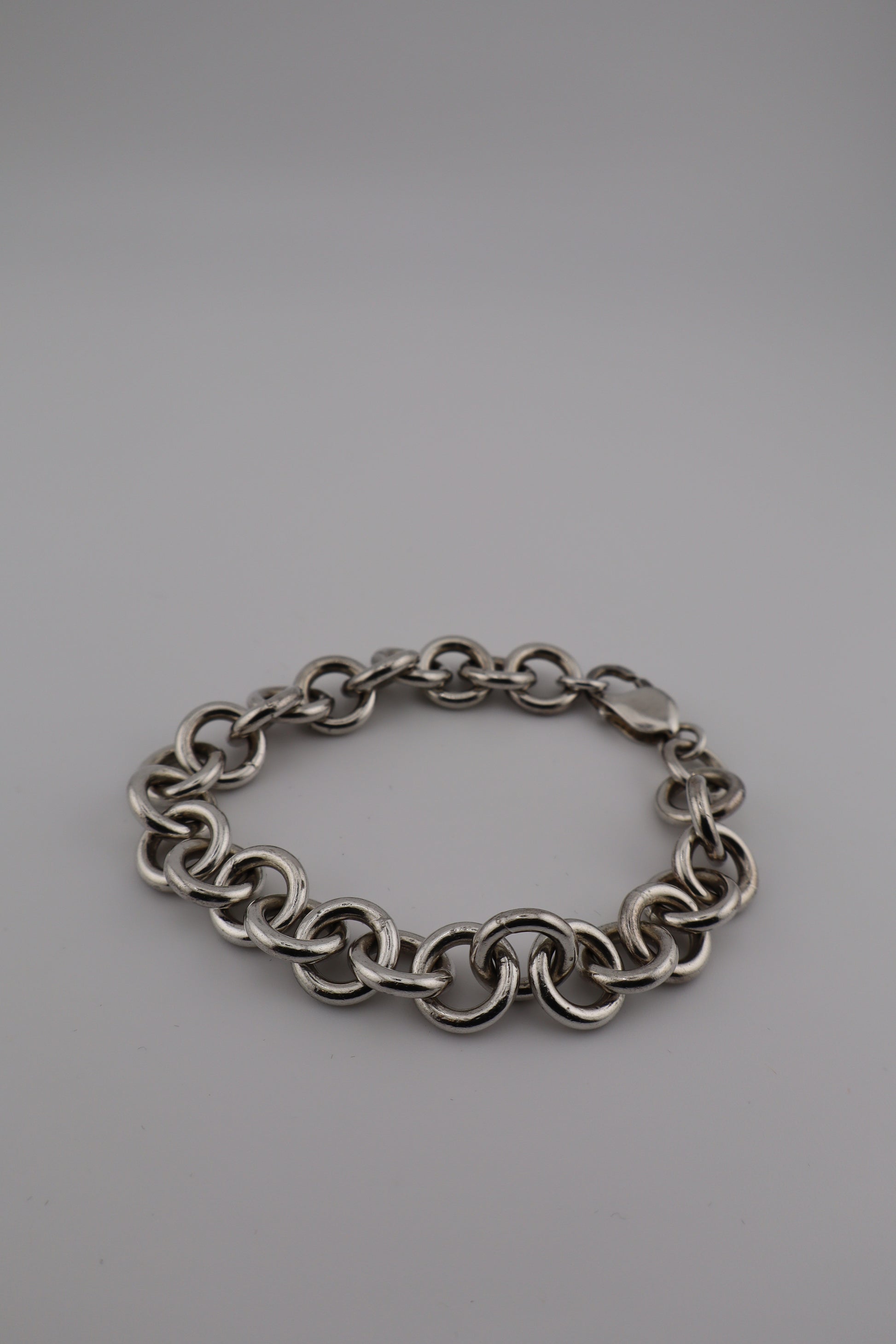 This men’s sterling silver bracelet features a bold rolo chain design with large interlocking round links, giving it a strong and stylish presence on the wrist. The bracelet measures 20.5 cm (8 inches) in length and 10 mm in width, with a substantial weight of 24 dwt (≈37.3 grams). It is stamped 925 for sterling authenticity and secures with a sturdy lobster claw clasp for reliable wear. Recently deep cleaned and polished, this bracelet is ready to wear and makes a standout addition to any silver collection.