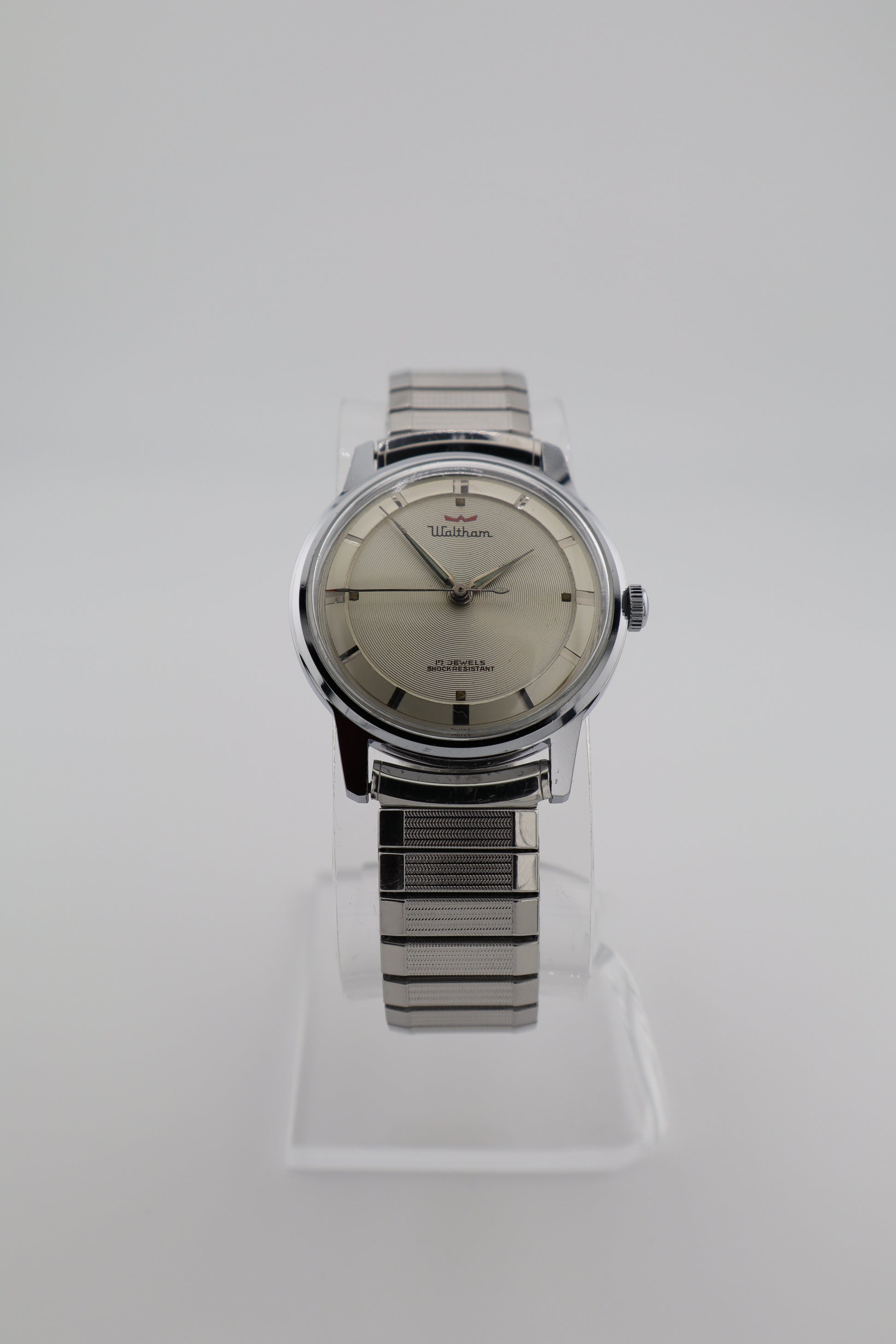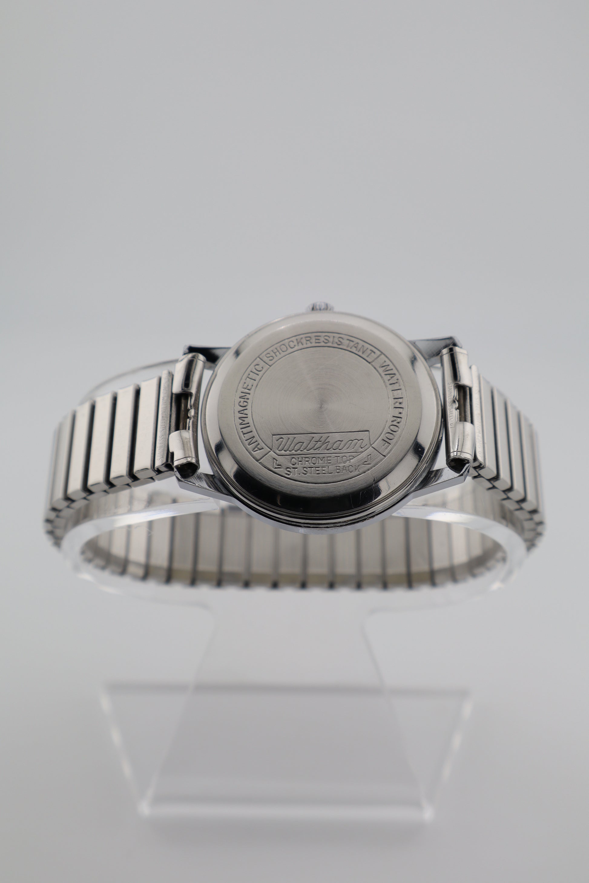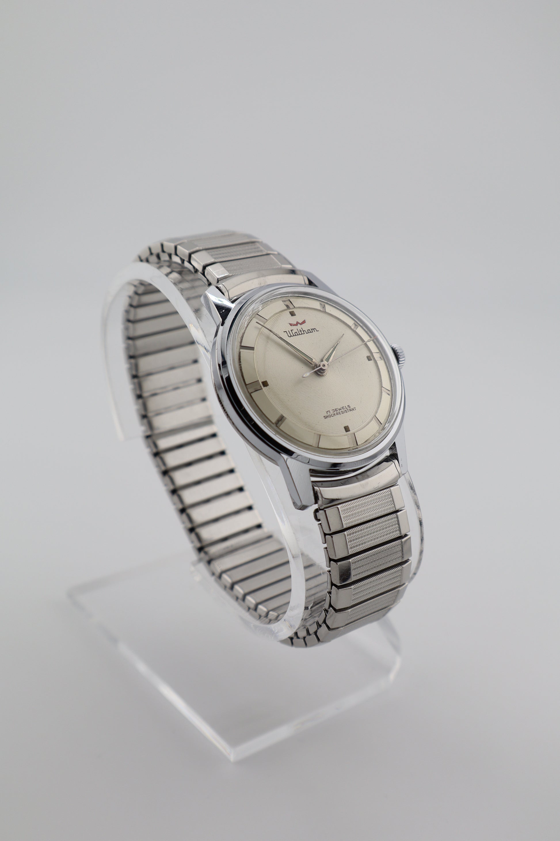 The Waltham Sea Lion was produced during the late 1950s to early 1960s as a durable, everyday men’s watch, marketed with features such as shock resistance and anti-magnetic protection. Powered by a 17-jewel manual wind movement, the Sea Lion line is known for reliability, clean mid-century styling, and solid construction. While these watches are not rare, examples that survive with sharp cases, well-preserved dials, and strong mechanical performance are becoming increasingly difficult to find. This vintage men’s Waltham Sea Lion manual wind watch is an outstanding example, presenting in excellent overall condition with a crisp, textured dial, clean case, and sharp lugs that retain their original lines. The crystal shows only very light surface wear that does not affect readability, and the chrome-top case with stainless steel back remains bright and well preserved. The watch is running exceptionally well, posting impressive timegrapher results of approximately ±3 seconds per day, ~300° amplitude, and a 1.4 ms beat error, which is far above average for a piece of this era. It comes fitted with a period-correct expansion bracelet that complements the watch nicely and makes it immediately wearable.