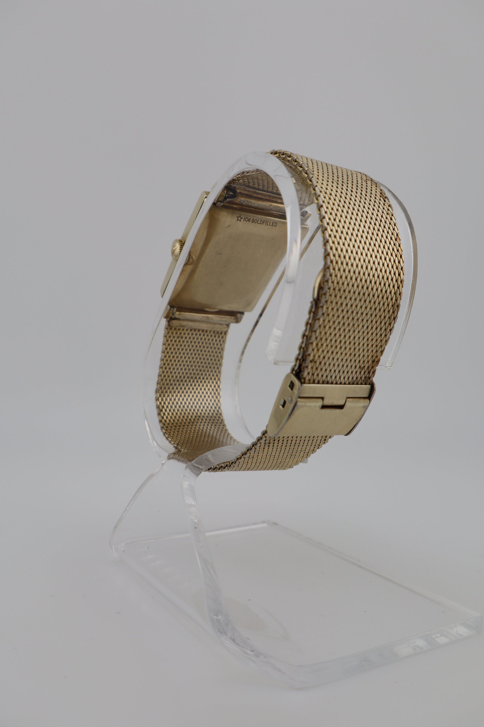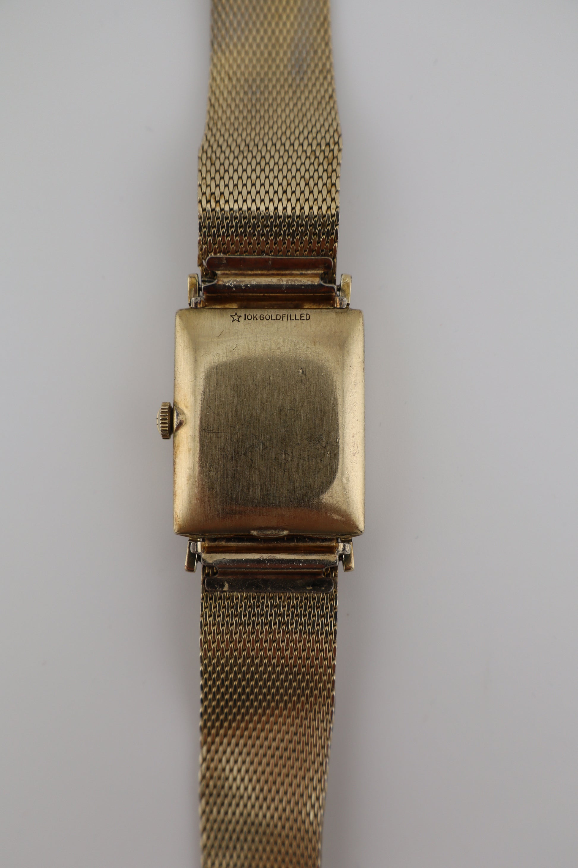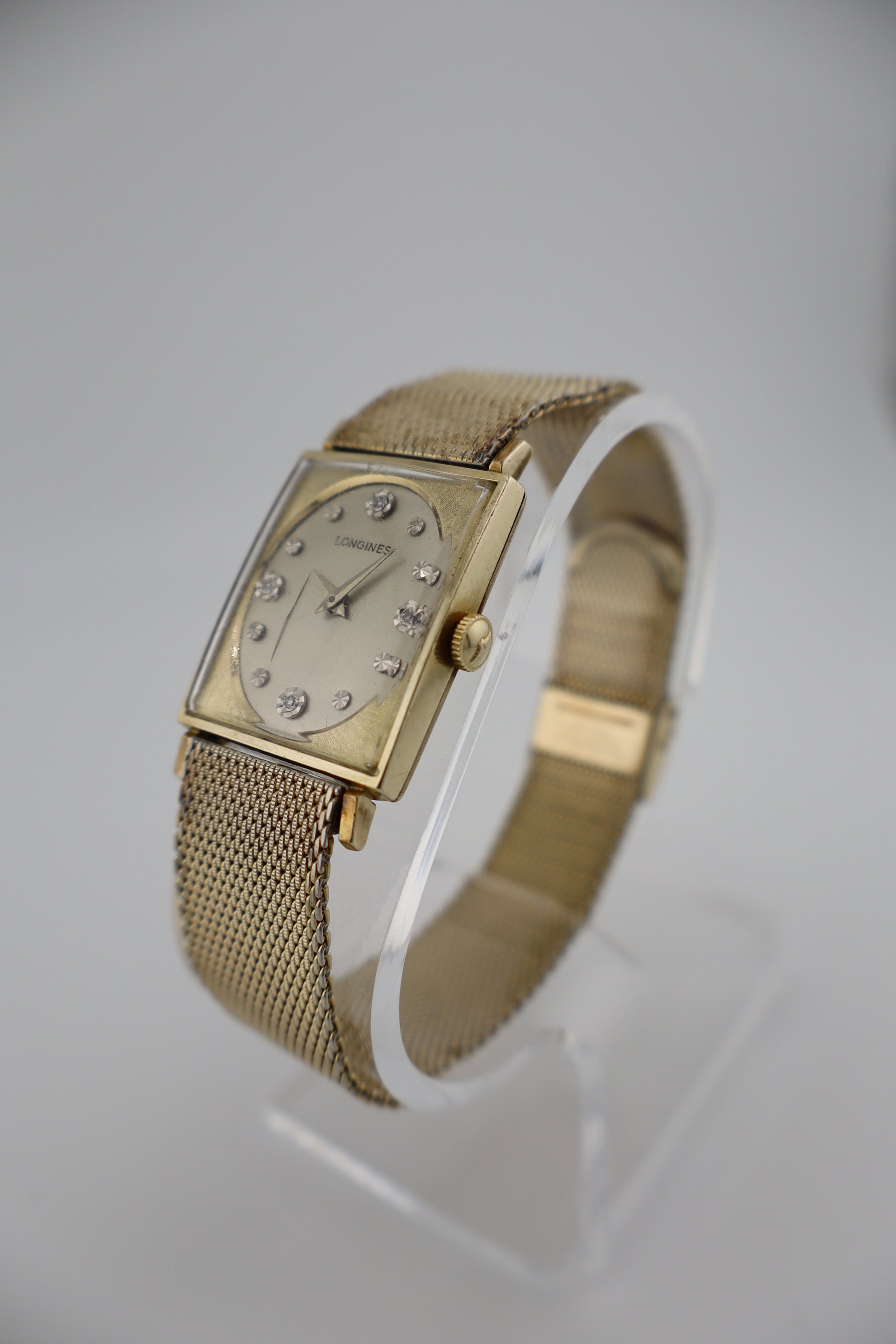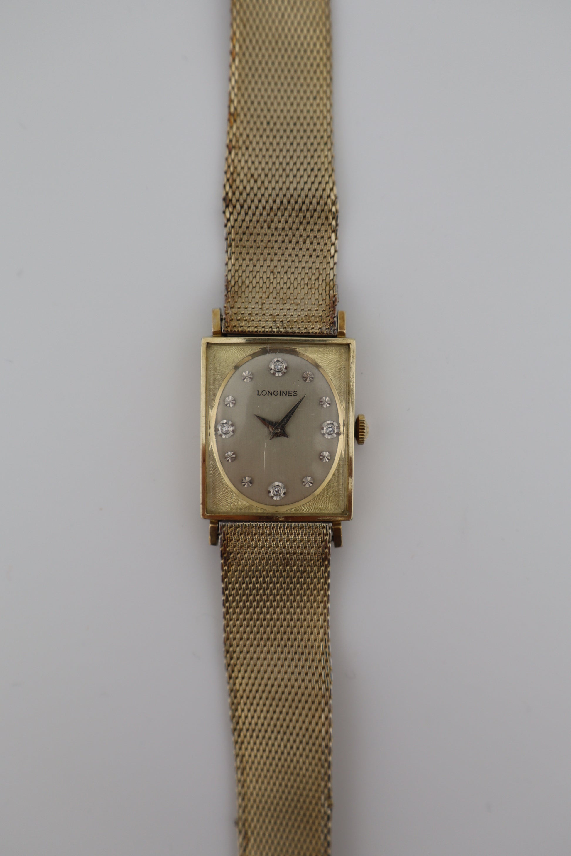 This elegant vintage Longines tank-style wristwatch features a rectangular 10k gold-filled case paired with its original Kestenmade chainmail-style gold-plated bracelet. The dial is adorned with brilliant diamond markers at 12, 3, 6, and 9 o’clock, while the rest of the silver-tone face remains in excellent condition. Though the crystal shows some deeper scratches and the bracelet exhibits kinks, the watch remains fully wearable and eye-catching. It is powered by a functioning 17-jewel Longines Cal. 528 Swiss movement, though it hasn’t been tested for long-term timekeeping accuracy. The original crown is present but fragile, requiring deliberate care when winding or adjusting. Based on the serial number inside the case (7177648), this Longines dates to approximately the late 1950s to early 1960s. The movement is a Caliber 528, known for its reliability in dress watches of the era. The inside case back is marked 3007-528, and both the case and bracelet are stamped 10k gold filled.
