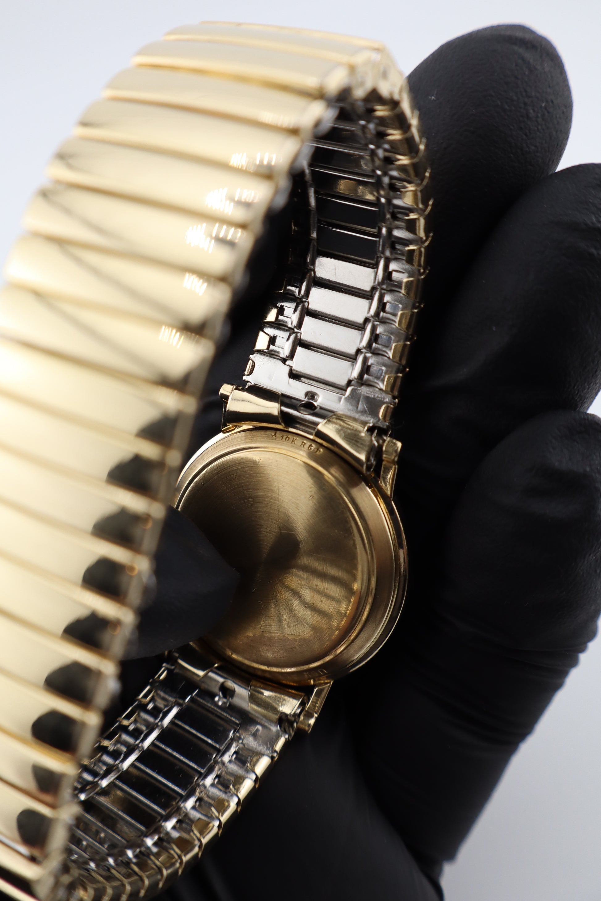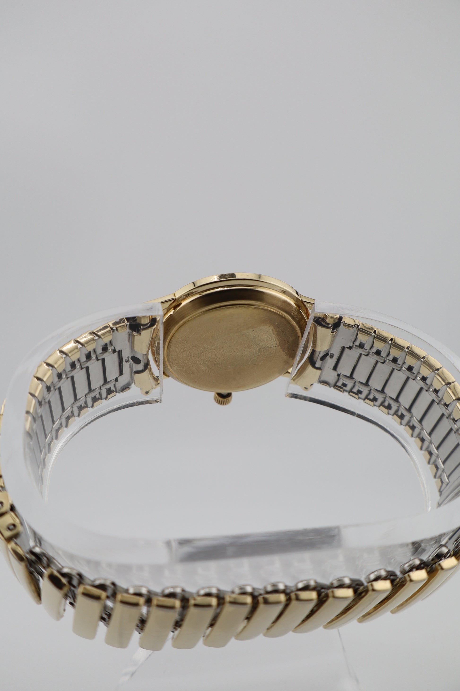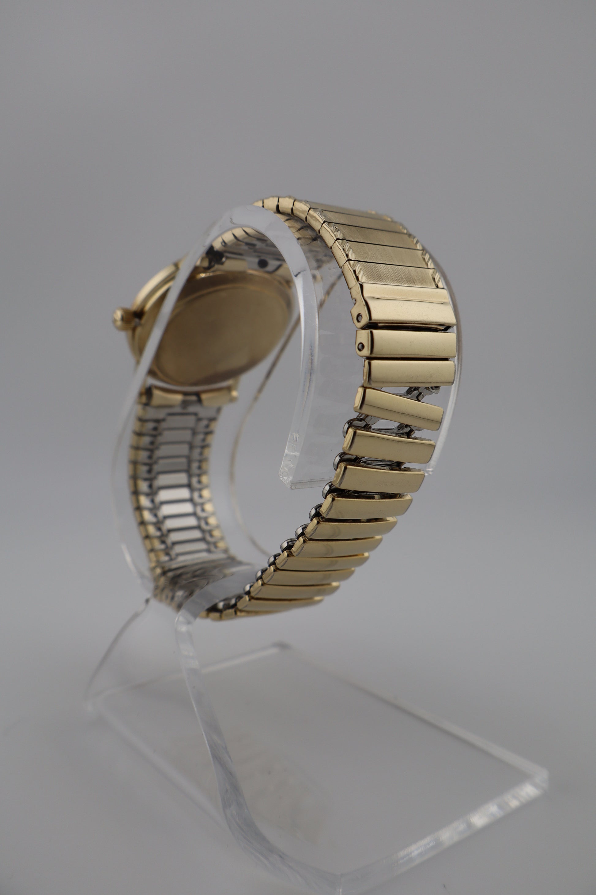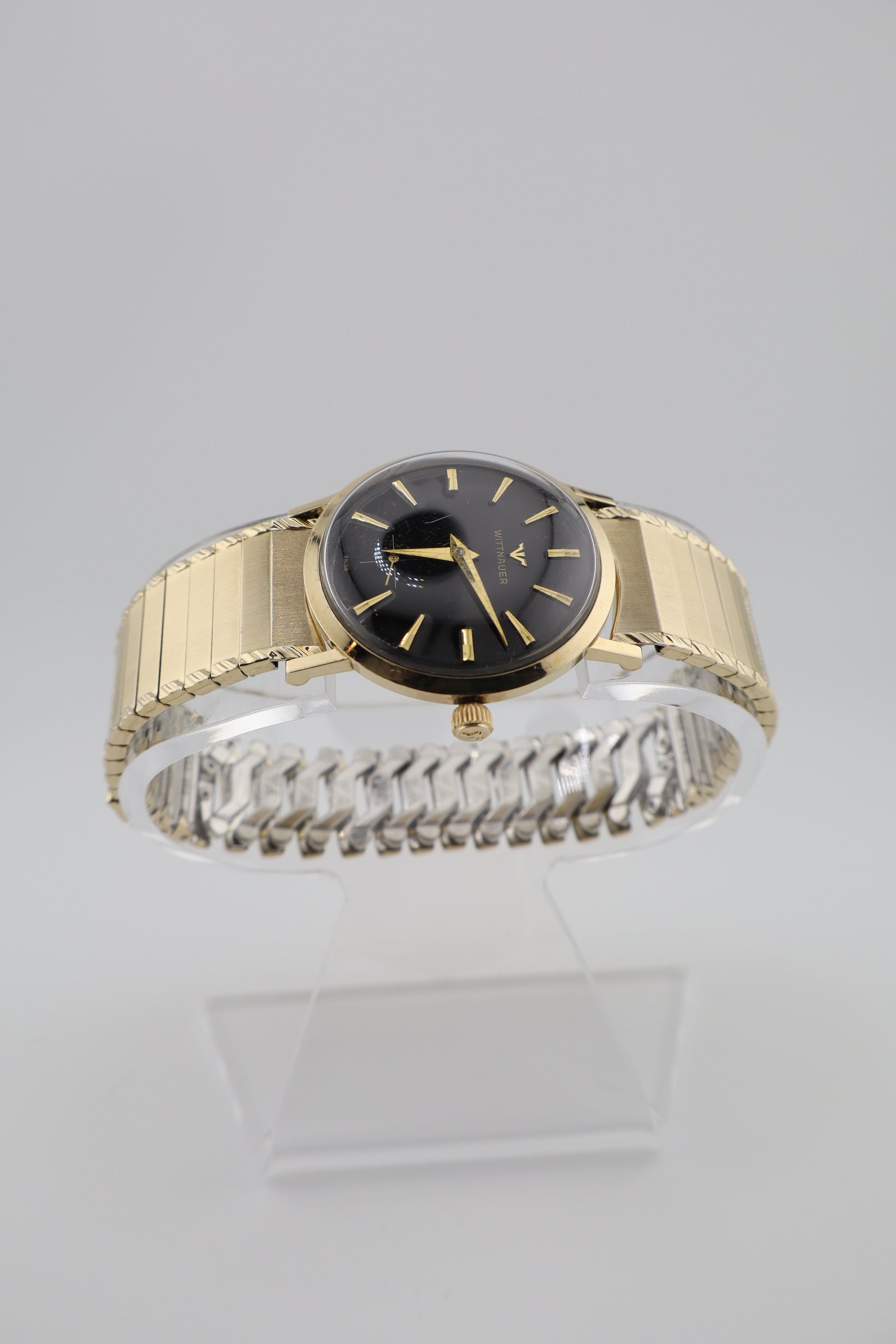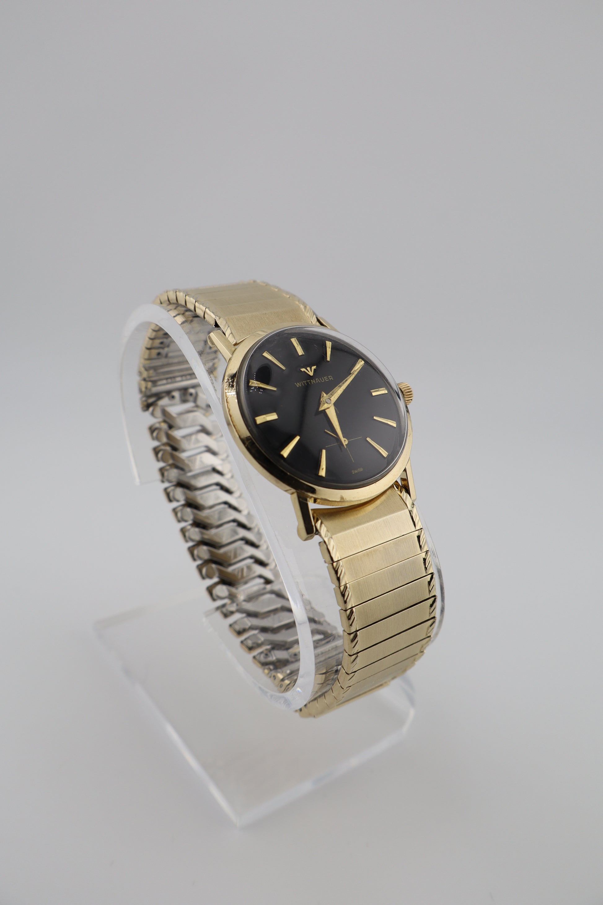 This vintage Wittnauer men’s wristwatch features a striking black dial with a gold-tone subdial for seconds, adding a classic touch to its refined mid-century design. The gold-tone applied indices and dauphine hands complement the 10K rolled gold plate (RGP) case, giving the watch an elegant yet understated look. Powered by a Swiss manual wind movement, the watch keeps good time with manual winding. The period-correct gold-tone expansion bracelet enhances its vintage appeal. While the acrylic crystal has noticeable scuffs and scratches, the case and bracelet remain in great condition, showing only typical wear for its age. This timepiece embodies timeless sophistication and mechanical precision, making it an excellent addition for collectors or vintage watch enthusiasts. Sold as-is; please review all photos for condition.