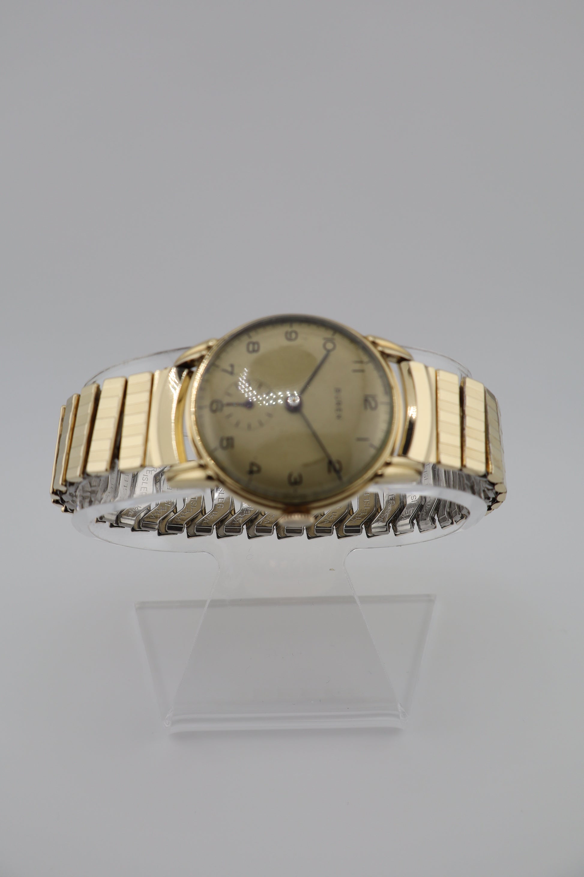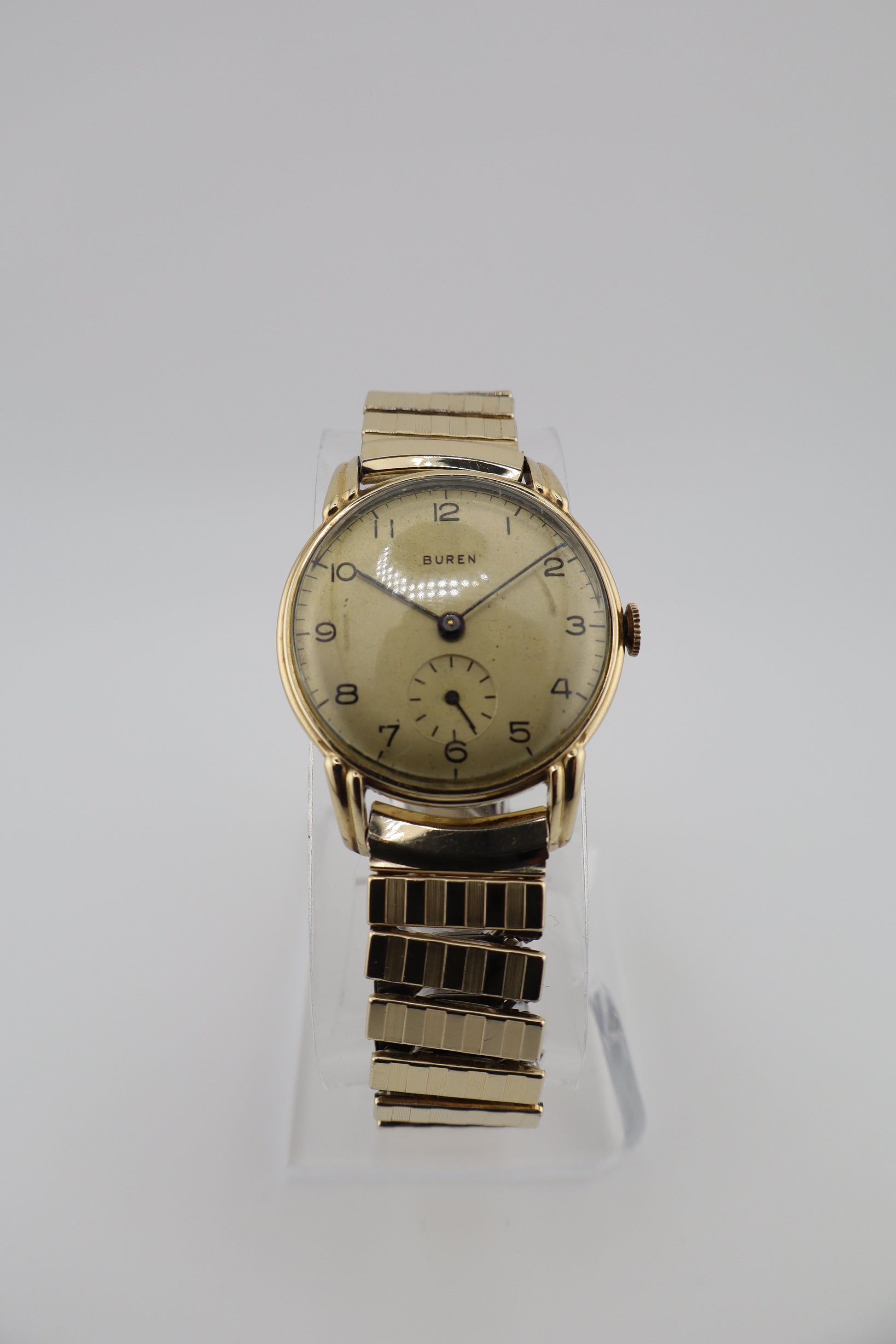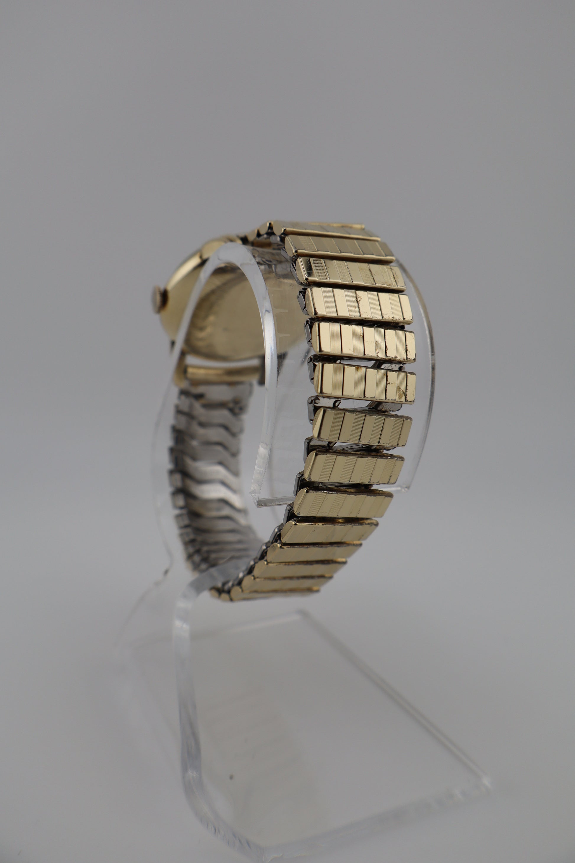 This classic vintage Buren men's watch features a 10K gold-filled case and an accompanying expansion band in fantastic condition, exuding timeless elegance. The dial exhibits some visible wear, adding character to its vintage appeal, while the manual wind movement ensures accurate timekeeping. This timepiece is fully functional and ready to wear, making it a great addition for collectors or those seeking a stylish accessory with historical significance.