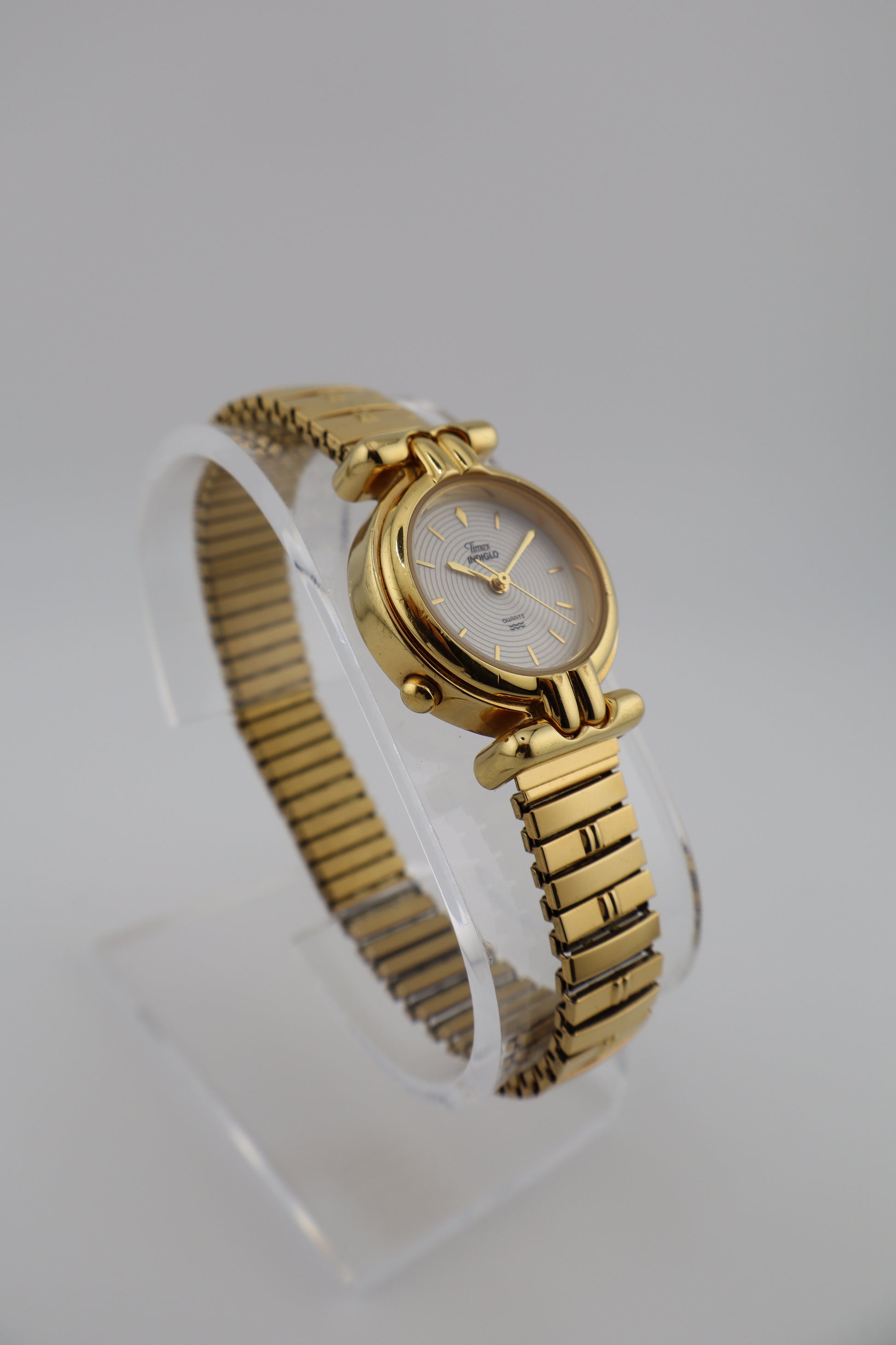 For sale is a beautiful vintage Timex women's watch featuring an elegant gold-tone case and bracelet. The watch is in excellent condition and has been fitted with a fresh battery, ensuring reliable timekeeping. The standout feature of this timepiece is its uniquely textured dial, accented with fine concentric circle detailing that enhances its sophisticated appearance. The watch also boasts stylish case embellishments at both the top and bottom, setting it apart from typical designs.