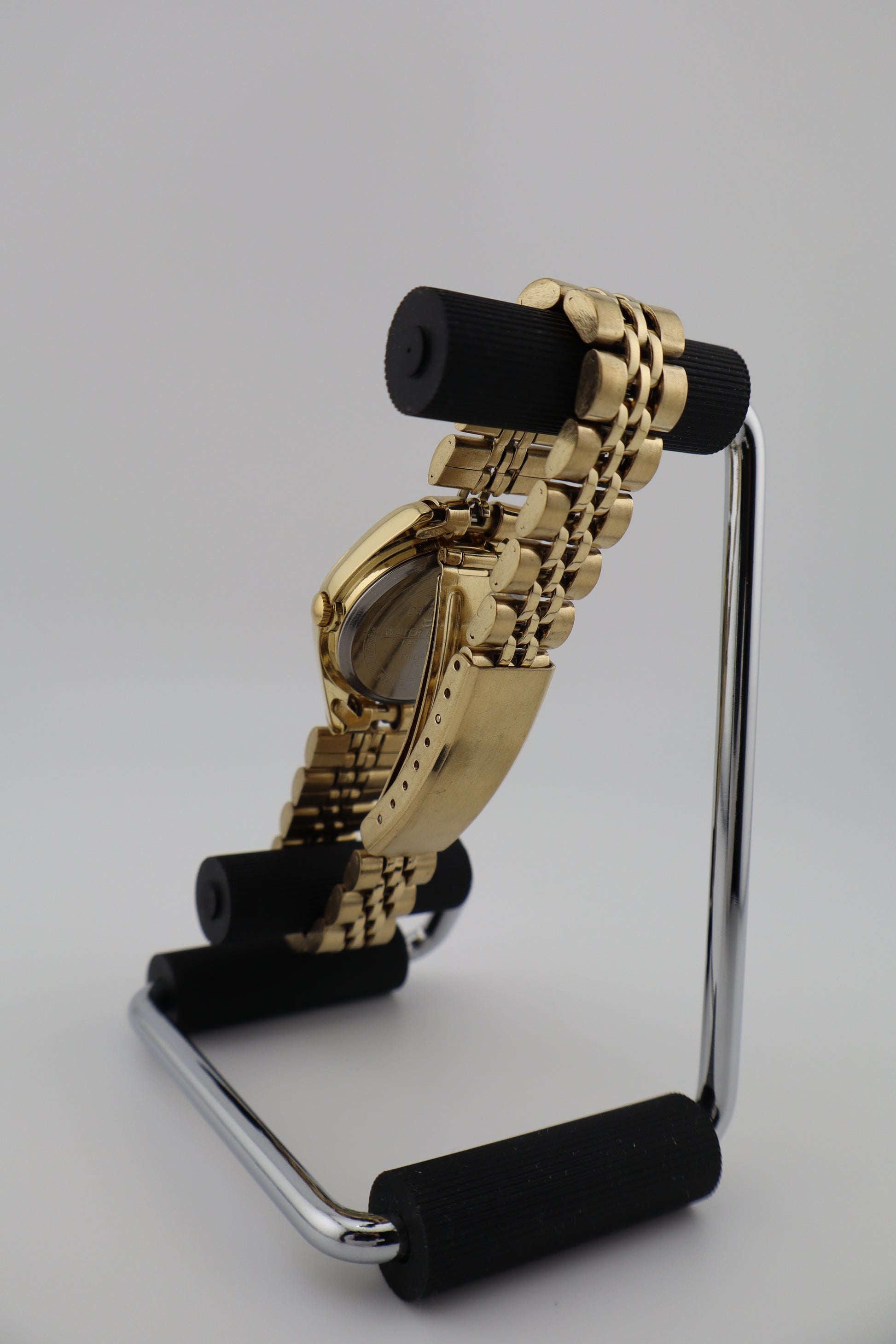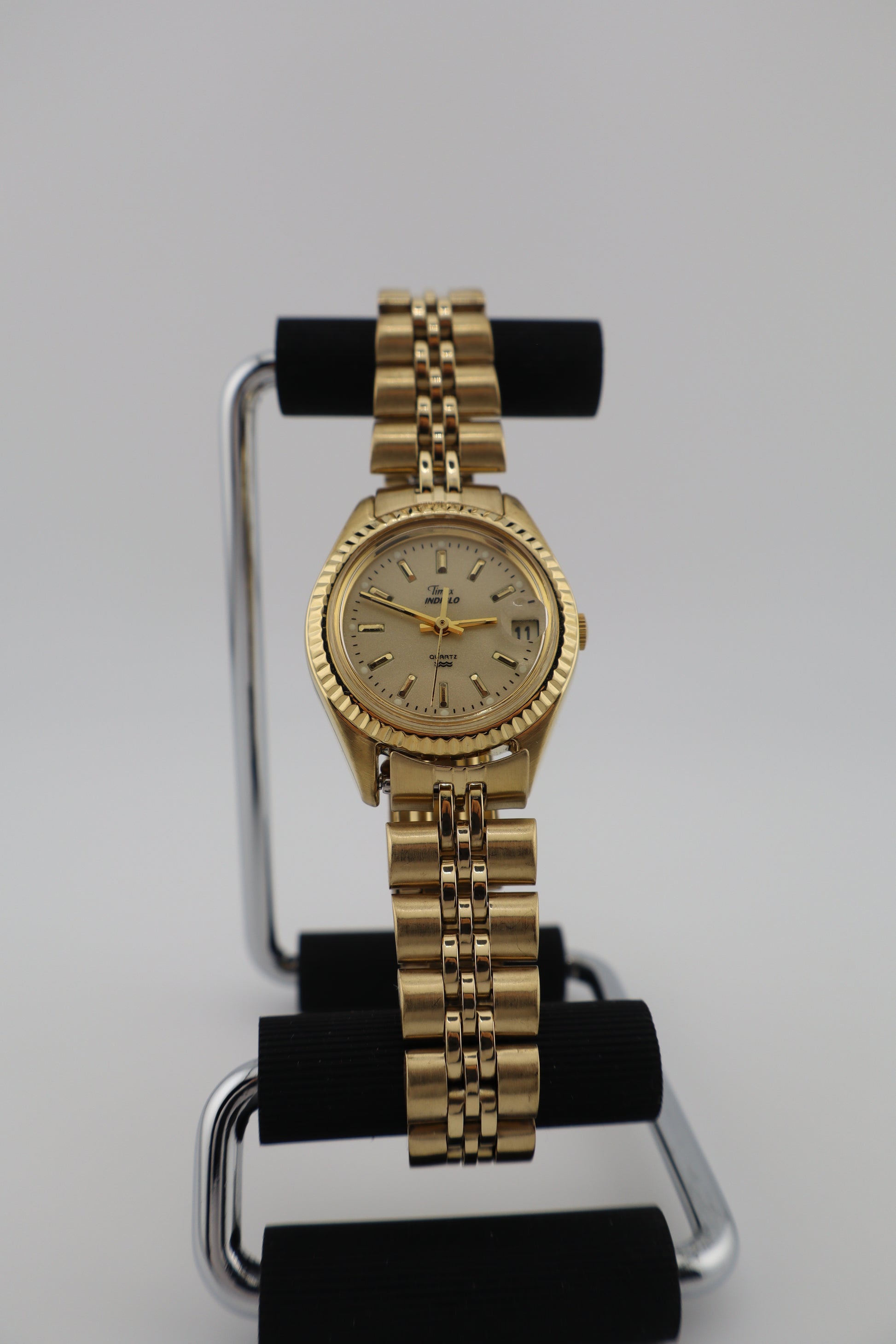 This Timex Indiglo women's quartz watch features an elegant all-gold-tone design with a fluted bezel, a champagne-colored dial complemented by luminous gold-tone hands and indices, and a practical date window at the 3 o’clock position. Powered by a reliable quartz movement, it includes Timex’s signature Indiglo night-light feature for enhanced visibility in low-light conditions. The jubilee-style bracelet ensures a comfortable fit, making it both a stylish accessory and a functional timepiece. The watch is in excellent working condition with minimal signs of wear, a clear crystal, and a fully operational movement, making it an ideal choice for daily wear or as a thoughtful gift.