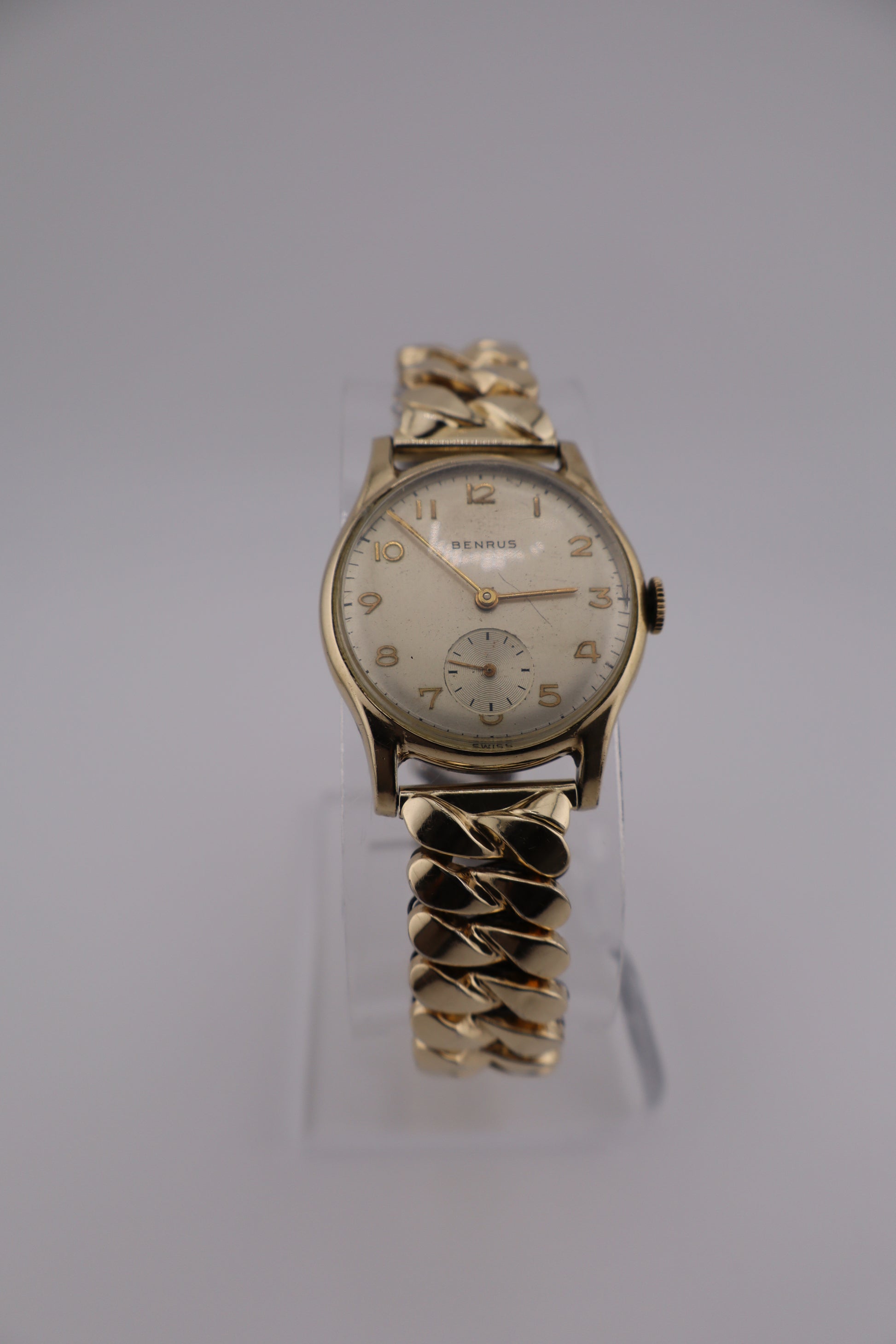 This vintage Benrus men’s wristwatch features a 10K rolled gold plate case (serial no. 600131) paired with its original Benrus Flexoband, maintaining a timeless and authentic mid-century look. The watch remains in overall good condition, showing some wear to the gold plating on the band and light signs of age across the case and dial. The crystal is mostly clear, with one visible scratch on the dial surface. The movement winds smoothly and the mainspring is healthy, with the watch running when wound, though long-term accuracy has not been tested. Benrus was one of America’s most respected watchmakers through the mid-20th century, known for elegant styling and reliable Swiss movements. This piece likely dates from the early to mid-1950s, a period when Benrus produced many of its most collectible dress watches.