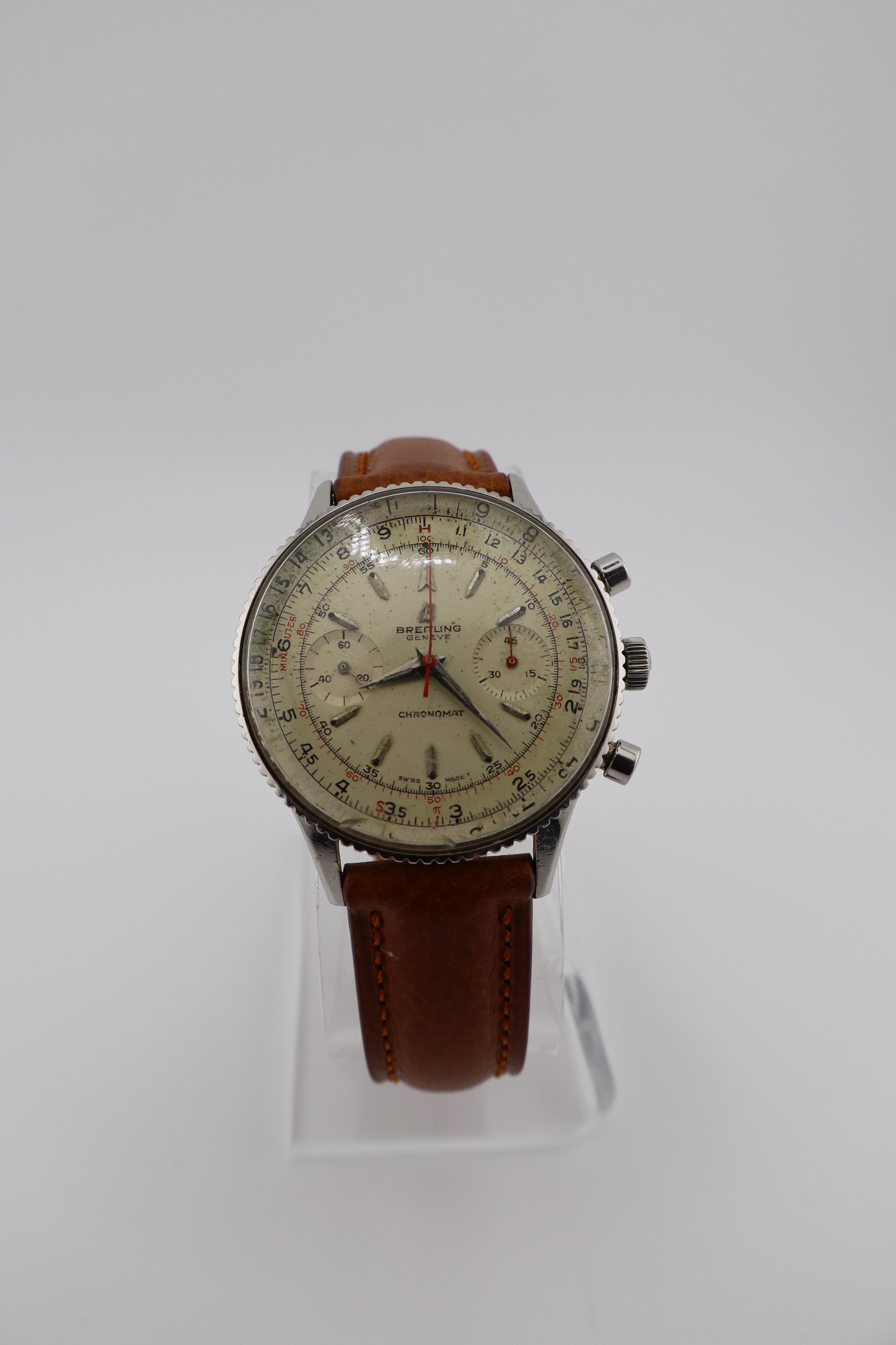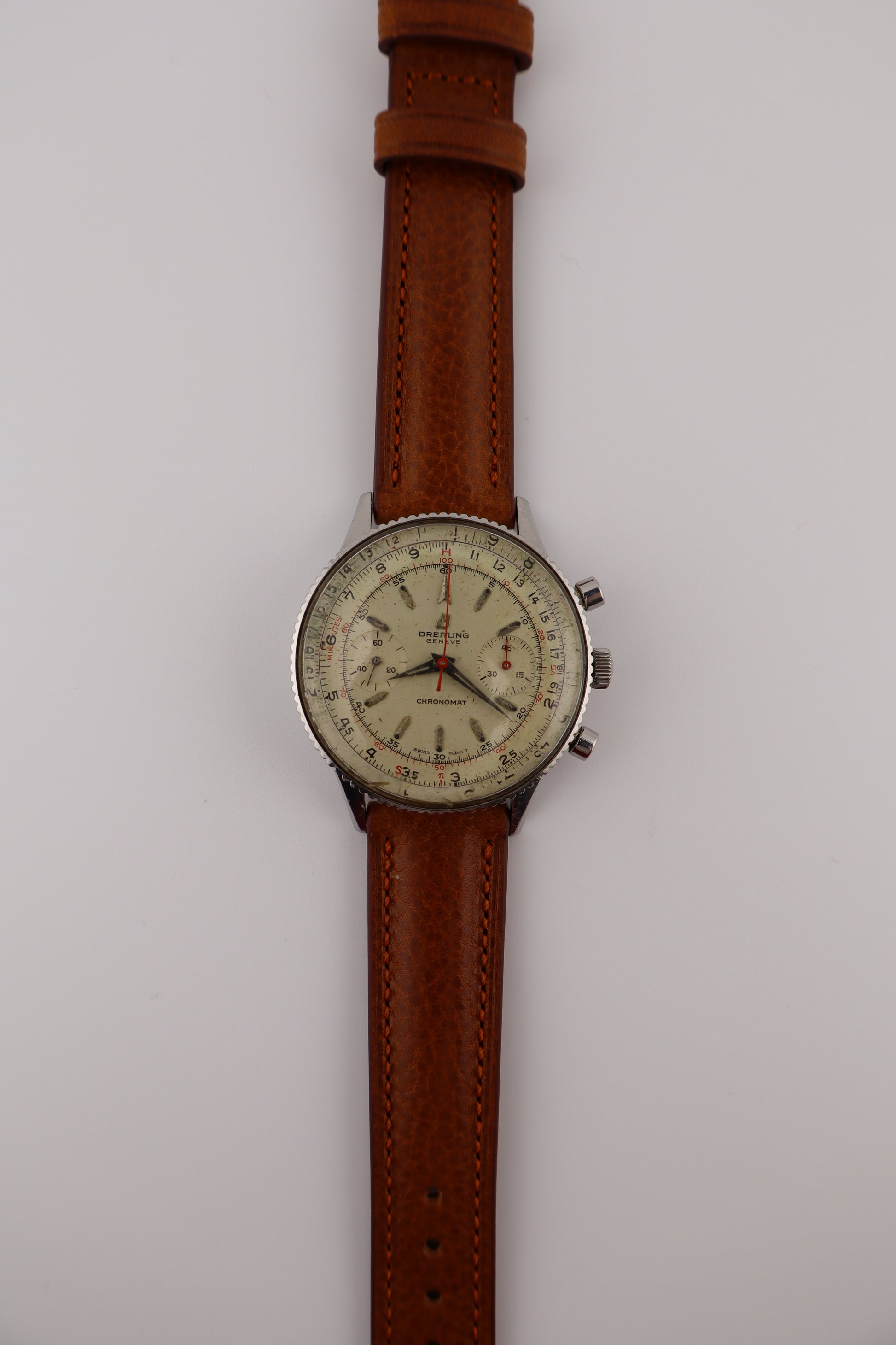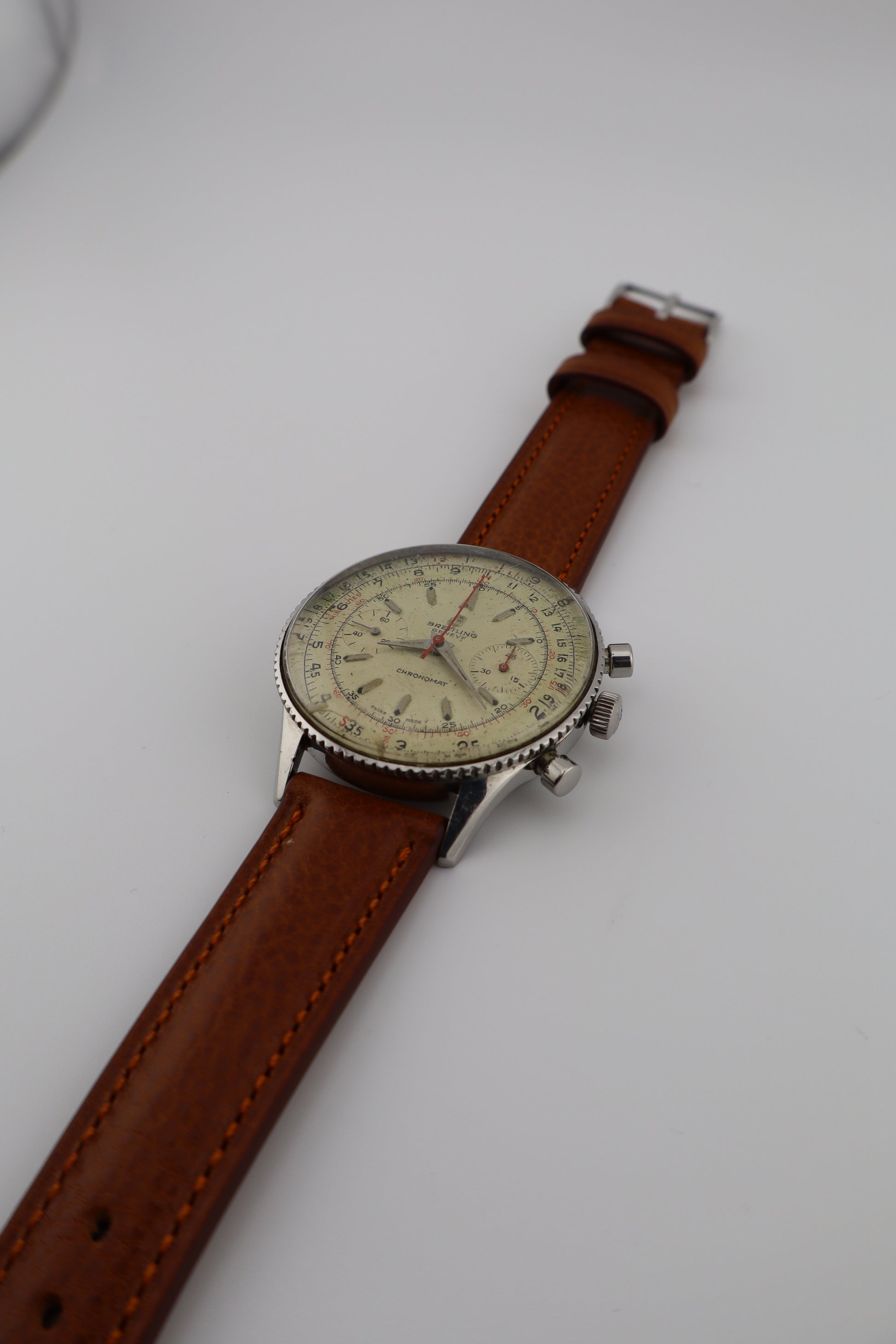 The Chronomat 808 holds a significant place in Breitling's history, representing a bridge between the brand's early chronographs and the later, more famous Navitimer series. Its design and functionality were aimed at professionals requiring precise timing and calculation tools, making it a favorite among engineers and mathematicians of the era. This vintage Breitling Chronomat Ref. 808, dating to approximately 1965, is a remarkable example of mid-century chronograph design. Powered by the renowned Venus 175 manual-wind column wheel movement, the watch is fully operational, with the chronograph functions performing as intended. The original silver dial exhibits patina and wear, particularly on the outer slide rule ring, adding character and authenticity. The red chronograph hand is slightly bent but does not impede functionality. The stainless steel case remains in strong condition, complemented by a new Italian brown leather strap. The case back bears the serial number 217012, consistent with production from the mid-1960s.