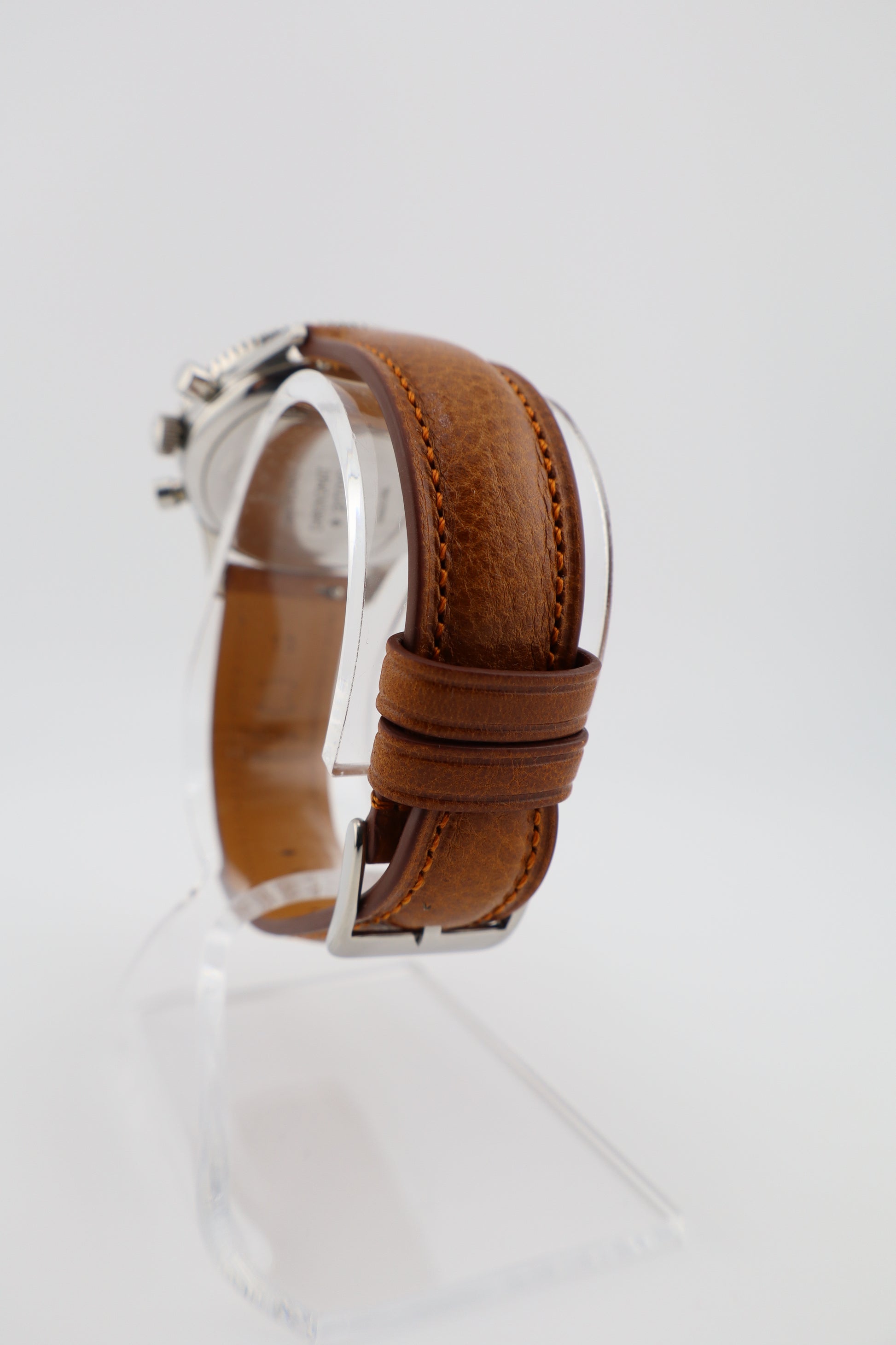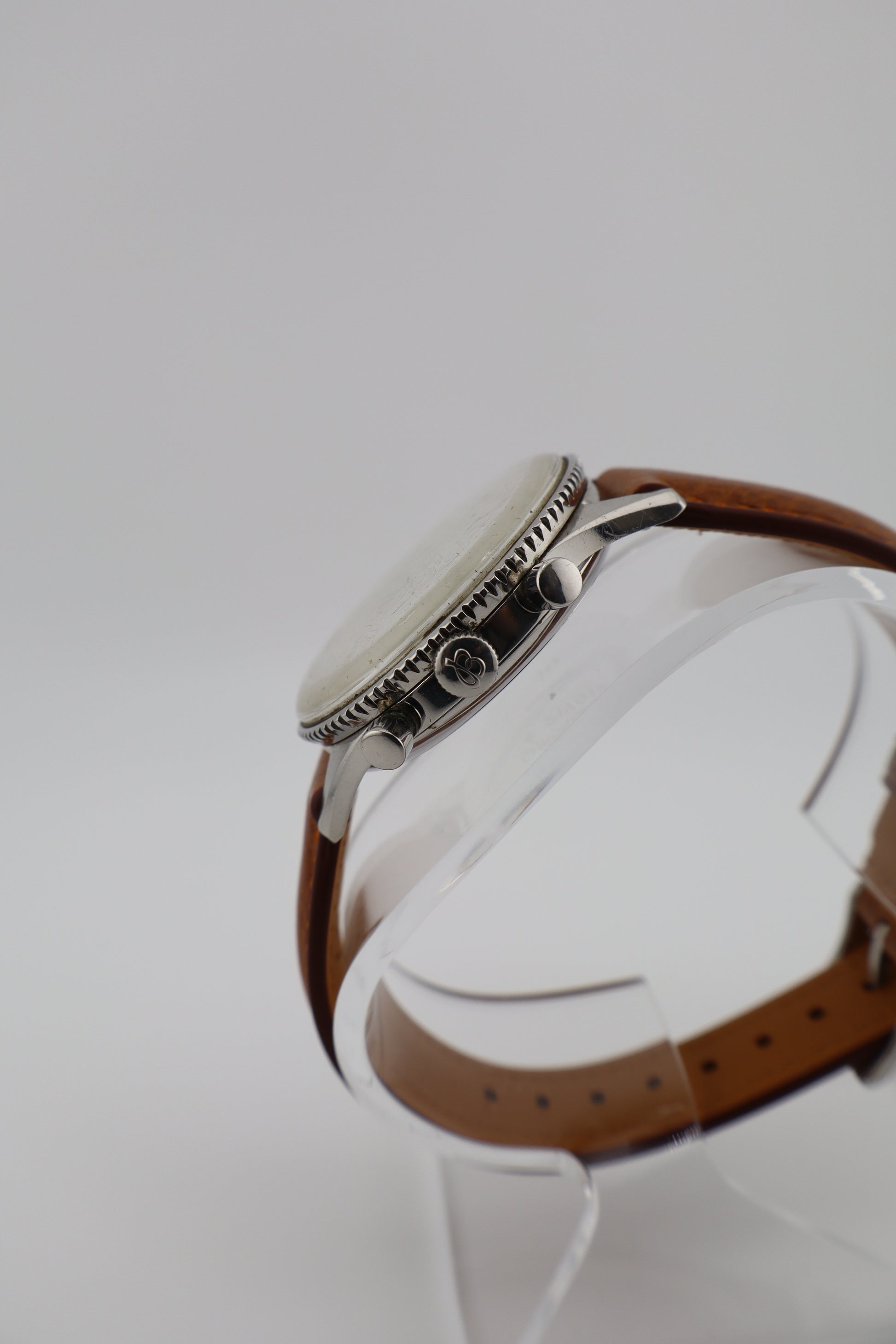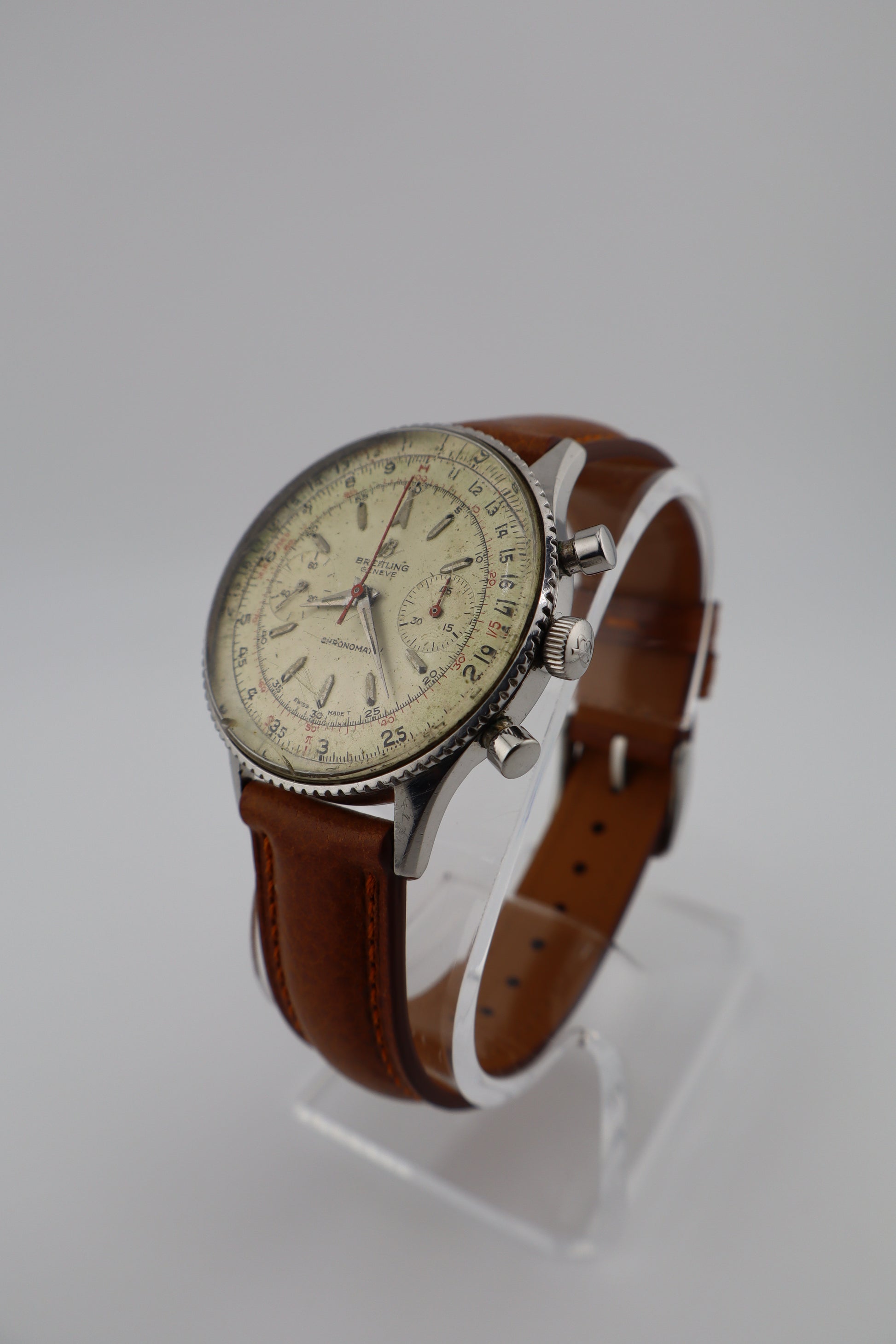 The Chronomat 808 holds a significant place in Breitling's history, representing a bridge between the brand's early chronographs and the later, more famous Navitimer series. Its design and functionality were aimed at professionals requiring precise timing and calculation tools, making it a favorite among engineers and mathematicians of the era. This vintage Breitling Chronomat Ref. 808, dating to approximately 1965, is a remarkable example of mid-century chronograph design. Powered by the renowned Venus 175 manual-wind column wheel movement, the watch is fully operational, with the chronograph functions performing as intended. The original silver dial exhibits patina and wear, particularly on the outer slide rule ring, adding character and authenticity. The red chronograph hand is slightly bent but does not impede functionality. The stainless steel case remains in strong condition, complemented by a new Italian brown leather strap. The case back bears the serial number 217012, consistent with production from the mid-1960s.