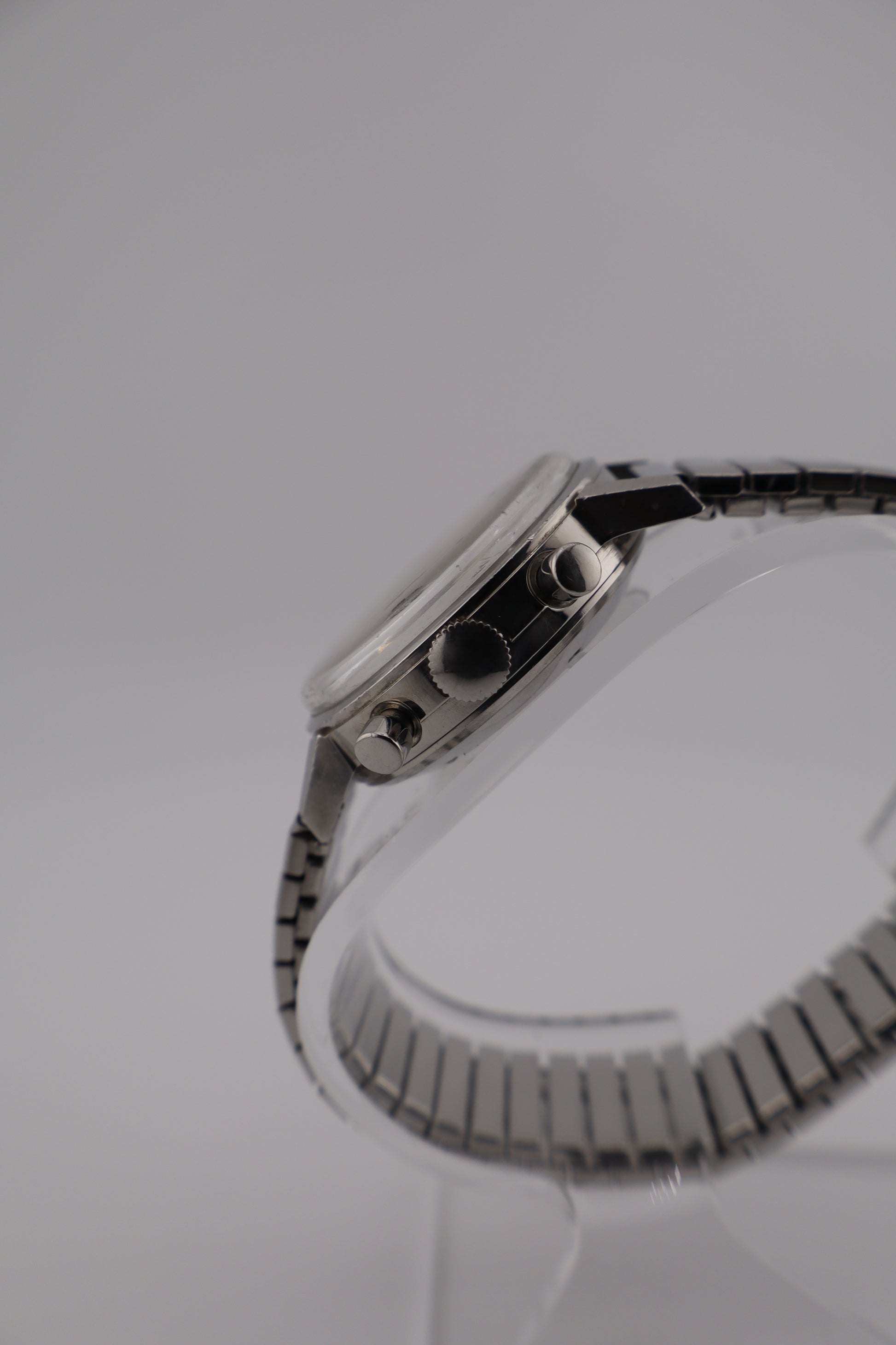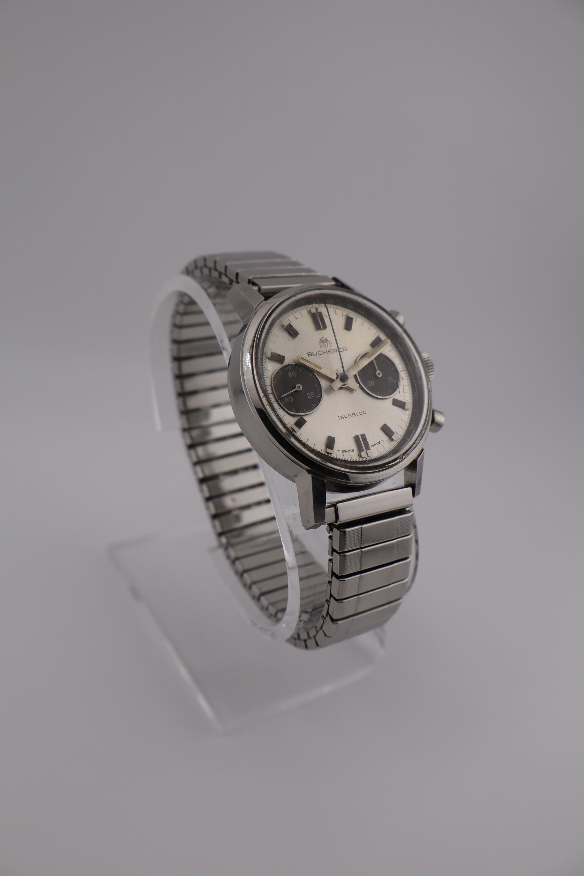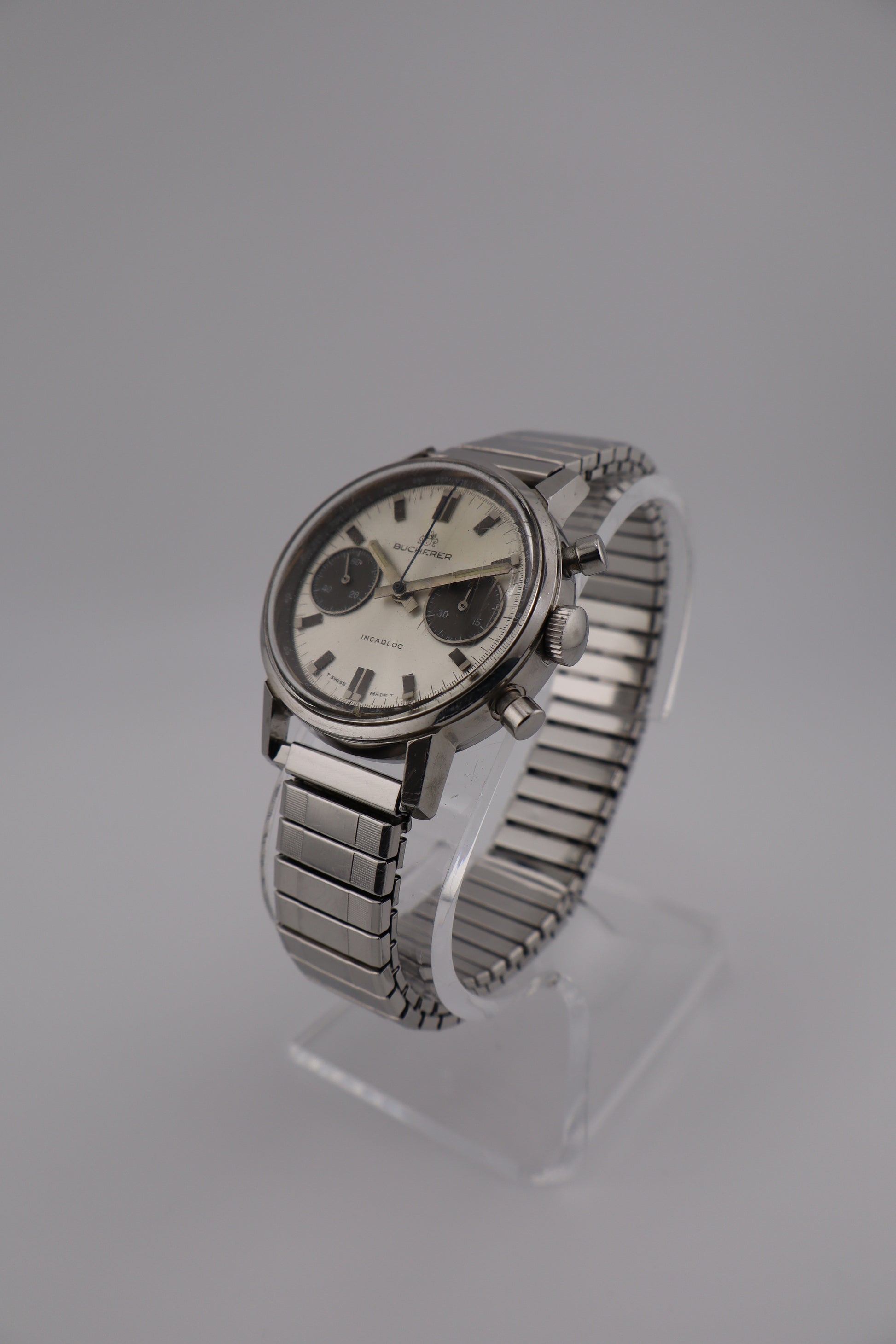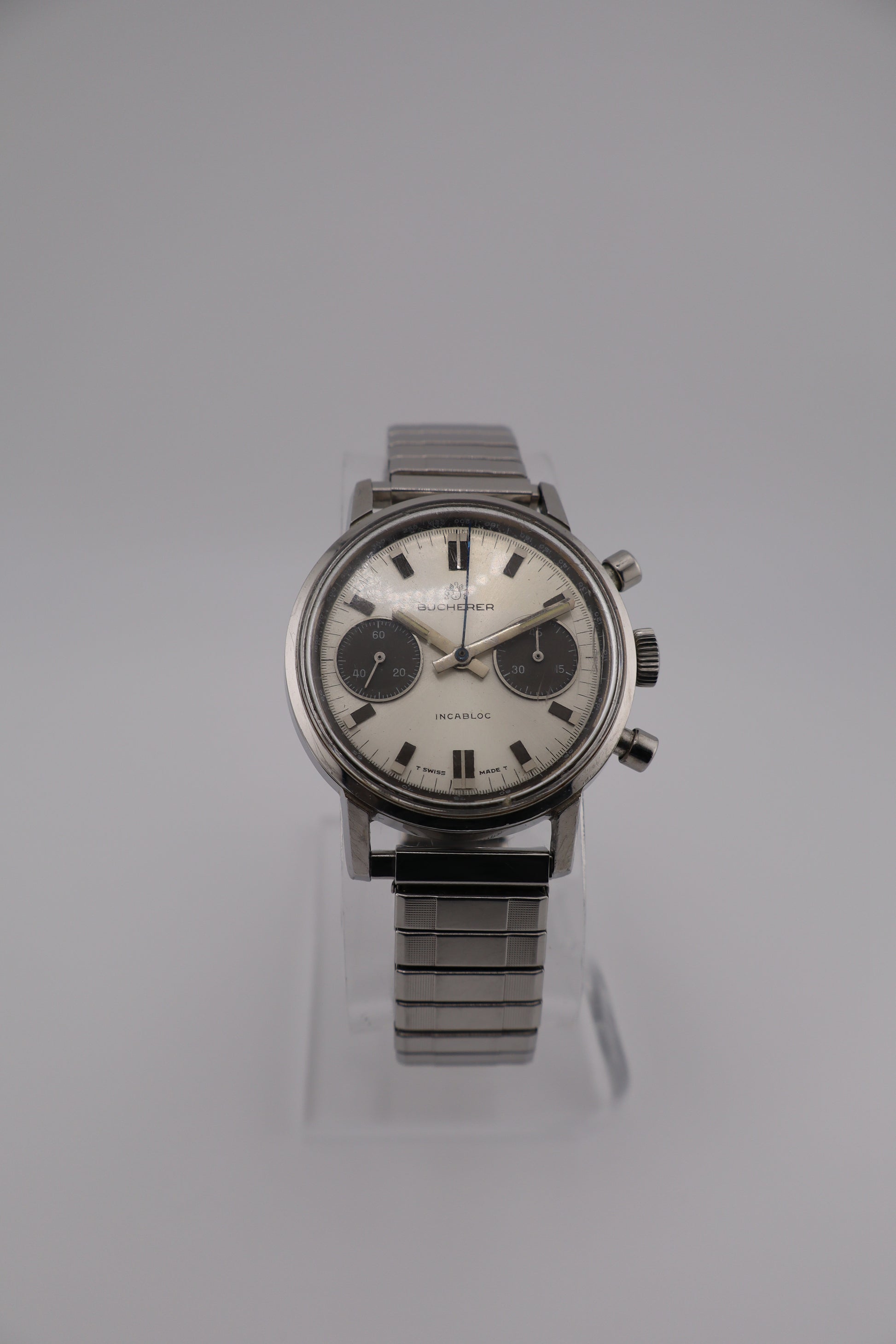 Produced in the 1960s–early 1970s, this Bucherer houses the same Valjoux 7733 caliber found in chronographs from Heuer, Breitling, and Zodiac of the era. Its panda dial layout and mechanical pedigree have made these models increasingly collectible, offering an ideal balance between vintage charm and mechanical craftsmanship. This vintage Bucherer men’s chronograph captures the essence of mid-century Swiss sport design with its panda-style dial—a silver base contrasted by bold black subdials. Powered by the legendary Valjoux 7733 manual-wind movement, this watch delivers the mechanical charm and reliability collectors look for in 1960s chronographs. The watch runs strong with solid amplitude and both chronograph pushers function smoothly. The seconds hand resets to +1 second, and the minute subdial resets just past the 45-minute mark (zero position)—both common minor variances for unserviced vintage pieces. It winds and holds charge well, though long-term accuracy has not been tested. Cosmetically, the case remains sharp and well-preserved, with minor age-appropriate wear. The acrylic crystal shows light scratches and scuffs, but maintains clear legibility. The original panda dial displays beautiful even aging, retaining its crisp print and period character.