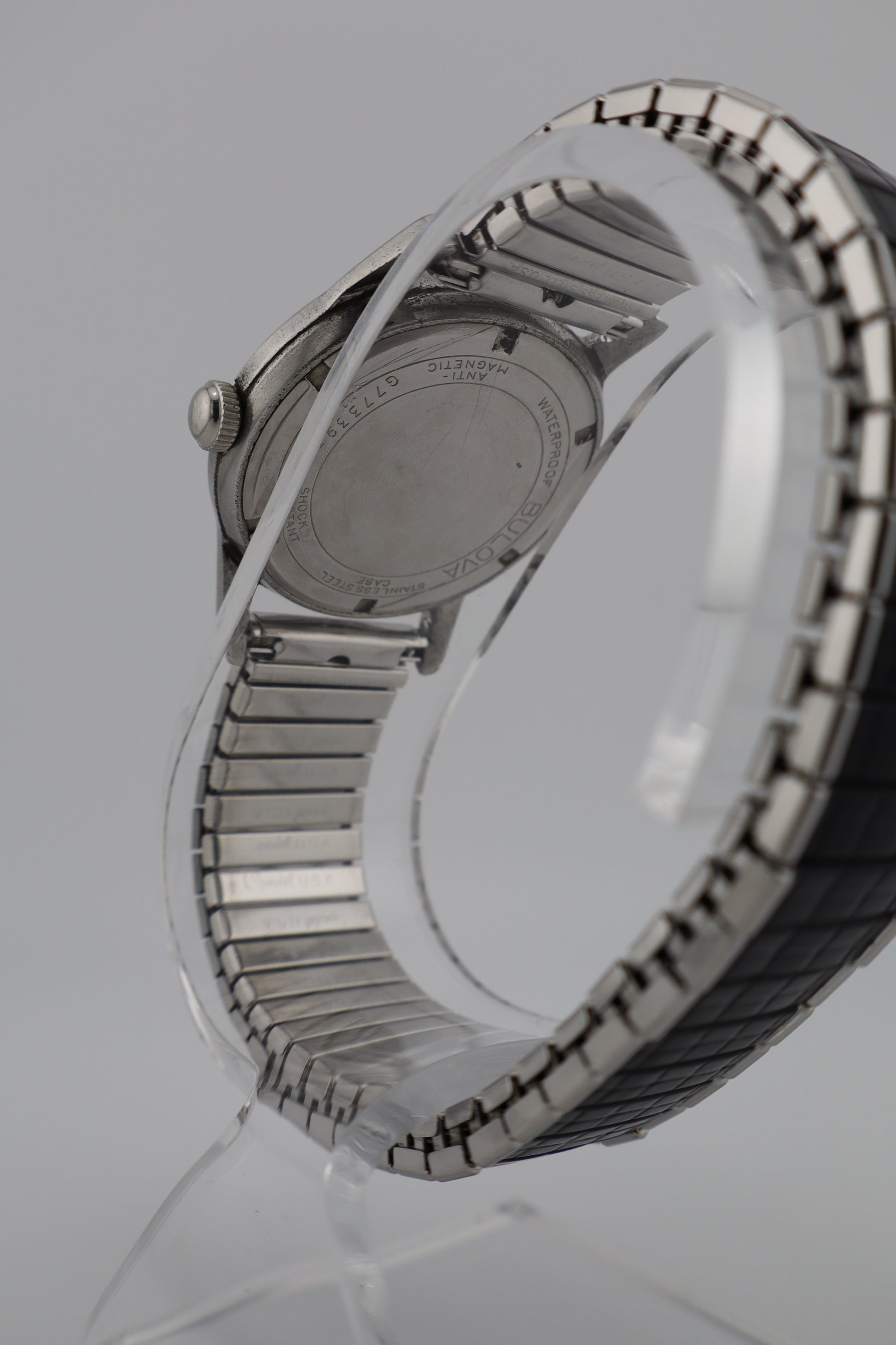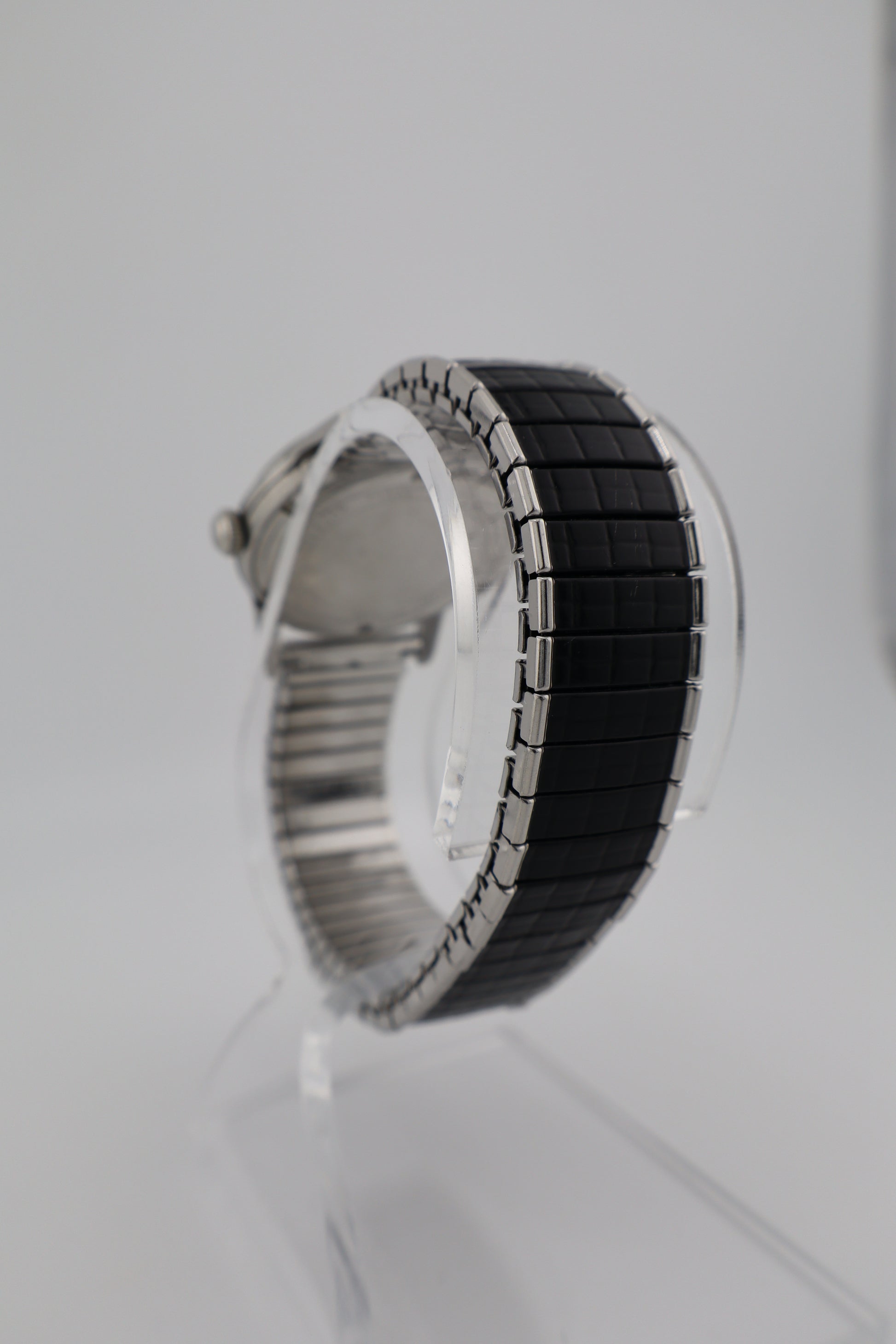 Released throughout the early 1960s, the Jet Clipper series was Bulova’s answer to the rising demand for aviation-inspired dress watches: high contrast dials, luminous numerals, and rugged waterproof construction. Black-dial examples are significantly more collectible due to their lower production numbers and their strong mid-century tool-watch aesthetic. The M3 date code places this one firmly in 1963, a golden era for Bulova mechanical watches. Up for sale is a beautifully preserved 1963 Bulova Jet Clipper (M3) featuring the highly sought-after deep black dial, a look that remains one of Bulova’s most iconic early-60s designs. This piece is in excellent working condition, recently cleaned and polished, and equipped with its time-period-correct Speidel Flex-O-Band. The dial itself is crisp and evenly aged, while the hands show light wear consistent with its 61-year vintage. The crystal is clear with only a few faint scratches around the perimeter, and the stainless case has held up remarkably well. On the timegrapher, this Jet Clipper showed a strong performance with modest amplitude, moderate beat error, and a low daily variation rate, indicating a well-running movement (long-term accuracy not guaranteed).