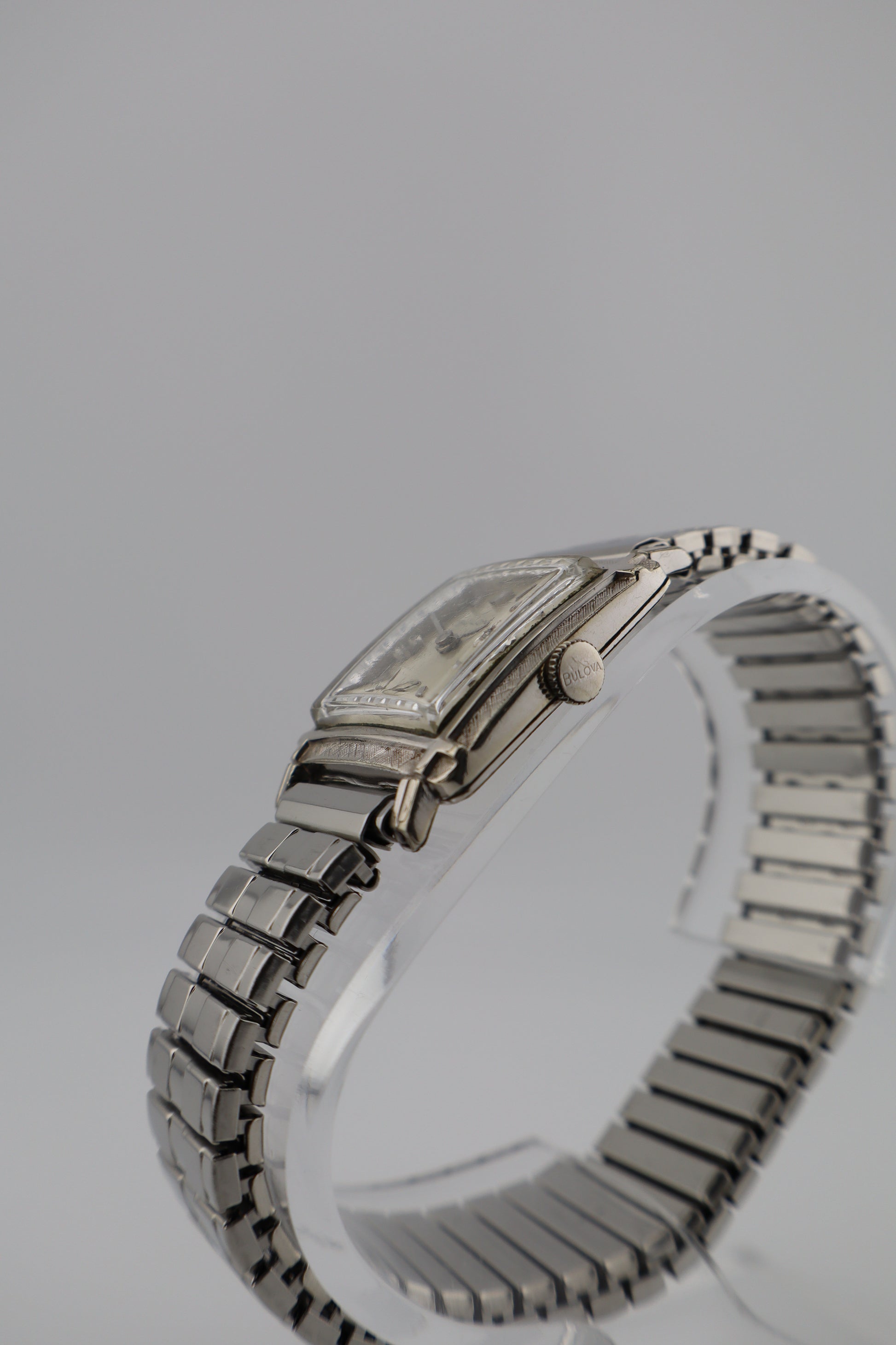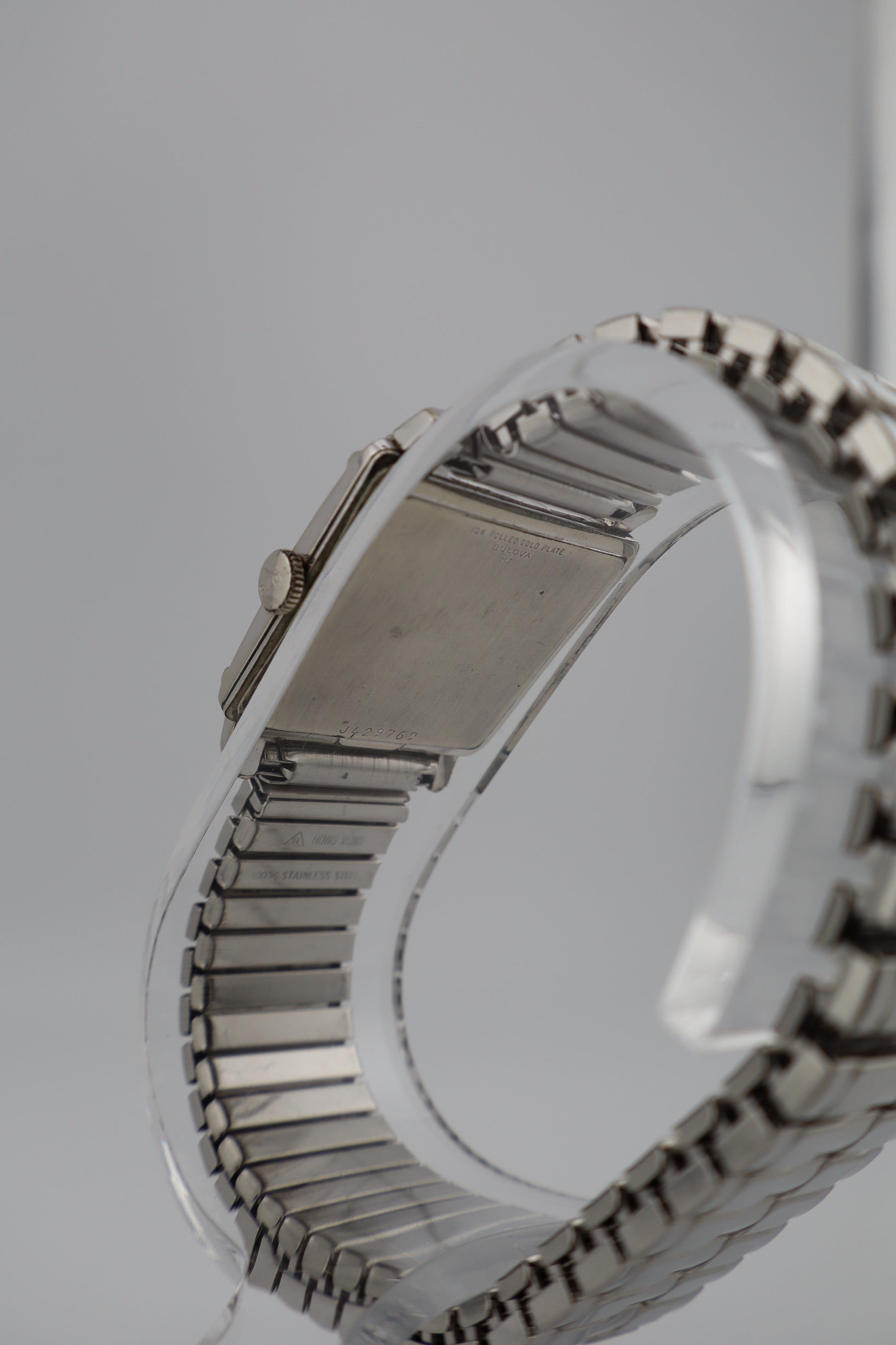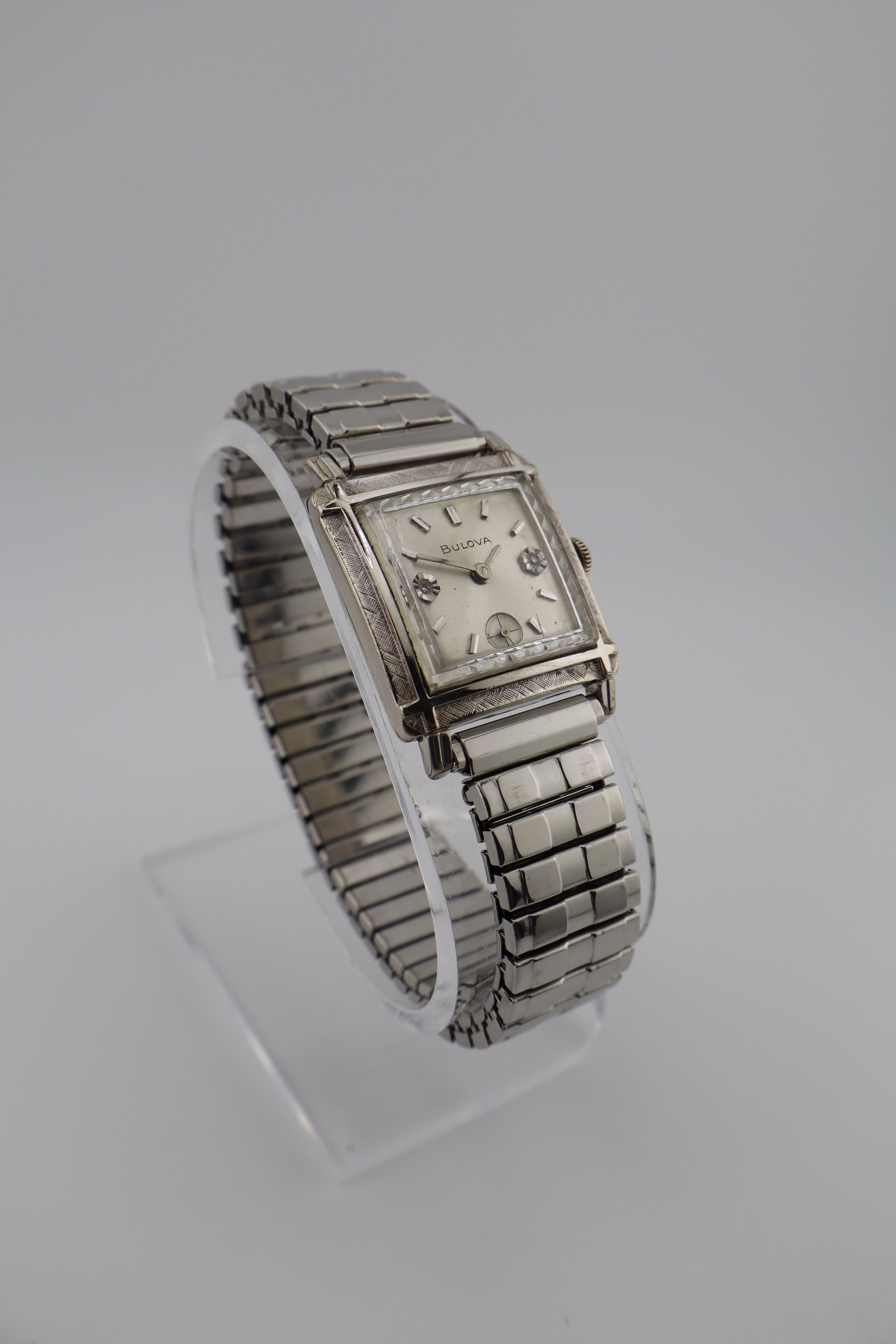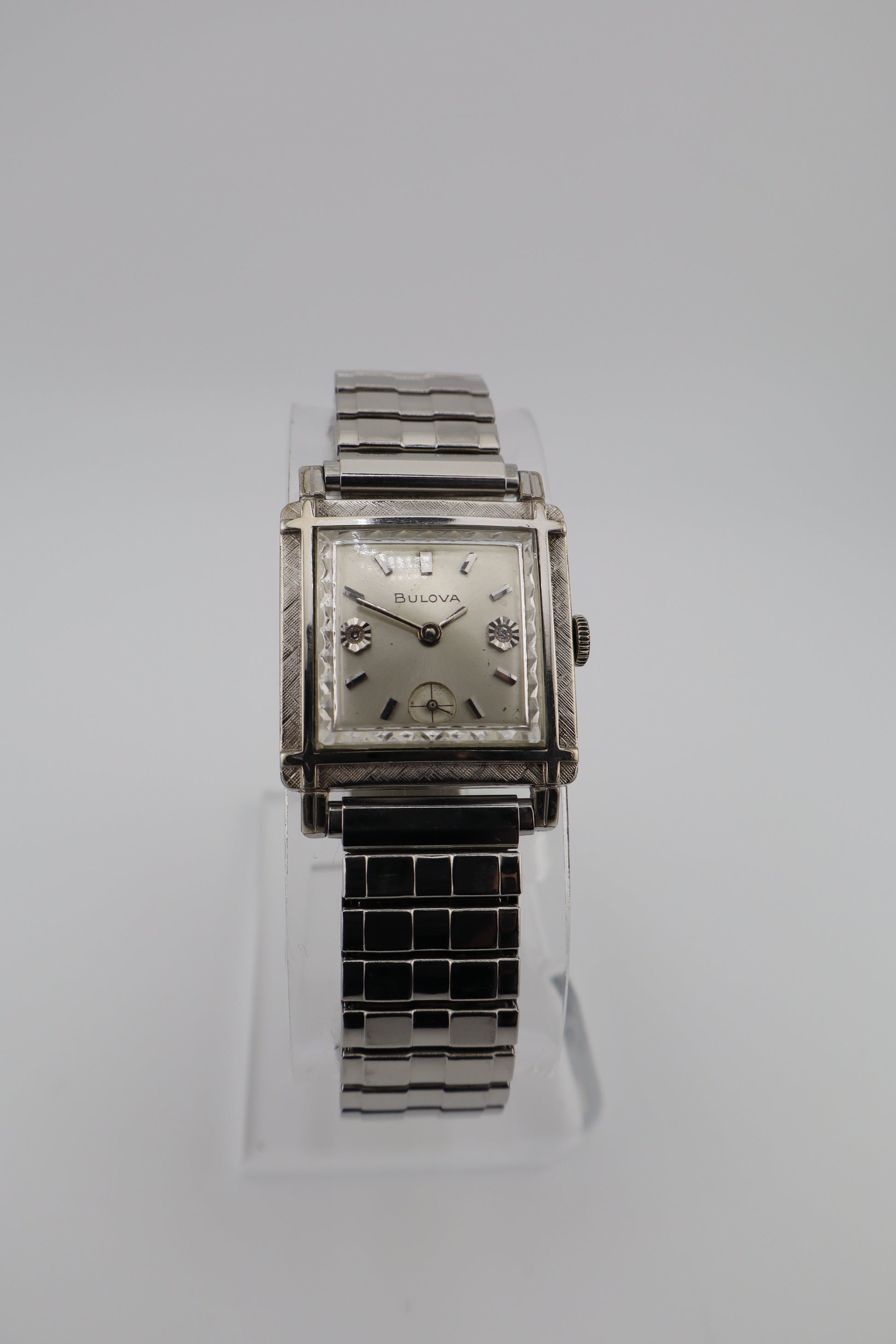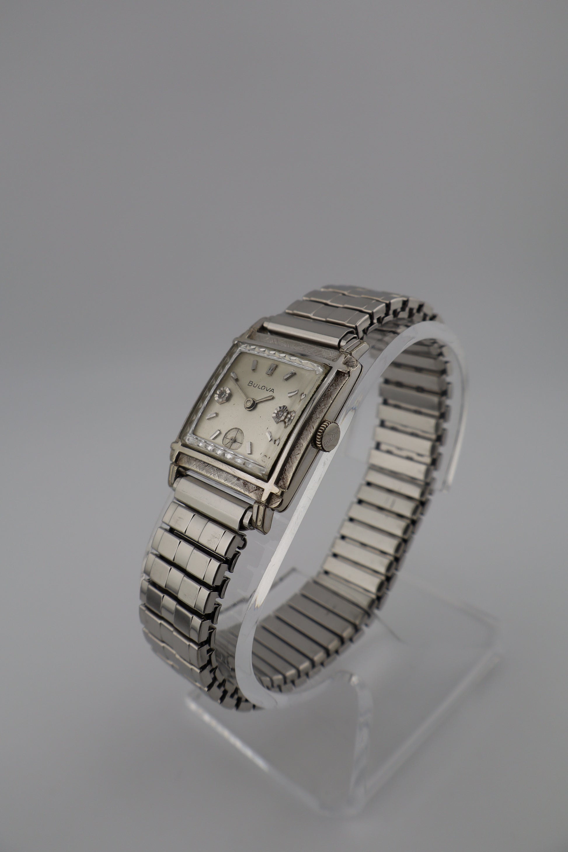 Offered here is a vintage 1964 Bulova Diamond Excellency men's tank watch, featuring a 10K white gold plated case with a finely engraved Florentine bezel. This elegant piece stands out with genuine diamond markers at the 3 and 9 o'clock positions, a sunburst silver-tone dial, a sub-seconds register at 6 o'clock, and raised hour markers. Powered by a manual wind Bulova movement, this watch is currently running but has not been tested for long-term accuracy. The case, dial, and crystal are in very good condition with light signs of age-appropriate wear. It comes paired with a period-correct expansion bracelet for a comfortable and classic fit. Serial number J429769 confirms its 1964 production year. A beautiful vintage timepiece that embodies the sophisticated mid-century style Bulova is celebrated for.