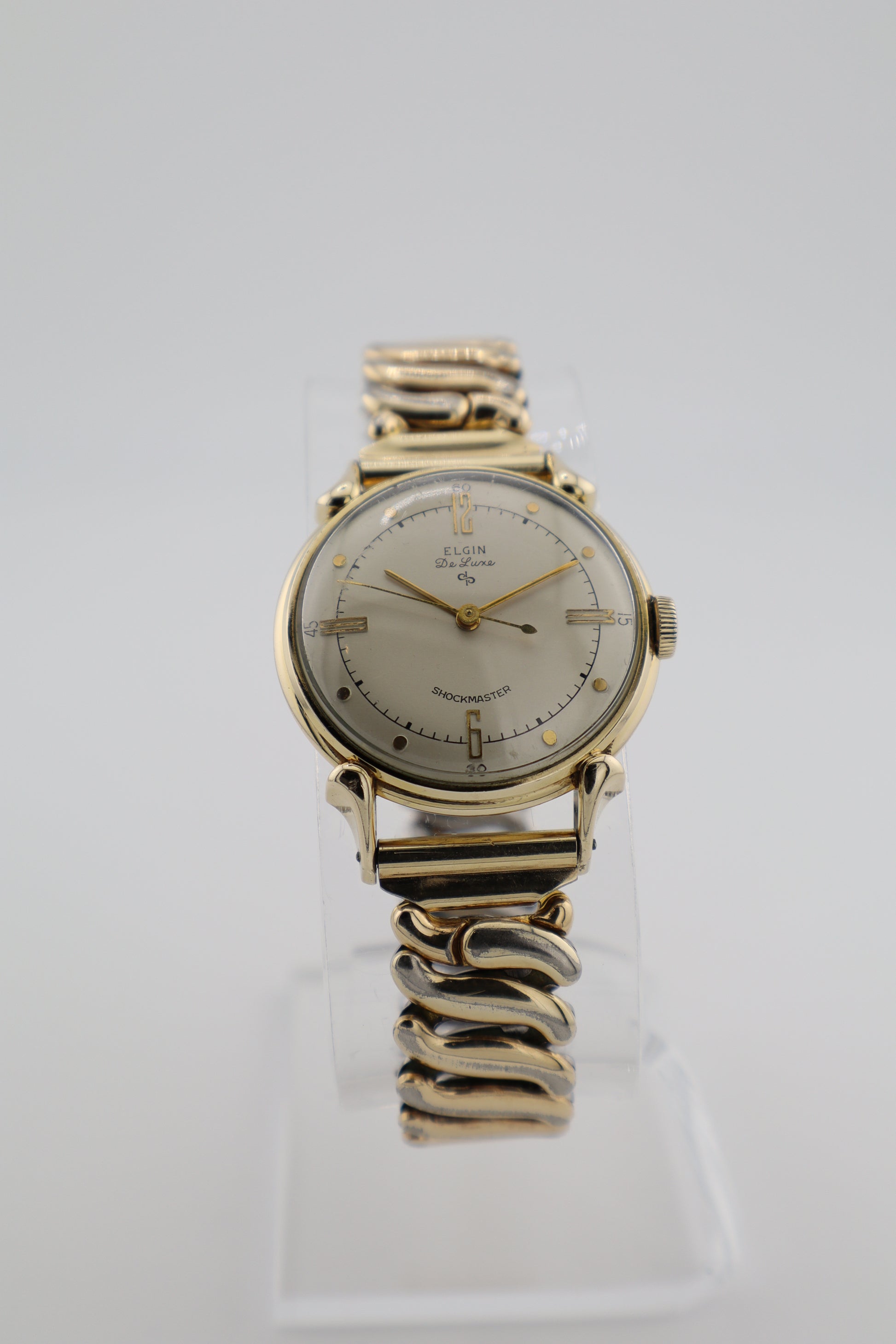 Beautifully preserved 1950s Elgin De Luxe Shockmaster men’s manual-wind watch powered by the Elgin Cal. 685 (18 jewels)—a classic example of American watchmaking with a clean, timeless dress profile. The 31mm case (without crown) is 10K gold filled and presents in fantastic condition with strong lugs and only minimal signs of prior wear. The crystal shows light scuffs consistent with age, while the dial remains very attractive and well-kept with elegant gold-tone hands/markers and the “Shockmaster” signature. Fitted with a period-correct Flex-let expansion bracelet inscribed 1946 and marked 12KT gold filled; it shows some honest wear but still retains a nice shine and pairs perfectly with the watch. The watch has been tested and is running, showing timegrapher results around +2 minutes/day, ~180° amplitude, and ~0.8 ms beat error—good overall function for its age, with routine service recommended if you want peak accuracy.