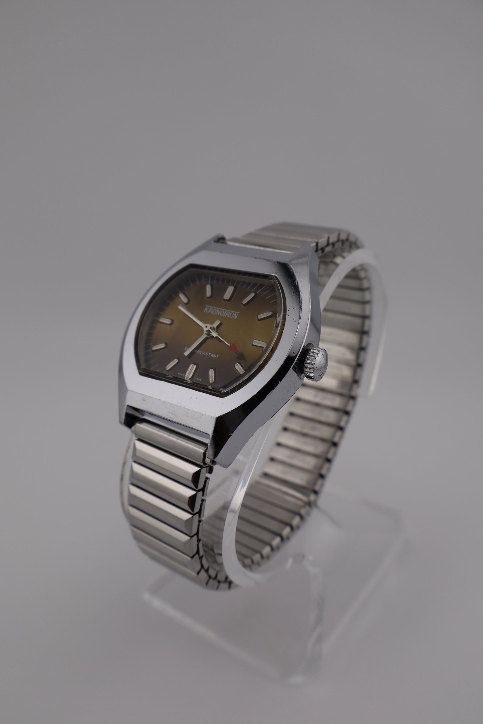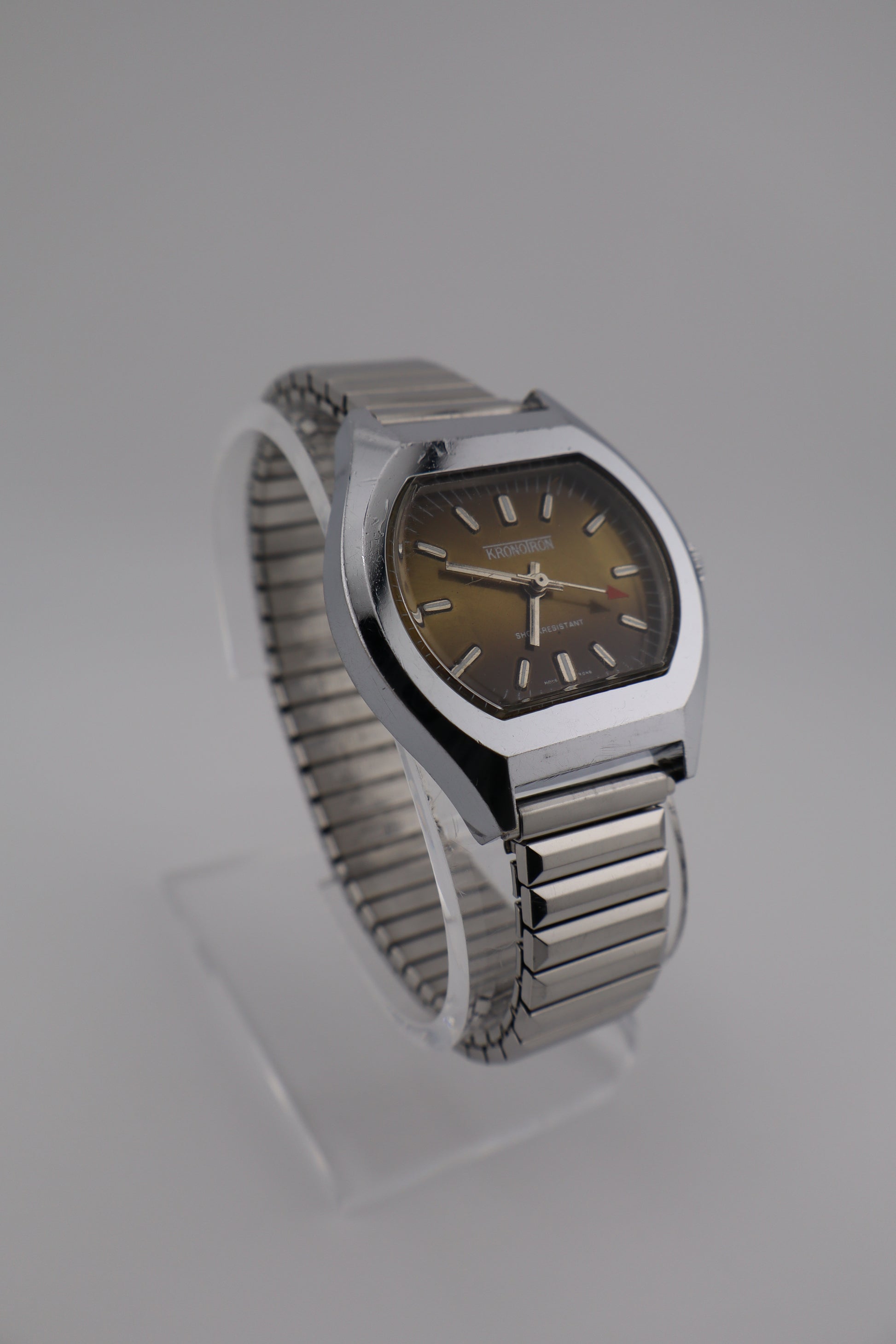 This vintage Kronotron men’s mechanical watch offers a bold and distinctive 1970s aesthetic, featuring a brown gradient dial with luminous hour markers, arrow-tipped seconds hand, and a sturdy stainless-steel expansion bracelet. The watch winds smoothly, holds a healthy charge, and functions properly, though its long-term timekeeping accuracy has not been tested. The piece shows moderate wear consistent with age, including some light scuffing on the crystal, case, and bracelet, but retains strong vintage character and full legibility. Kronotron was one of several smaller European and American watch brands active in the mid-to-late 20th century, known for their distinctive mechanical timepieces and utilitarian styling. This model captures the retro-futuristic design language of the 1970s, with its angular case, bold dial coloration, and chrome-finished surfaces.