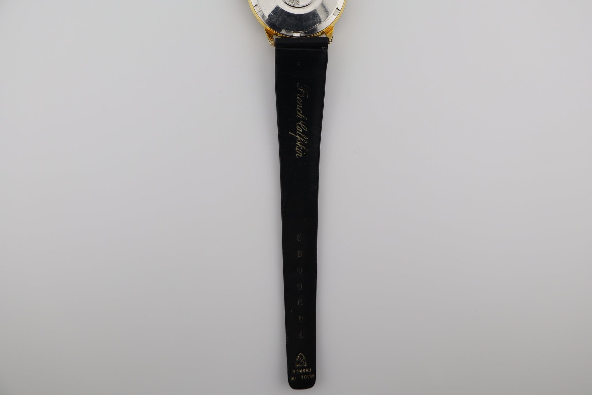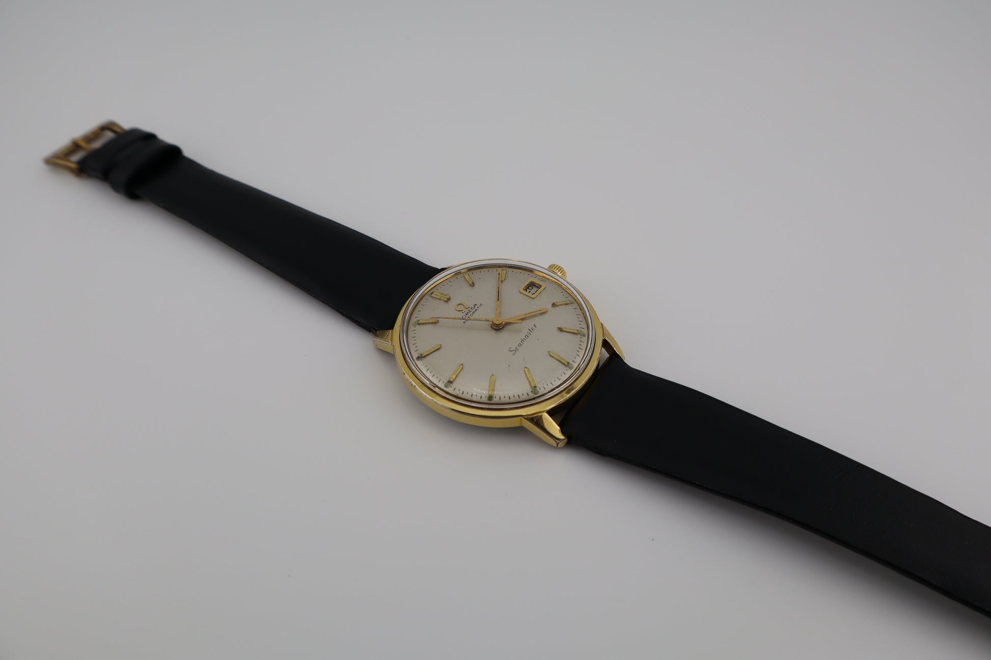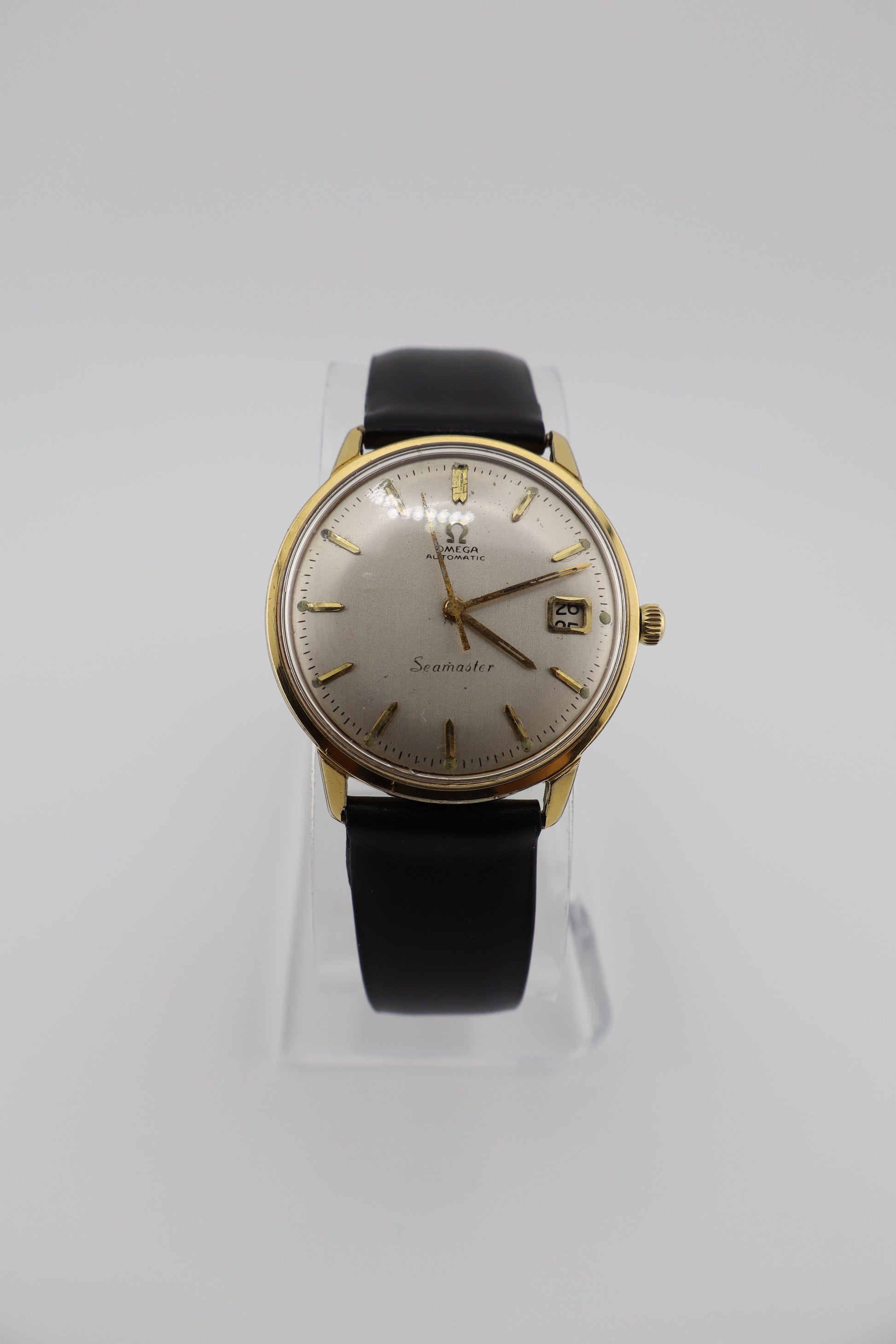 This vintage Omega Seamaster is a stunning example of classic Swiss craftsmanship, featuring a 40-micron gold-plated case with a stainless steel back and a robust 24-jewel Omega Cal. 562 automatic movement. The silver dial has developed a soft patina, giving it an elegant vintage appeal, with gold-tone indices and hands maintaining a sophisticated contrast. A date window at the 3 o'clock position is not functional, while the time function is working accurately. The case shows only light wear aside from two lugs exhibiting noticeable wear, but the original Omega acrylic crystal has only minor signs of previous use. The watch is paired with a brand-new, vintage 1960s French-made calfskin leather band, complementing its refined aesthetic. This model, reference 166.001, is highly collectible and sought after, especially in this well-preserved condition with its original movement working accurately. The Omega Seamaster 166.001 is a desirable model among collectors, with its Caliber 562 movement recognized for reliability and smooth automatic winding. The 40-micron gold plating was a premium feature in the 1960s and is often worn down over time, making well-preserved examples like this more valuable. The new-old-stock calfskin band enhances its appeal as a true period-correct piece.