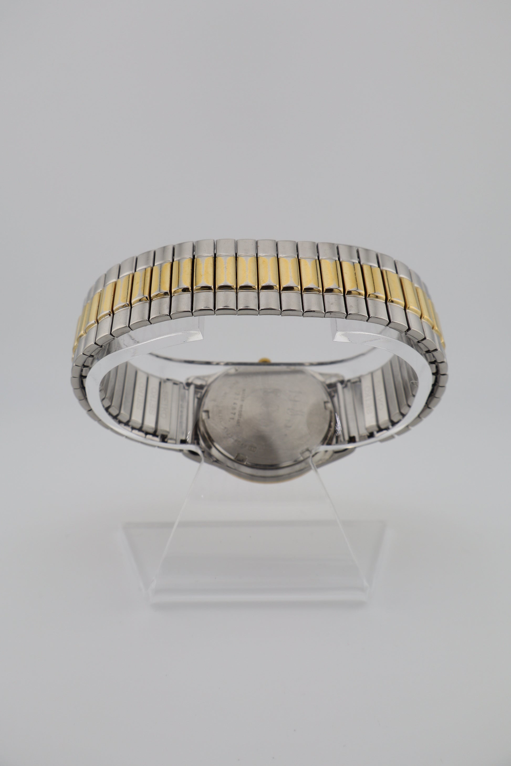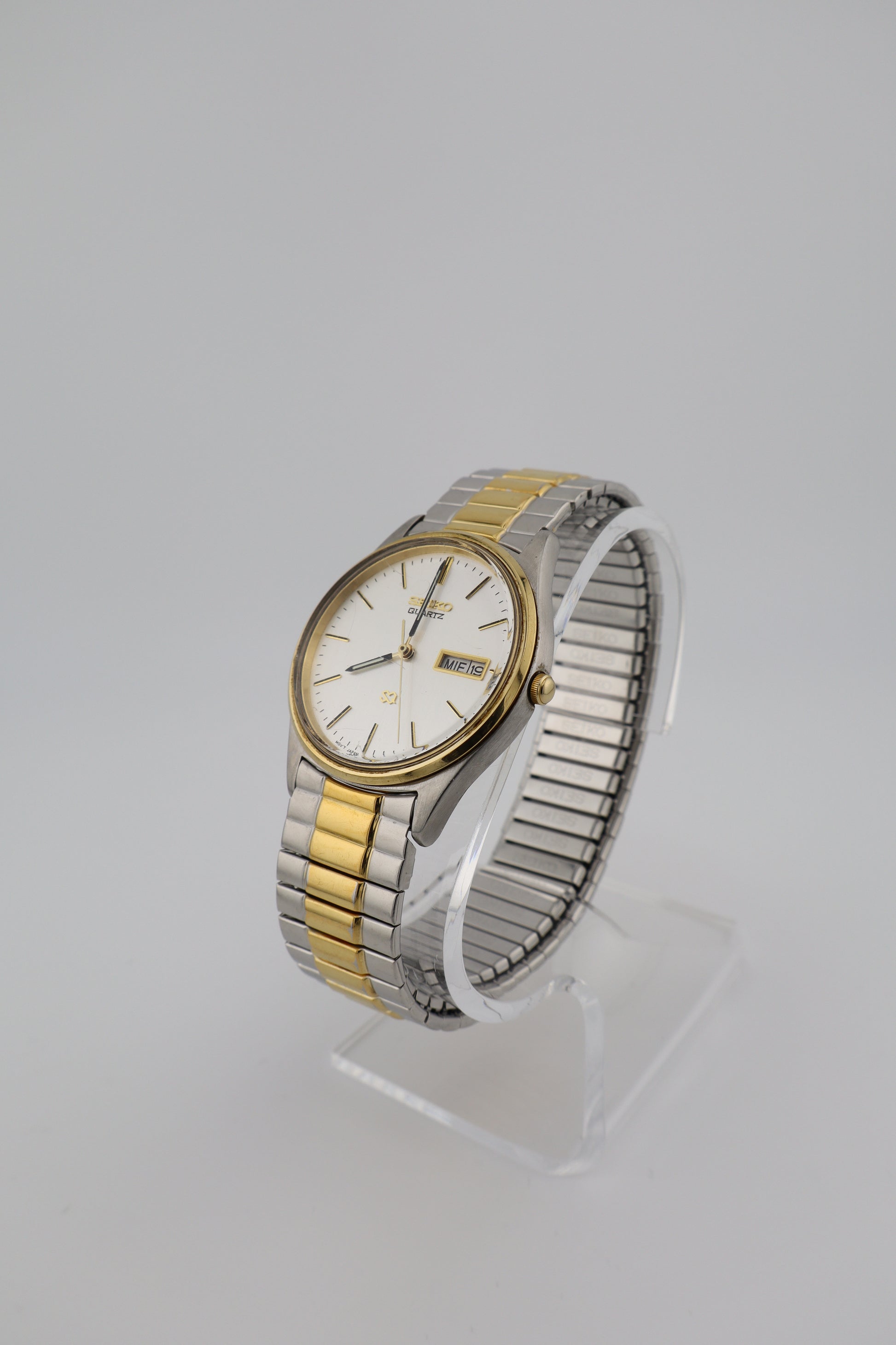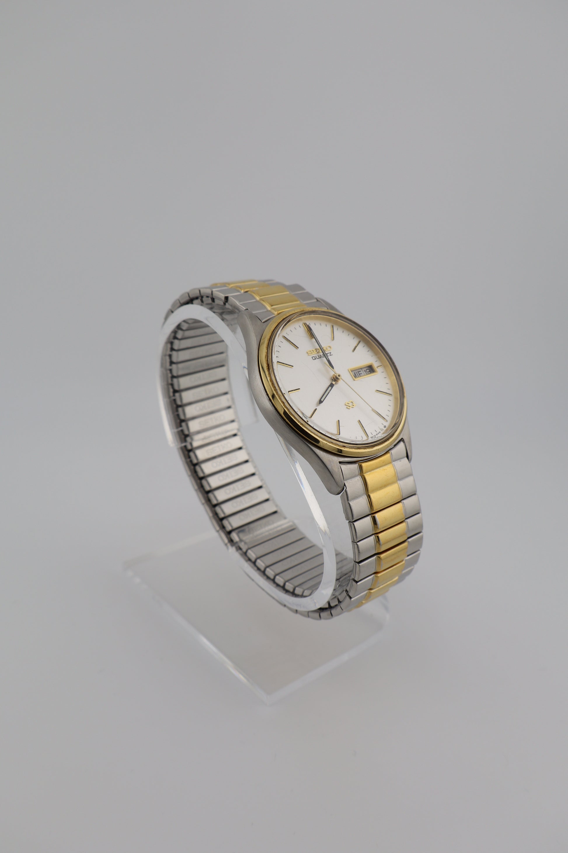 This vintage Seiko SQ Quartz offers a clean white dial with simple black stick markers and gold-tone hands. The day-date complication sits at 3 o’clock, and the watch is paired with its original Seiko two-tone expansion band. A great piece for everyday use with timeless styling and practical functionality. This watch is in excellent cosmetic condition, showing only light wear to the case and bracelet, though one of the links in the flex-o-band has become slightly disconnected. The crystal has some small surface scratches but does not affect visibility. The watch runs on a new battery, though it hasn’t been tested for long-term accuracy. A personal inscription commemorating a 19-year work anniversary is present on the case back.