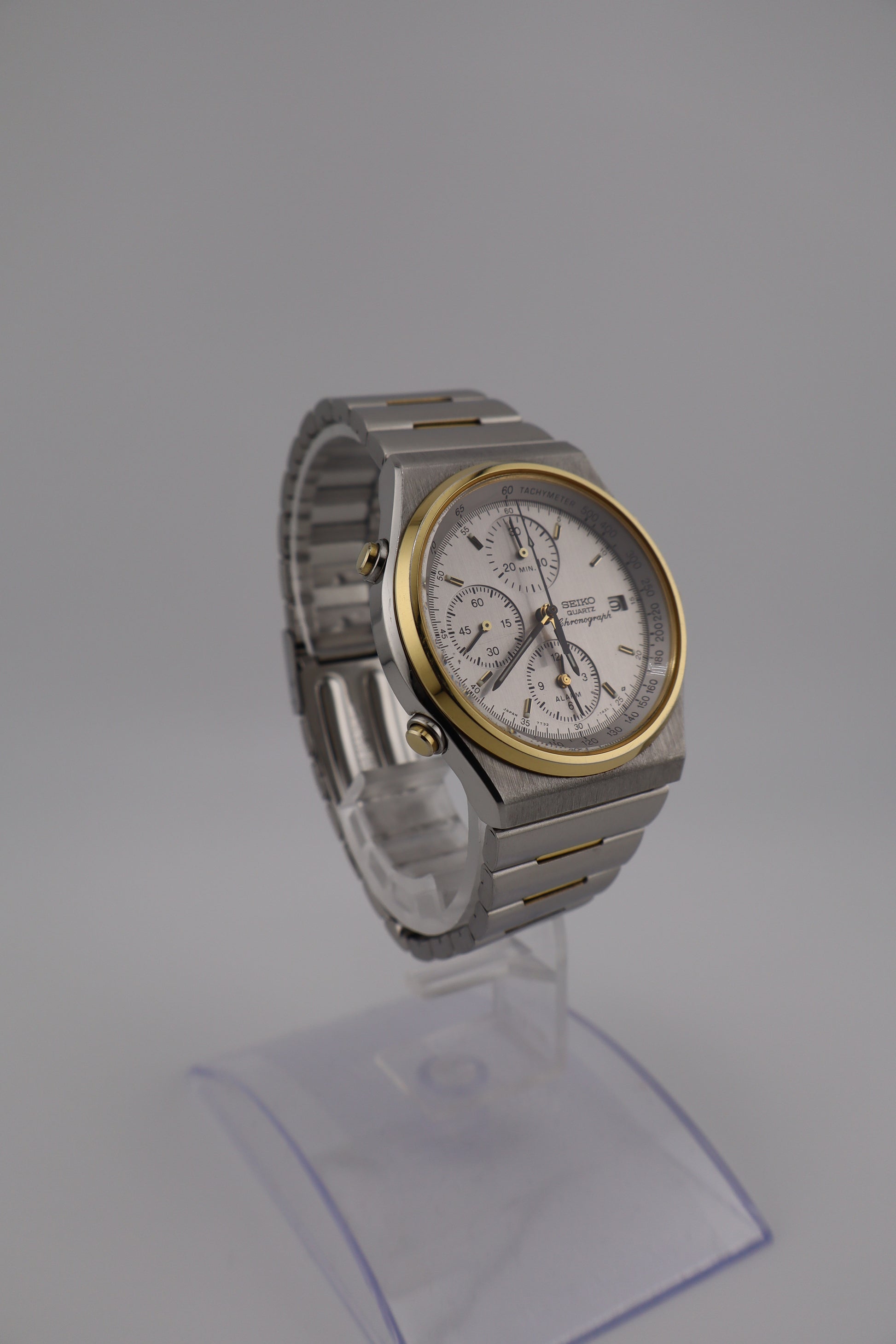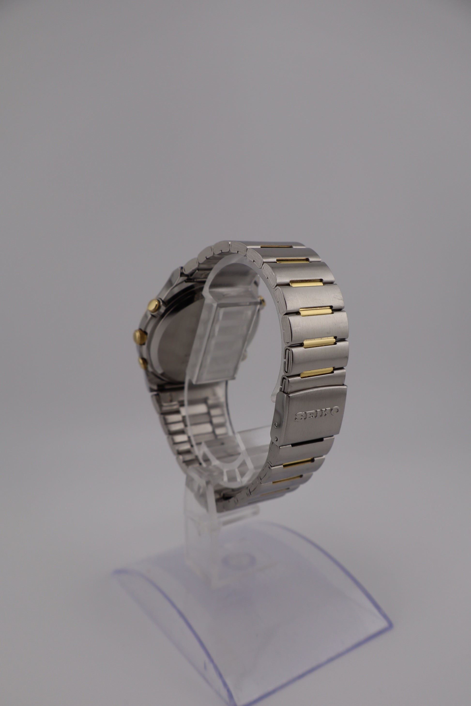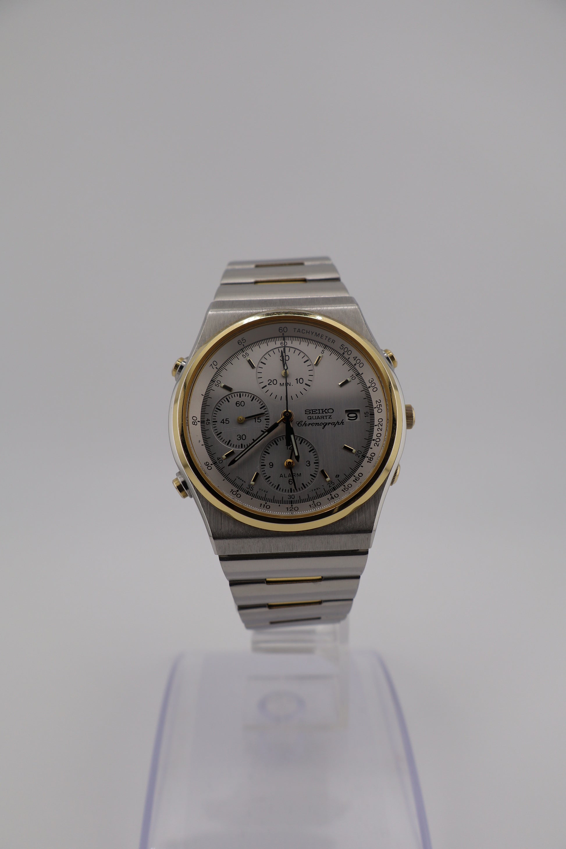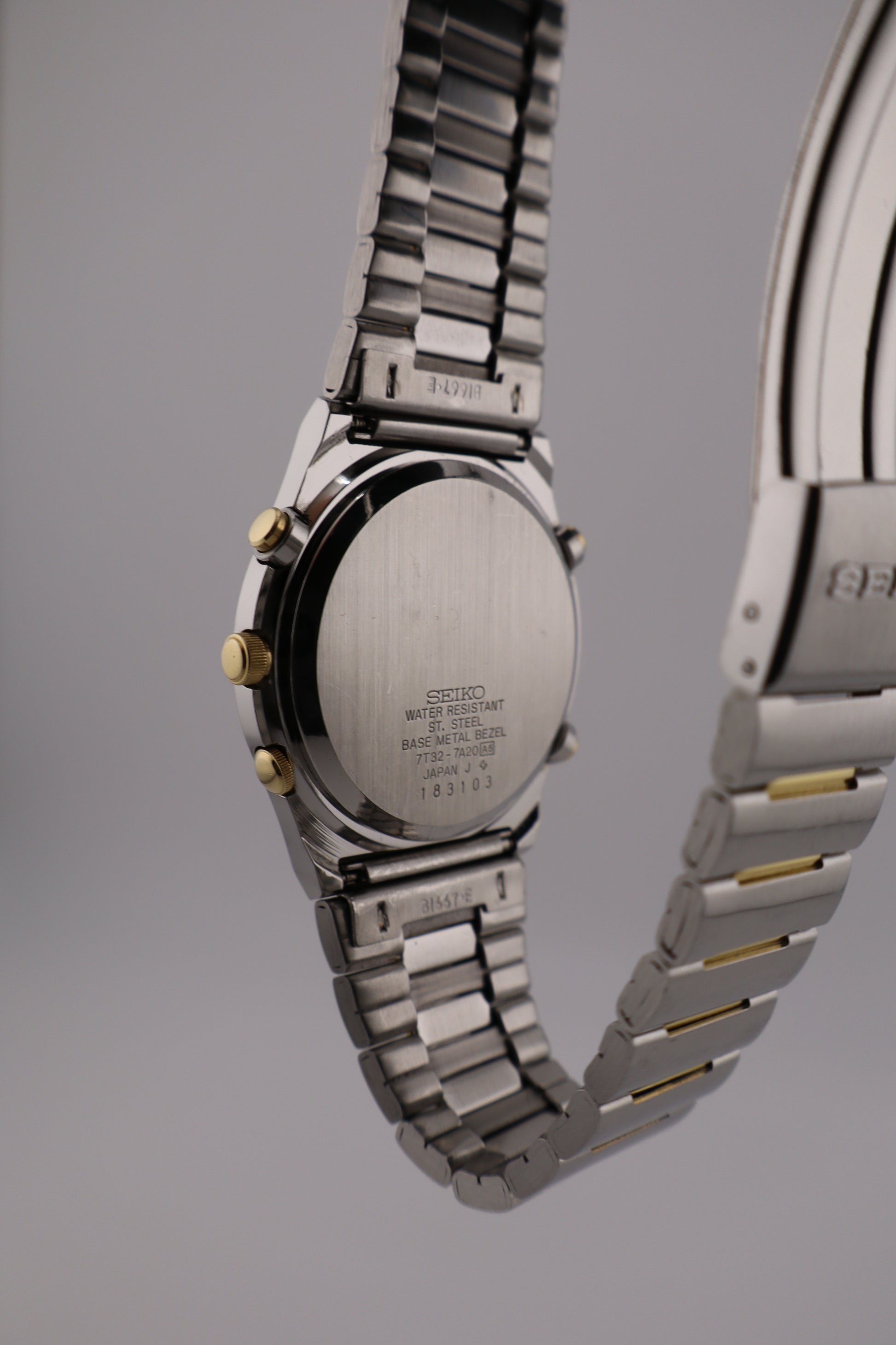 This vintage 1991 Seiko Chronograph Alarm (ref. 7T32-7A20 / serial 183103) showcases Seiko’s early-’90s precision design, blending modern quartz reliability with elegant styling. The brushed stainless-steel case features a gold-tone bezel and matching accent links, framing a silver dial with triple sub-register layout, date window at 3 o’clock, and full tachymeter scale around the outer ring. All features — chronograph, alarm, and time functions — operate properly, and the watch is fitted with a fresh battery. The case, crystal, and original bracelet remain in excellent condition with only very minor hairline scuffs from gentle previous use. Seiko’s 7T32 series, introduced in the late 1980s, was among the brand’s most advanced quartz chronographs — offering stopwatch, split-time, and alarm functions in a slim, angular case. The design remains highly collectible for its precision engineering and its distinctive integrated-bracelet style reminiscent of Seiko’s contemporary Speedmaster-inspired line.
