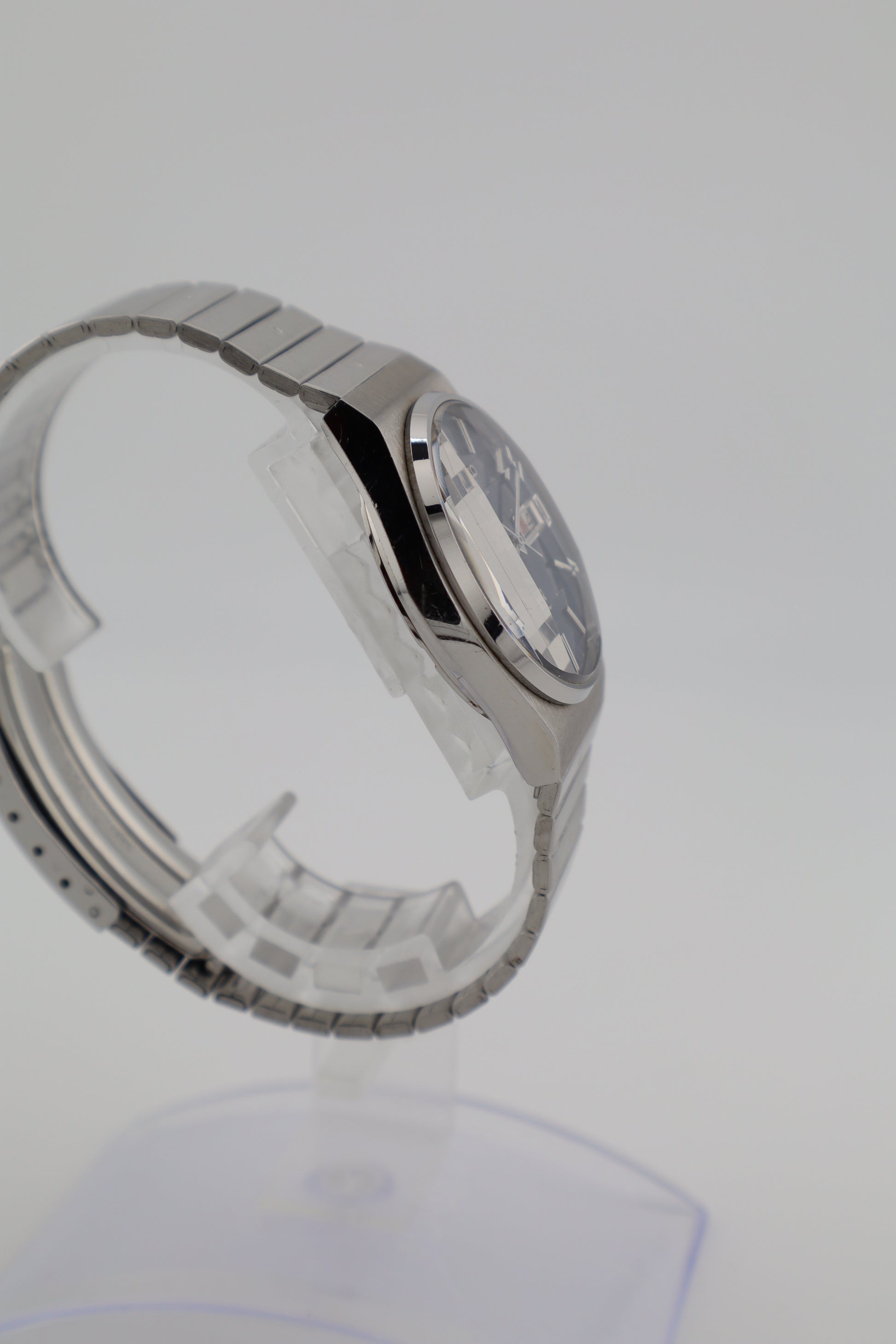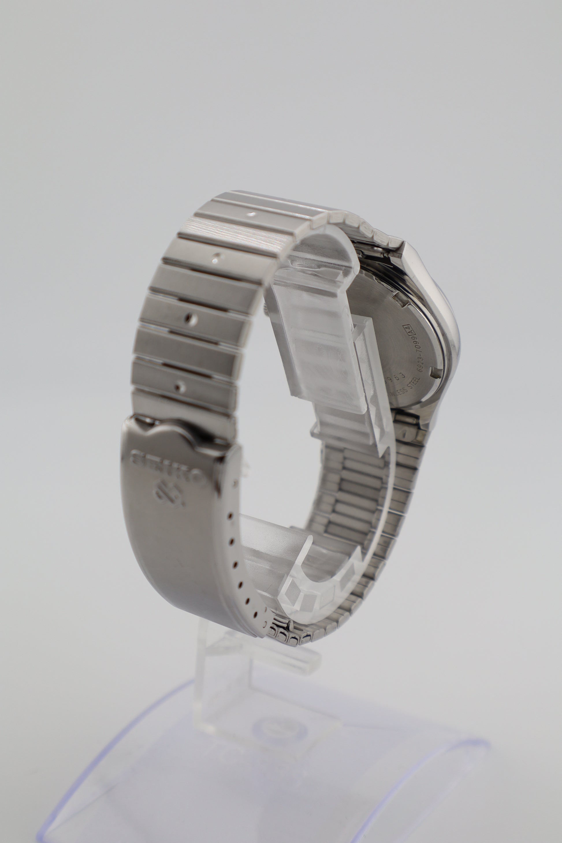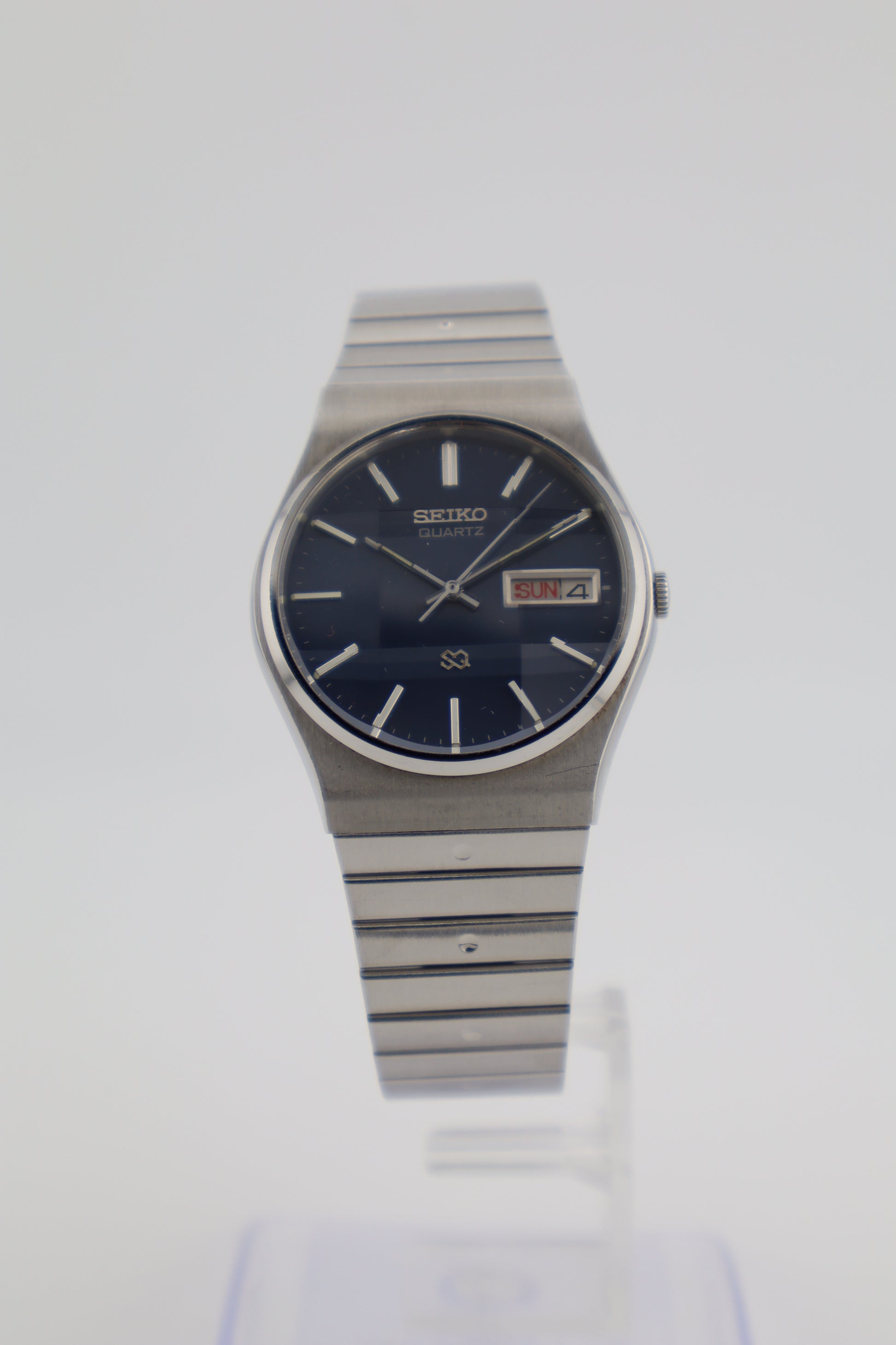 Vintage Seiko SQ quartz day/date wristwatch in near-mint condition featuring a deep blue dial, angular case design, and the correct original hexagonal crystal, which presents exceptionally clean with no notable signs of use; the watch is running strong with a fresh battery installed and the only meaningful wear I can find is light handling marks concentrated on the clasp area of the bracelet, while the dial, hands, case, and integrated bracelet present extremely crisp overall; this is an uncommon find as a true complete set and includes the original Seiko Quartz presentation box, user manual, warranty paperwork, and extra links, and it’s ready to wear or display immediately (Serial: 440963 / Case code: 6923-7099).
