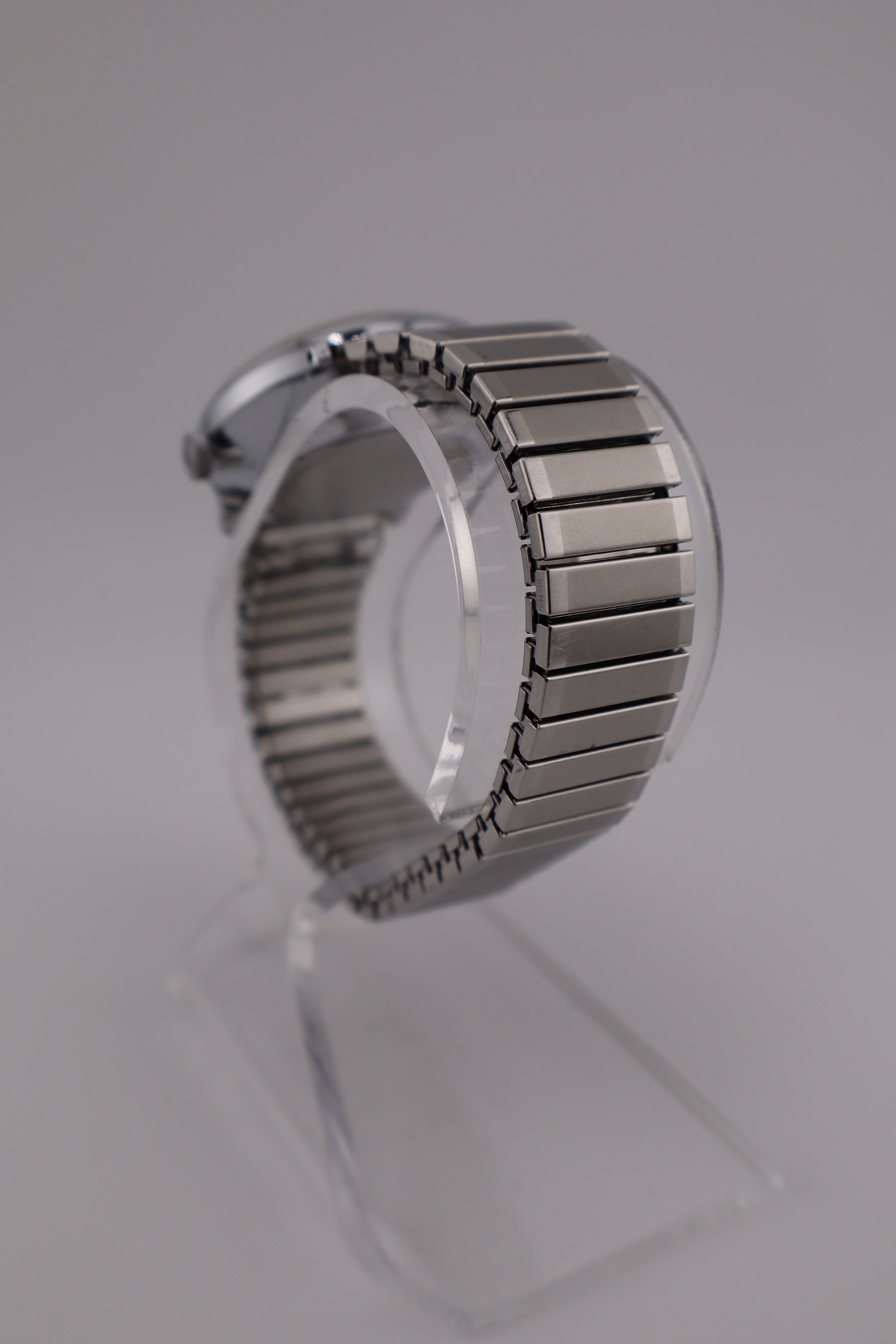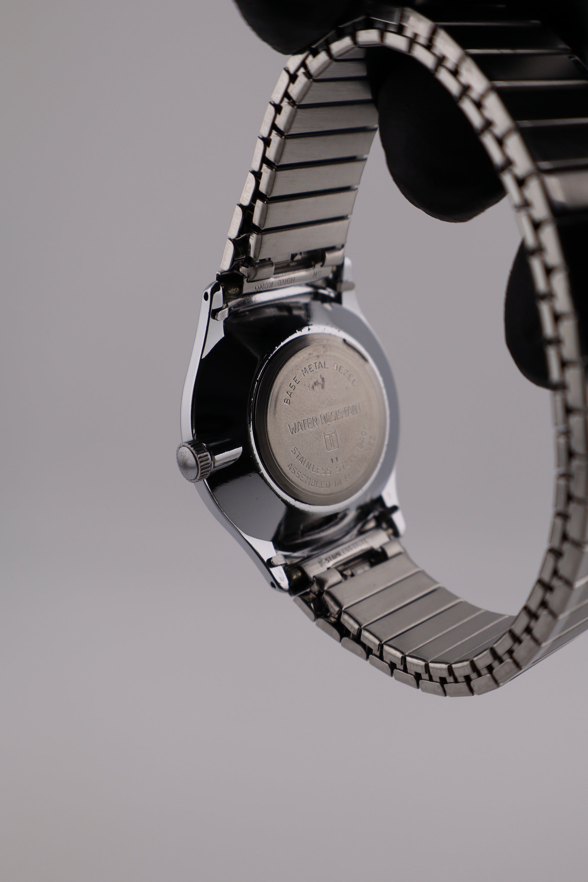 The Timex Marlin is one of the most recognizable American dress watches, admired for its reliability, simplicity, and everyday versatility. Produced throughout the 1960s–1980s, the Marlin line remains highly collectible for those seeking mechanical durability paired with mid-century charm. This vintage Timex Marlin manual winding watch presents a clean and classic aesthetic with its silver sunburst dial, black numerals, and date display at 3 o’clock. The understated design and slim profile give it a timeless, dress-ready charm that defines the Marlin line. The case and bracelet are in excellent condition, showing minimal wear and no significant scratches. The crystal is clear with only light scuffs visible under certain angles, preserving its elegant presentation. The manual wind movement winds smoothly, runs well, and holds a good charge, though long-term accuracy has not been tested.