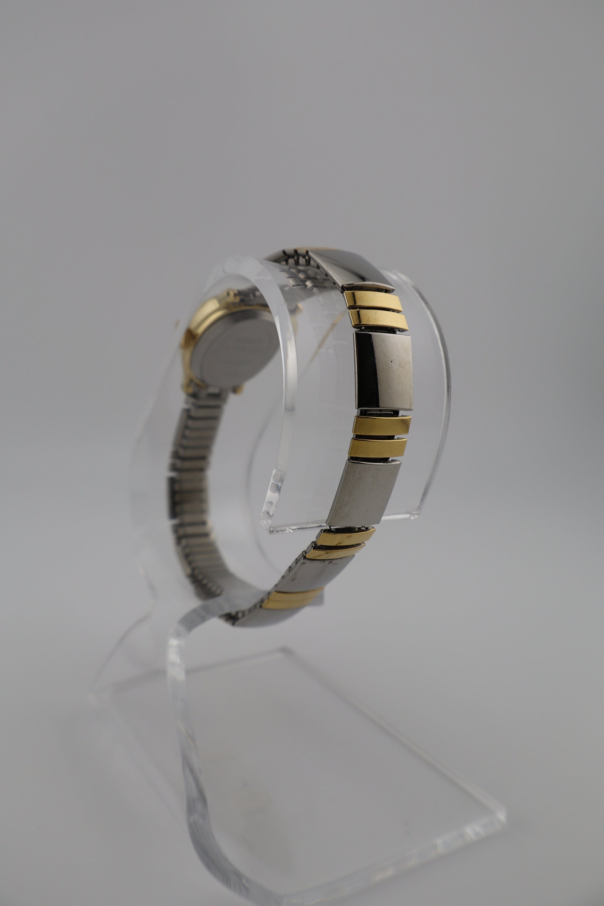 This stylish Timex women’s quartz watch features a sleek two-tone gold and silver design with a distinctive expansion band. The oval-shaped dial is clean and minimalistic, adorned with gold-tone indices and a textured pattern. The quartz movement ensures precise timekeeping, and the watch is in excellent working condition with very little wear.