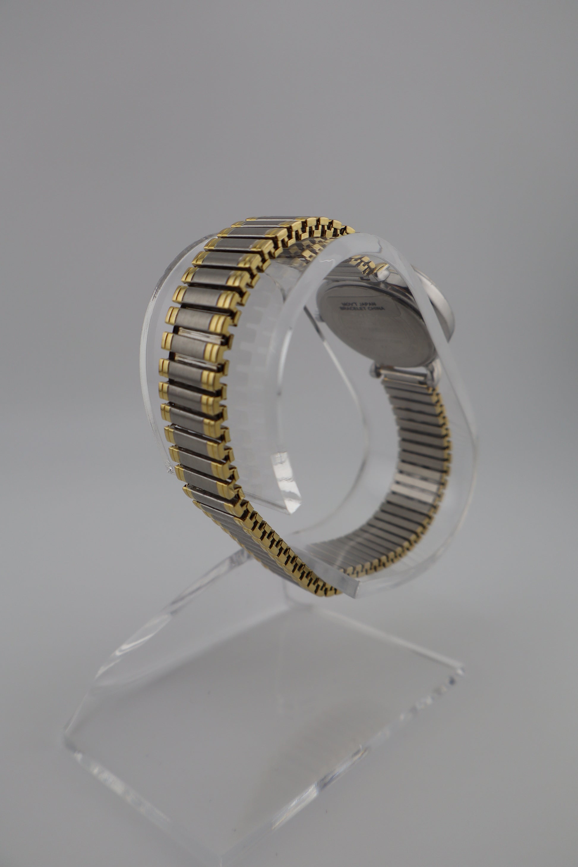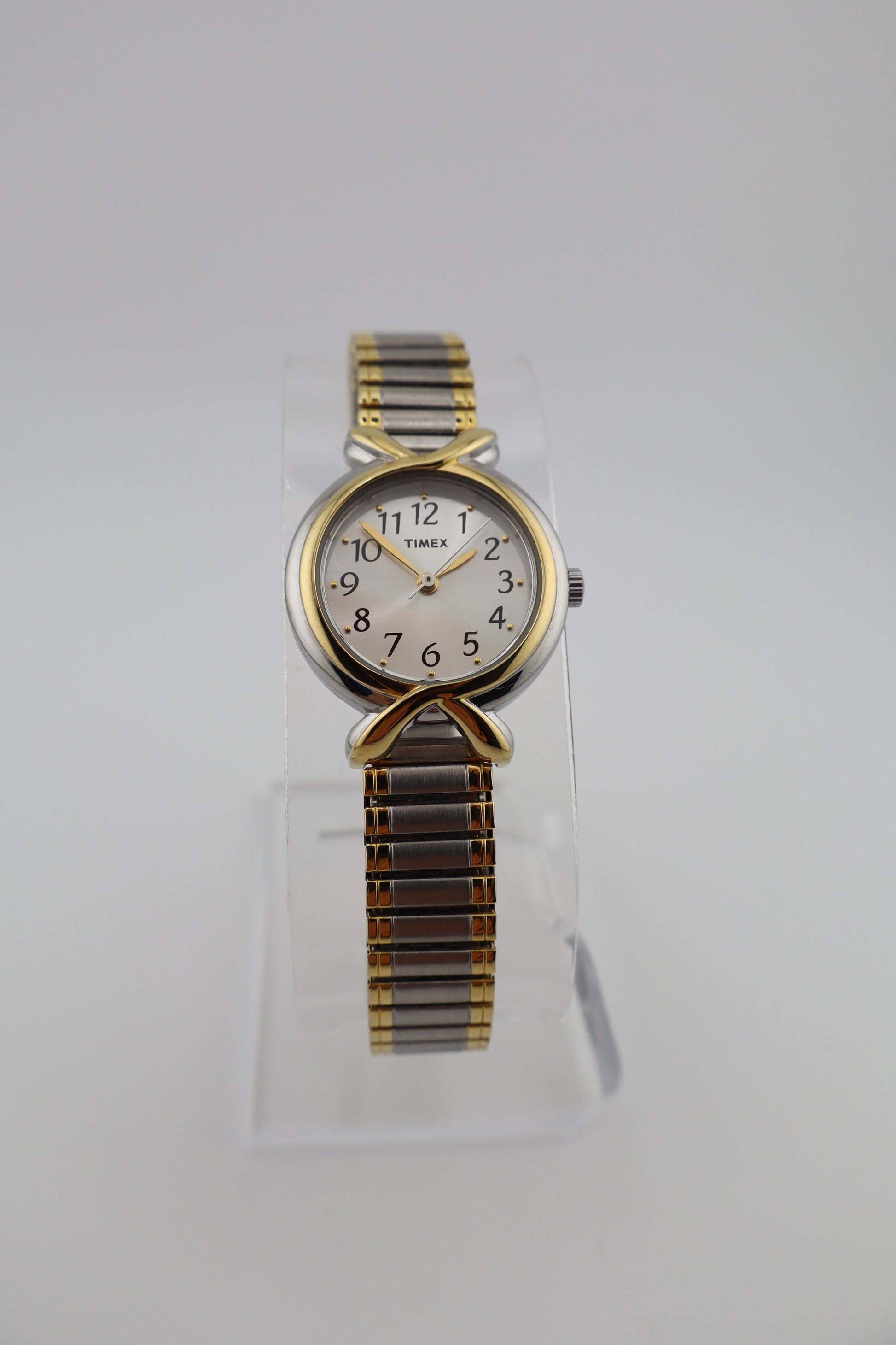 This Timex women's watch, model T21854, features a sleek silver-tone dial accented by gold-tone hands and simple, refined hour markers. The two-tone stainless steel case and matching expansion bracelet offer a sophisticated and comfortable fit, making it ideal for everyday wear. Powered by a reliable quartz movement, this timepiece ensures accurate timekeeping. The unique bracelet design adds a touch of elegance, while its fully functional condition ensures dependability. With a classic aesthetic and durable construction, this watch is a stylish addition to any collection.