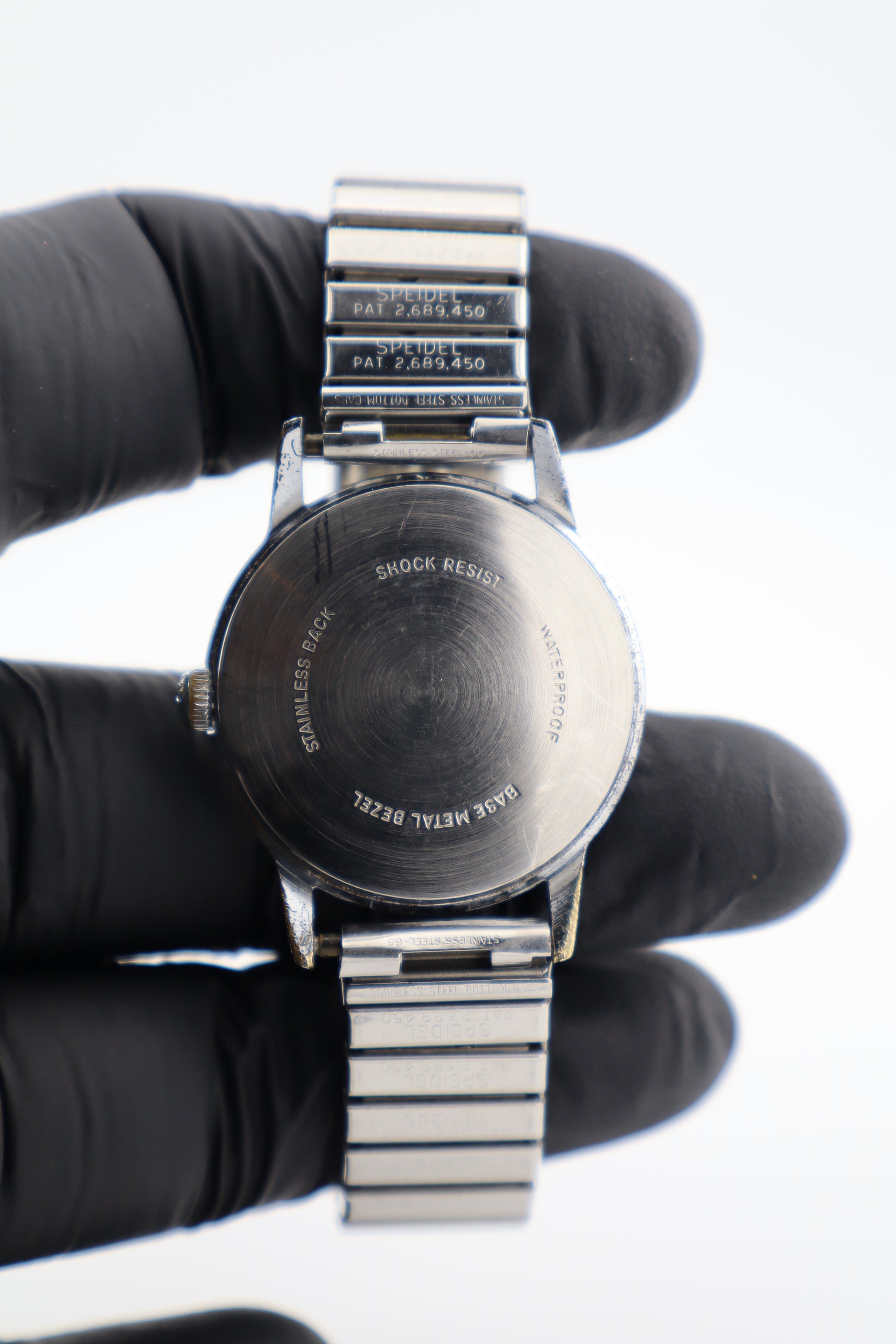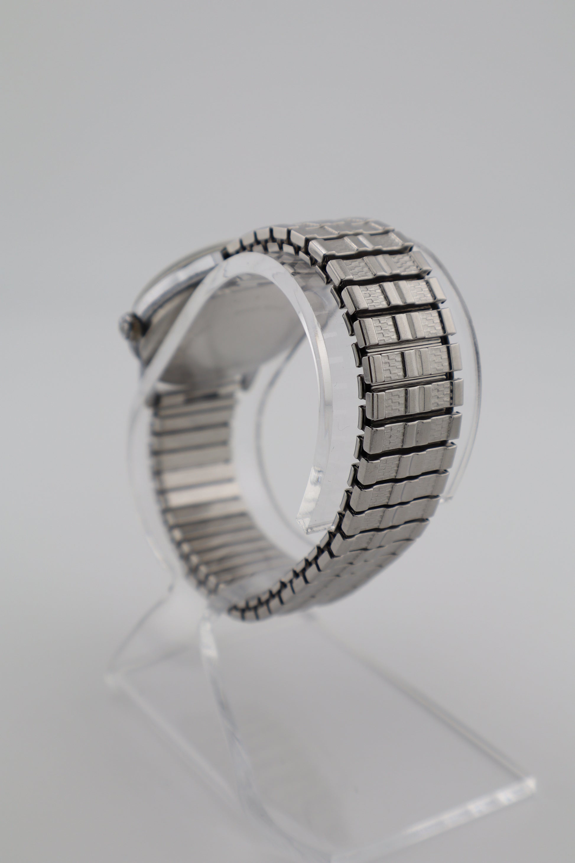 Exceptionally clean 1960s Tradition men’s manual-wind watch featuring a classy silver-tone dial with applied markers, a date window at 3, and a sharp mid-century case profile. The case, dial, and crystal present in great aesthetic condition with only minimal signs of prior wear, making this one a really crisp vintage daily-wear piece. A period-correct Flex-O-Band style stretch bracelet is fitted and complements the watch perfectly. It has been tested and is running very well, showing timegrapher results of approximately -30 seconds/day, ~270° amplitude, and 0.0 ms beat error.